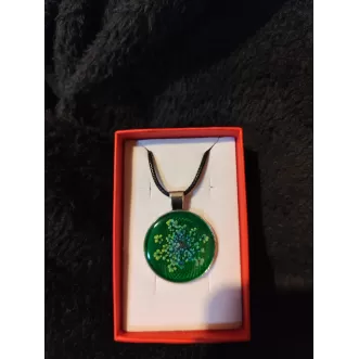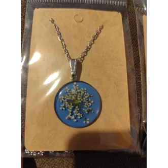 Pandantivul din otel inoxidabil lucrat manual cu flori presate .Pandantivul  conține floare naturala presată de morcov sălbatic și rășină epoxidica are dimensiunea de 25 mm.