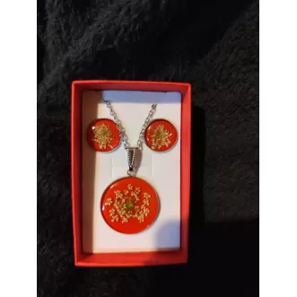 Set din otel inoxidabil lucrat manual cu flori naturale presate si rasina epoxidica. Dimensiune pandativ: 25mm Lungime lant: 50-55cm