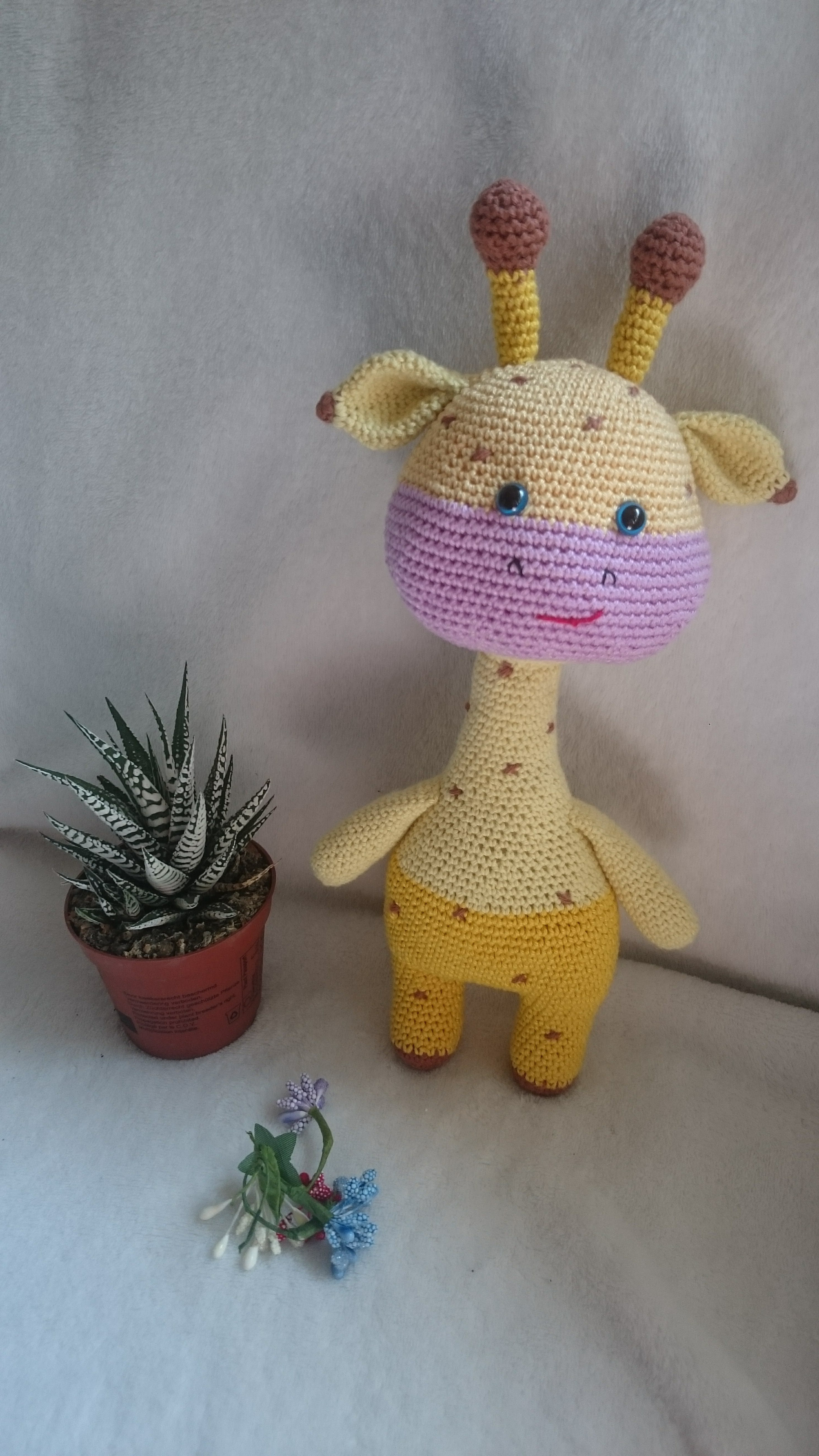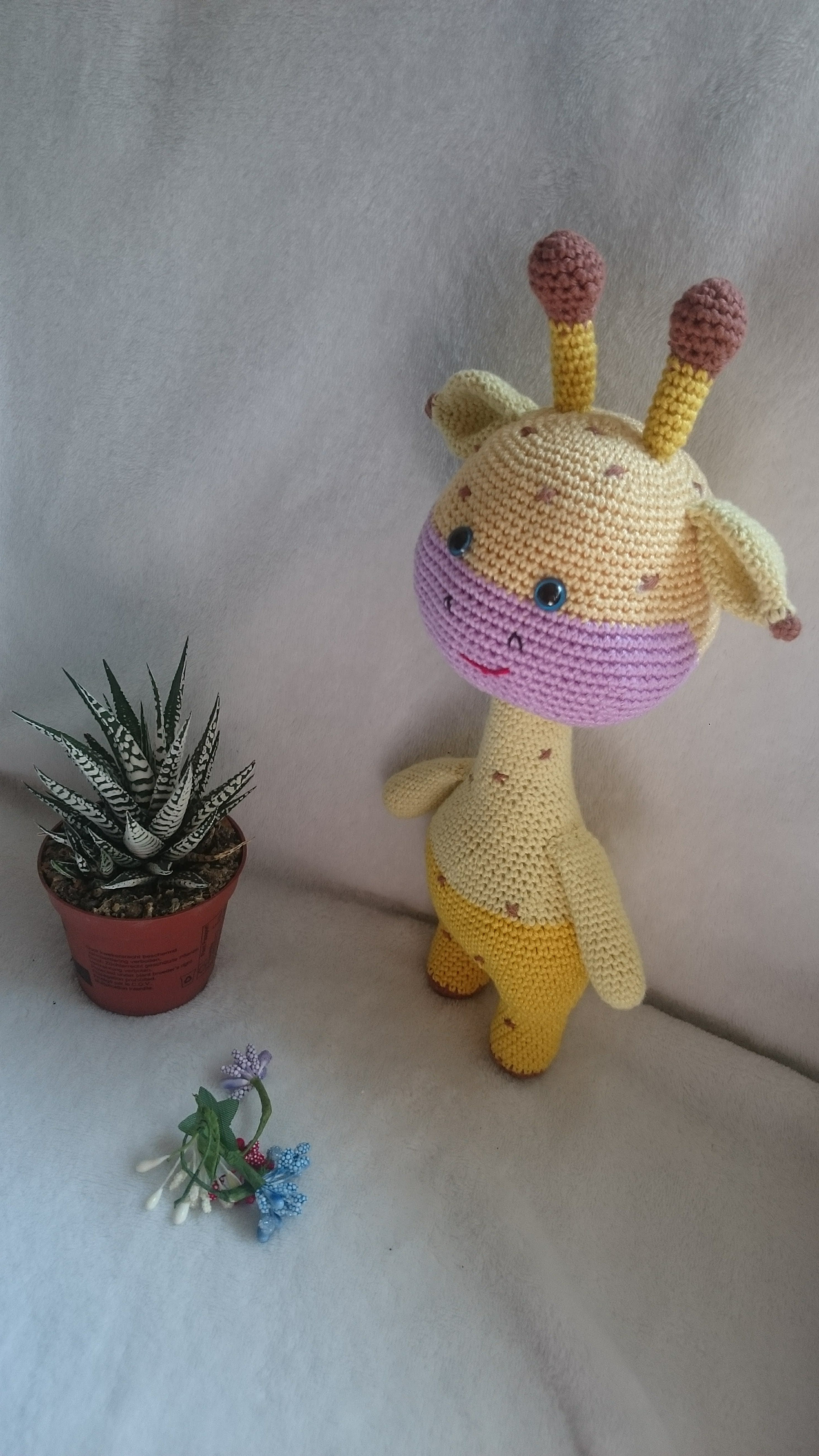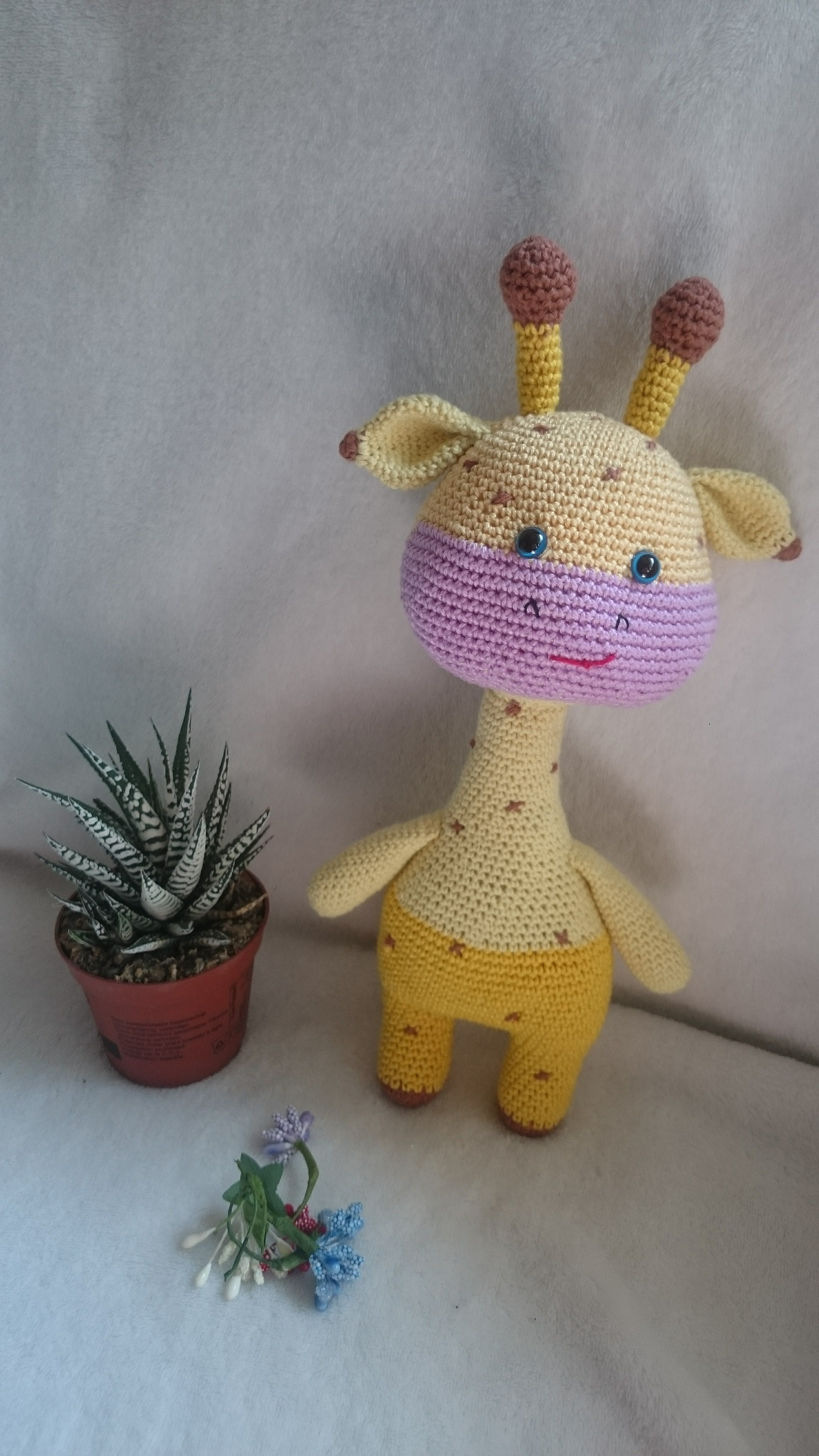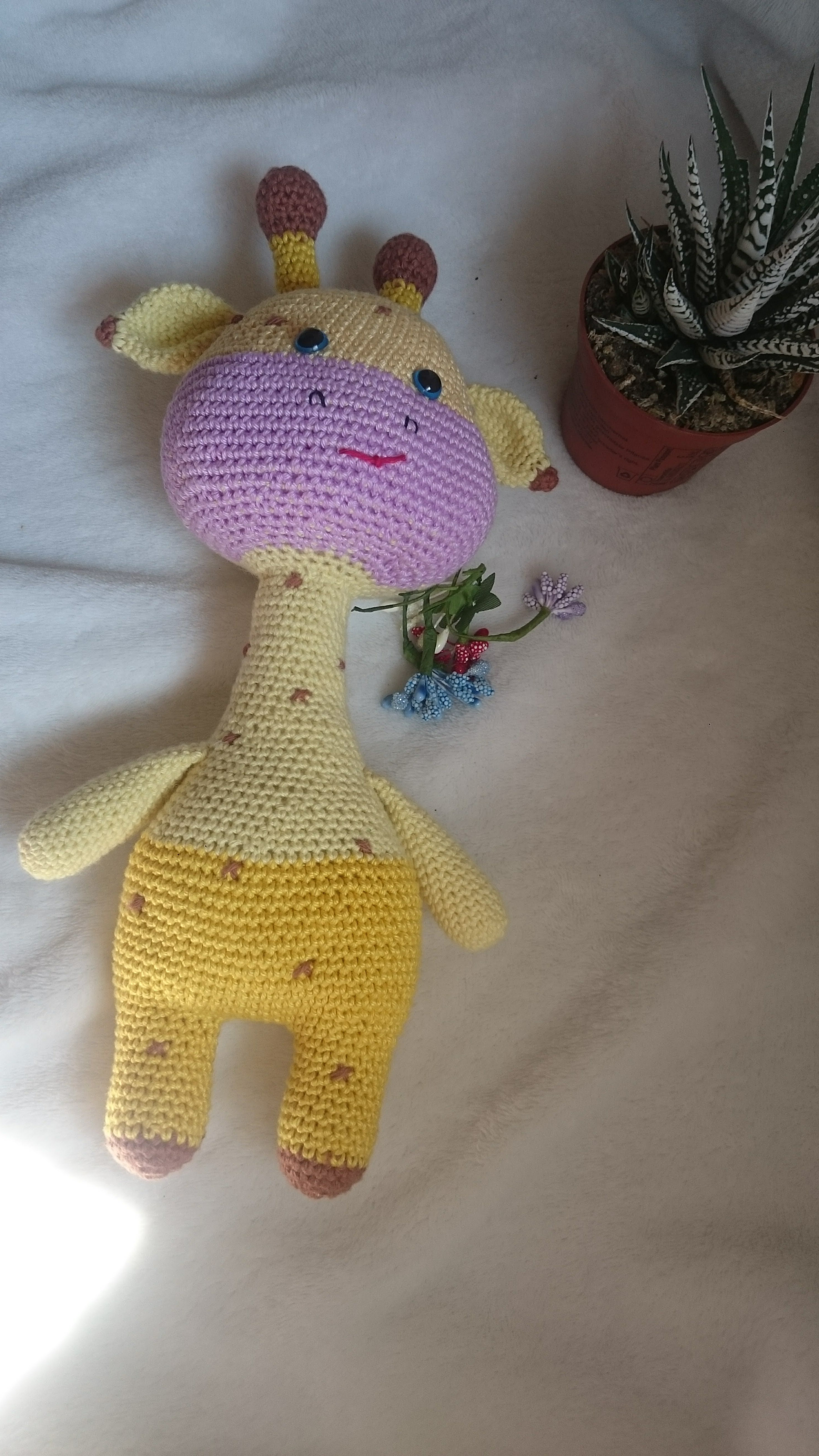 Girafa croșetată este o jucărie adorabilă, cu un corp pufos și agile, perfectă pentru îmbrățișări. Are un design jucăuș, cu pete maronii pe un fond galben strălucitor, gât lung și ochi zâmbitori care transmit căldură. Detaliile croșetate cu grijă subliniază trăsăturile sale prietenoase, făcând-o un companion ideal pentru joacă sau decor pentru camera celor mici. Această girafă este nu doar o jucărie, ci și o prietenă de nădejde!