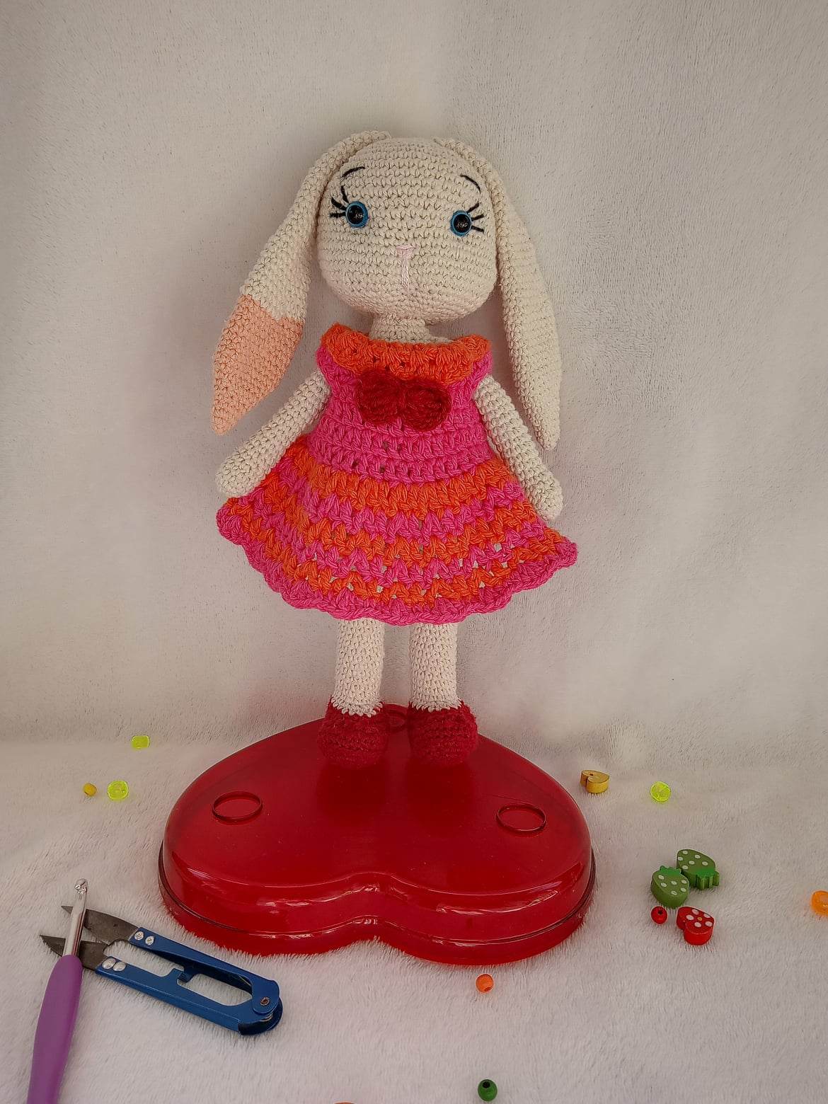 Acest adorabil iepuraș croșetat cu rochiță este companionul perfect pentru orice copil! Realizat manual din fire moi, iepurașul are urechi lungi și ochișorii bine securități, iar rochița lui colorată adaugă un strop de veselie. Fie că este folosit ca jucărie sau element decorativ, acest iepuraș va aduce bucurie și confort, devenind rapid un prieten de nădejde în aventurile celor mici. Ideal ca dar sau pentru a completa colecția de jucării!