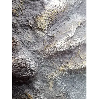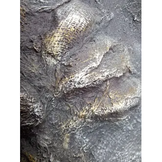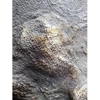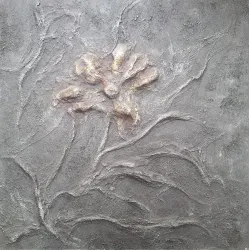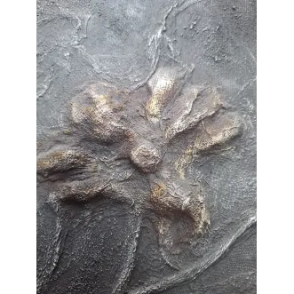Acest tablou în relief surprinde o floare născută din materie fragilă – pansament îmbibat în aracet, pastă texturată – transformată într-un simbol al vindecării tăcute. Petalele sale par mai degrabă cicatrici decât forme decorative, iar reflexiile metalice amintesc de lumină strecurată printr-o rană veche.Lucrarea vorbește despre momentele în care gesturile simple capătă un sens profund: uneori, când primești o floare, nu este un act romantic, ci un pansament. Nu pentru trup, ci pentru ceea ce nu se vede. Floarea nu ascunde rana, ci o recunoaște – și tocmai de aceea începe vindecarea.Fundalul texturat, aproape mineral, sugerează timpul,...