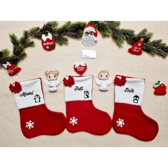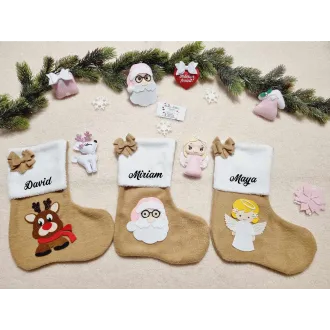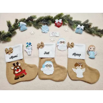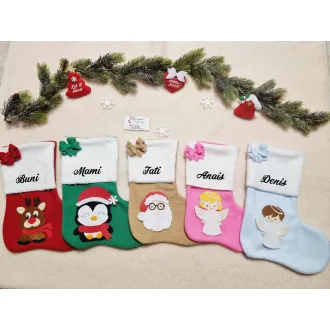 Ghetuta/ cizmultia pentru dulciuri sau mici jucarii. Se personalizeaza cu numele dorit. Pretul afisat este pe bucata. Va rugam specificati in casuta "Personalizeaza produsul"  numele dorit si figurina din cele afisate in poza (ren,inger baiat,inger fetita, mos craciun), altfel veti primii produsul simplu. Culorile pot sa difere putin in functie de setarile telefonului/ calculatorului dumneavoastra.Dimensiuni 30 x 23 cm