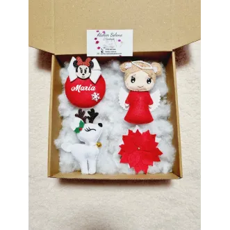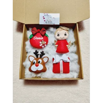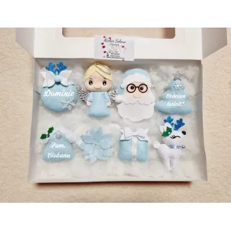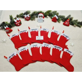 Ghetuta/ cizmultia pentru dulciuri sau mici jucarii. Se personalizeaza cu numele dorit. Pretul afisat este pe bucata. Va rugam specificati in casuta "Personalizeaza produsul"  numele dorit si figurina din cele afisate in poza (ren,inger baiat,inger fetita, mos craciun), altfel veti primii produsul simplu. Culorile pot sa difere putin in functie de setarile telefonului/ calculatorului dumneavoastra.Dimensiuni 30 x 23 cm