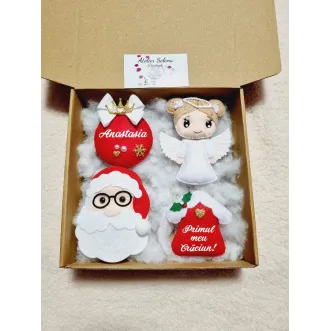 Pretul afisat este pe set. Se pot personaliza cu UN singur nume DOAR globuletele rotunde, restul textelor sunt standard.  Va rugam specificati in casuta "Personalizeaza produsul"  numele dorit,altfel veti primii produsul simplu si daca doriti o culoare anume a parului. Exp: Diana/Matei- blonda /brunet/șaten. Dimensiunea unui glob/ornament este de 9-12 cm aprox. altfel veti primii produsul simplu.  Culorile pot sa difere putin in functie de setarile telefonului/ calculatorului dumneavoastra. Pe baza de comanda, dureaza aproximativ 5-7 zile lucratoare, va rugam comandati din timp comenzile necesita timp iar in perioada...