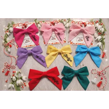 Clama de păr tip aligator/elastic, confecționată din bumbac, lucrata manual. ATENTIE! Specificati daca doriti clama aligator sau elastic de par in rubrica "Personalizeaza produsul" Inclus in pret este doar UN nume, pentru a pune nume pe ambele parti pretul se modifica, va rugam sa ne contactati inainte sa plasati comanda daca doriti 2 nume pe aceasi fundita, Pentru ca se apropie cu pași repezi perioada Mărțișorului, aceste accesorii vin ambalate individual cu cartonaș și fir de mărțișor la cerere.  Culorile pot varia usor in functie de lumina telefonului dvs