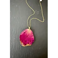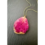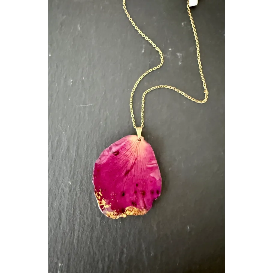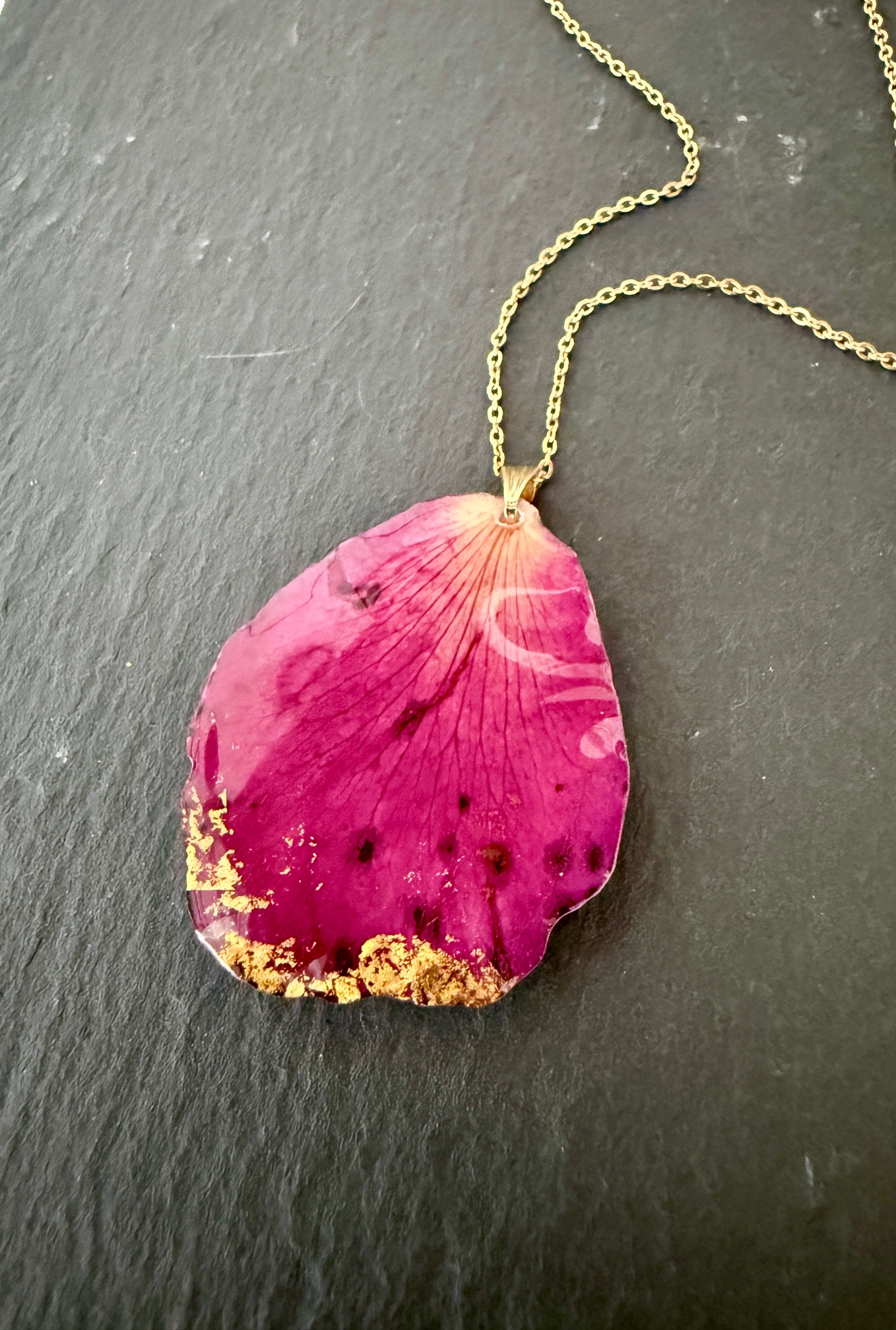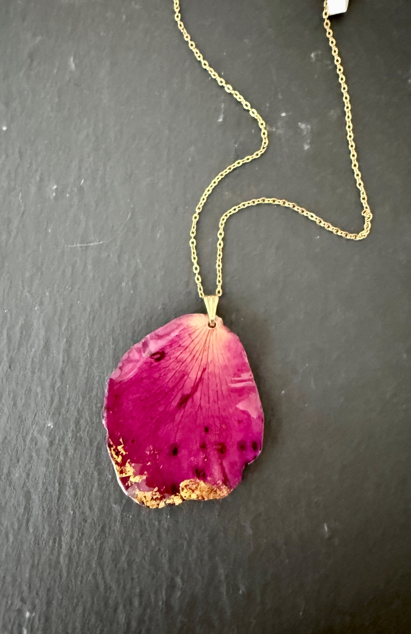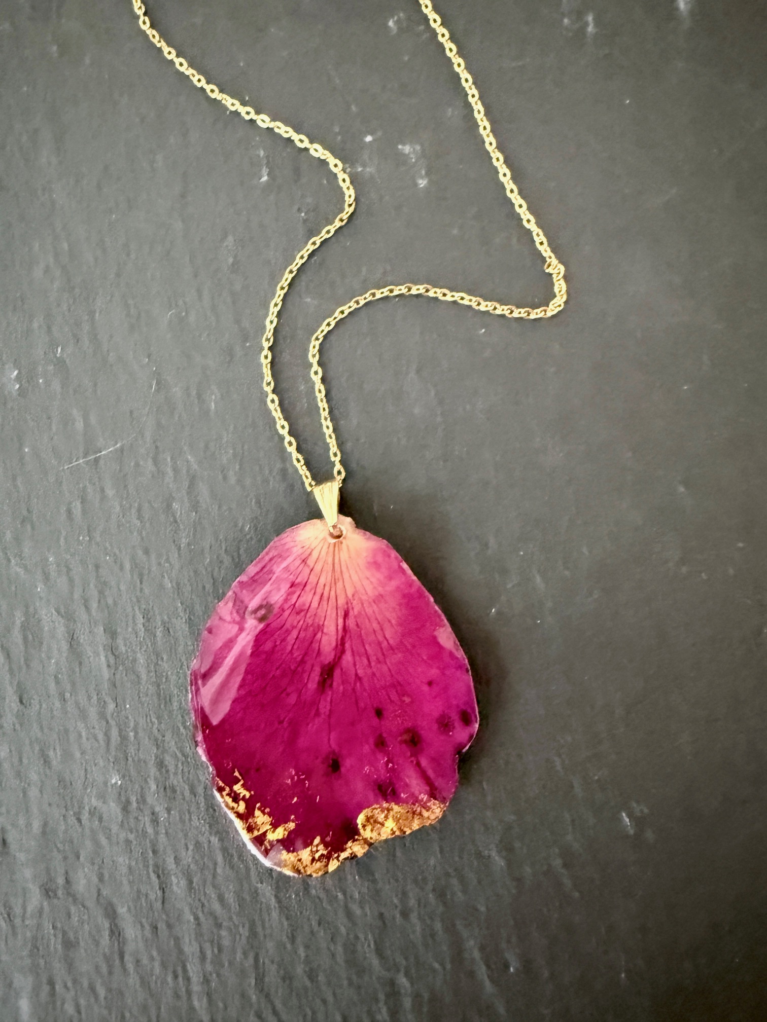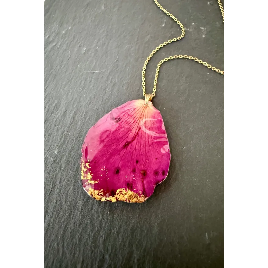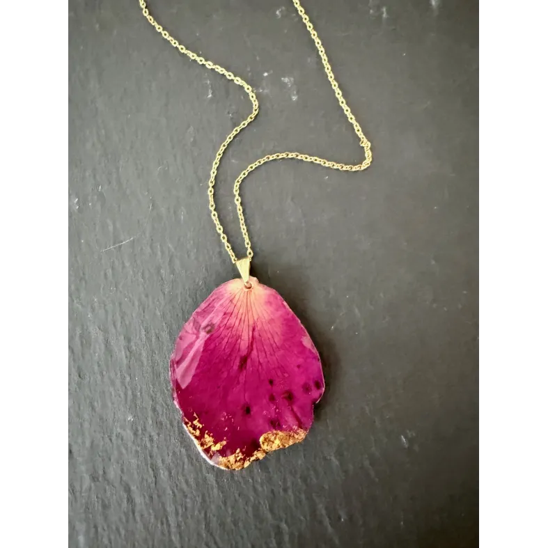 Realizat din petala de trandafir naturala, imbracata in rasina uv si cu accesorii din otel inoxidabil auriu.