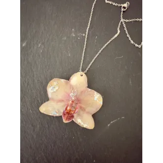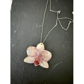 Pandantivul conține orhidee reala imbracata in mai multe straturi de rasina uv si accesorii din otel inoxidabil. Presate cu grijă, pentru un accesoriu delicat și unic. Fiecare bijuterie este realizată manual, din materiale atent selectate. Ne dedicăm să oferim calitate premium și design deosebit, pentru ca tu să porți natură, culoare și autenticitate în fiecare zi. Tip produs: Lucrat manual Materiale: accesorii otel inoxidabil, floare naturala, rasina uv Dimensiuni: lant: 40 cm Pandantiv : 3.5-4 cm