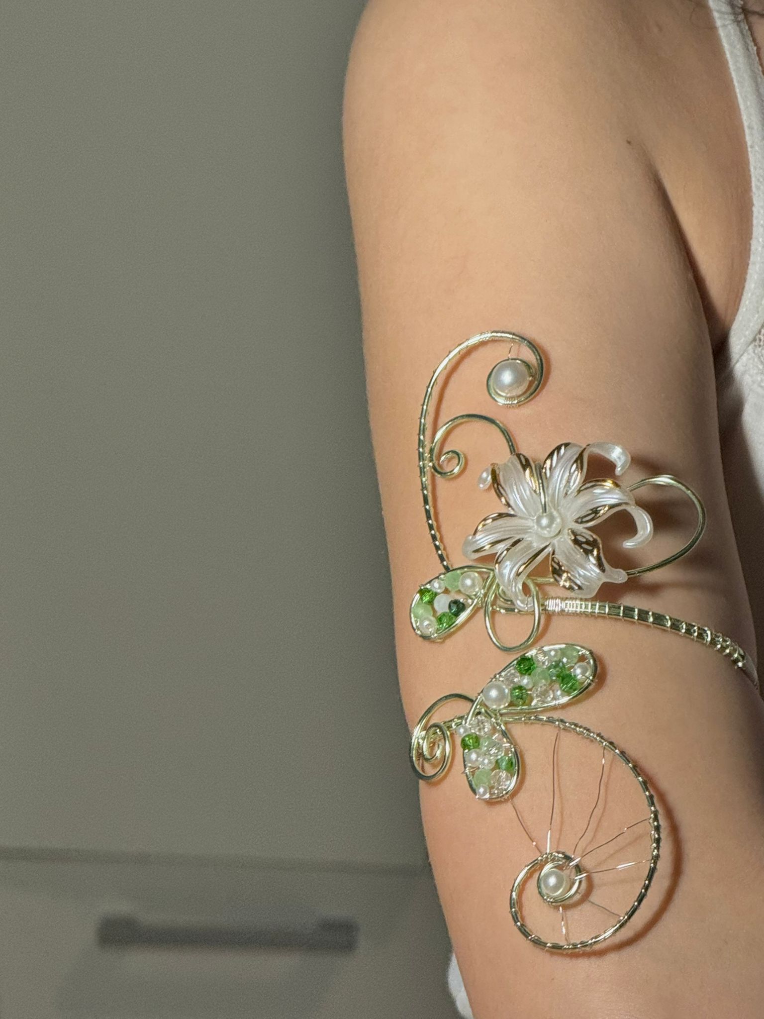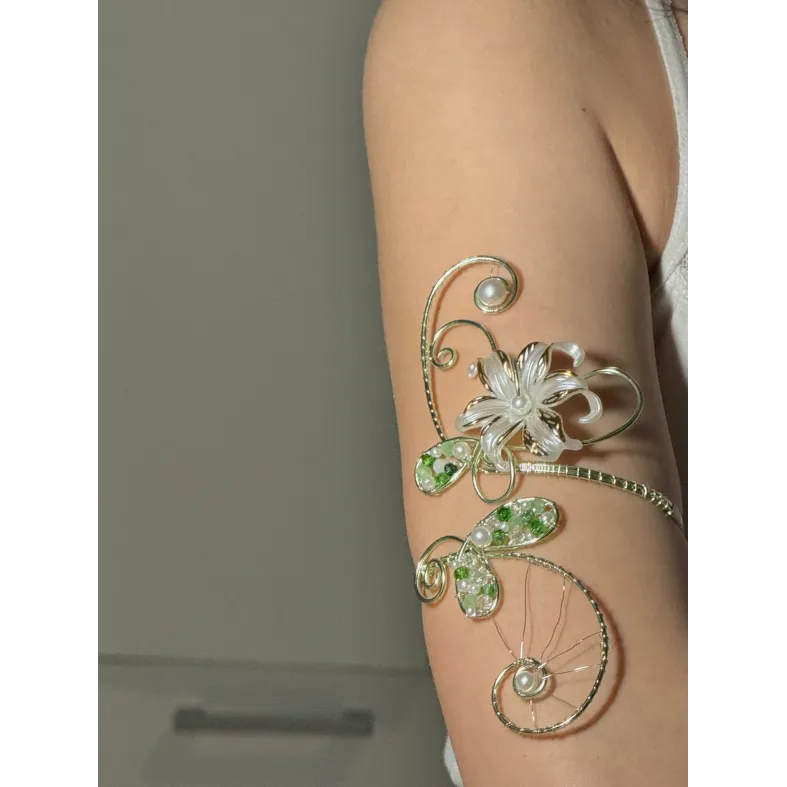 Îmbrățișează spiritul naturii cu brățara de braț Emerald Muse, o piesă statement creată pentru a aduce un strop de magie ținutelor tale. Designul fluid, care imită împletirea viței-de-vie, transformă această bijuterie într-o adevărată armură feminină, plină de simbolism și rafinament.