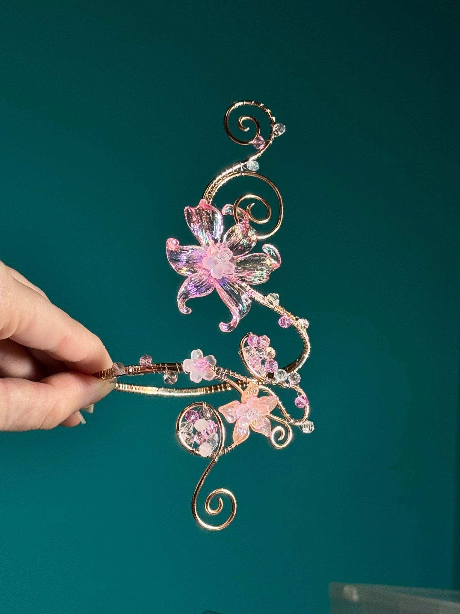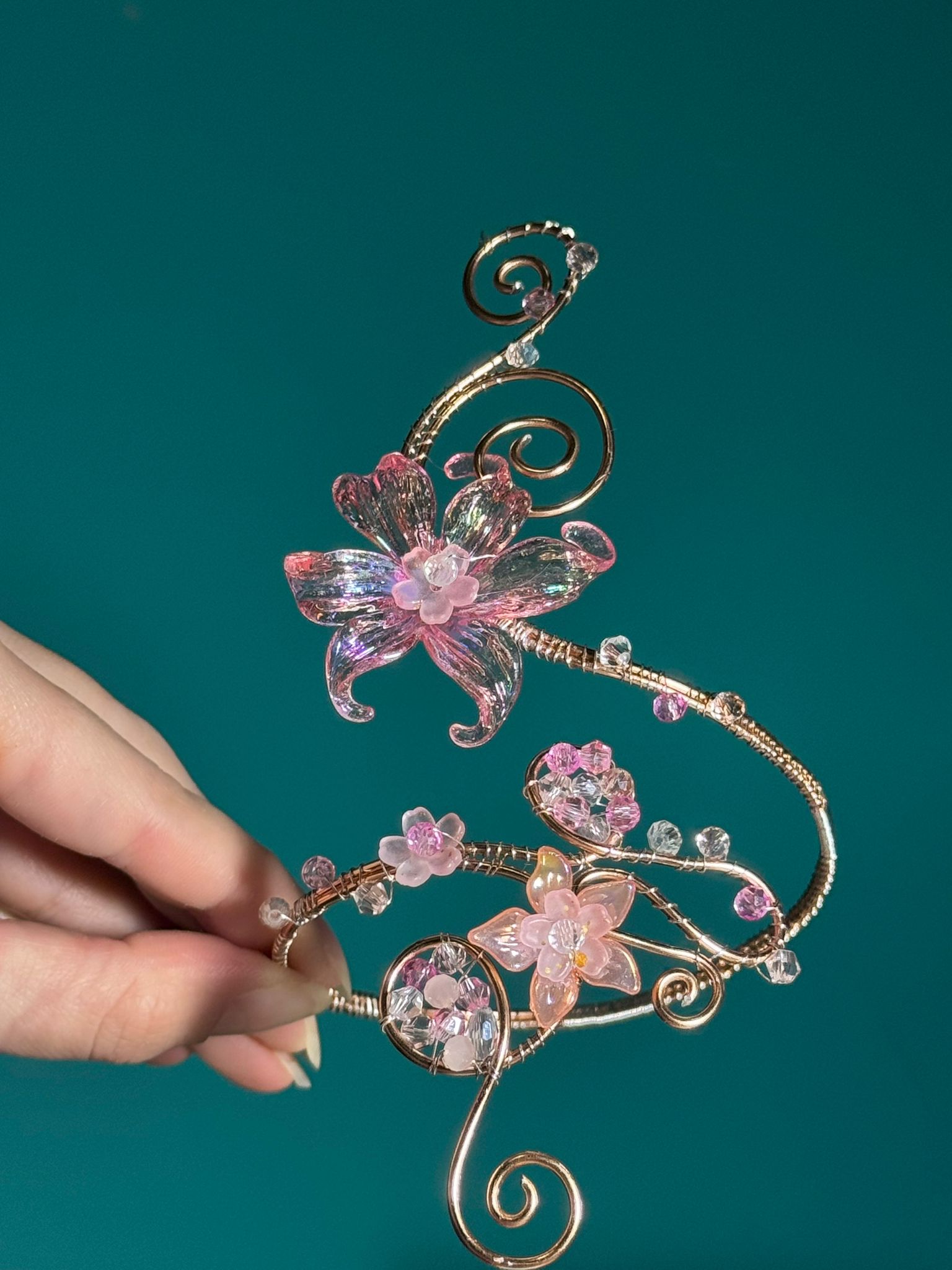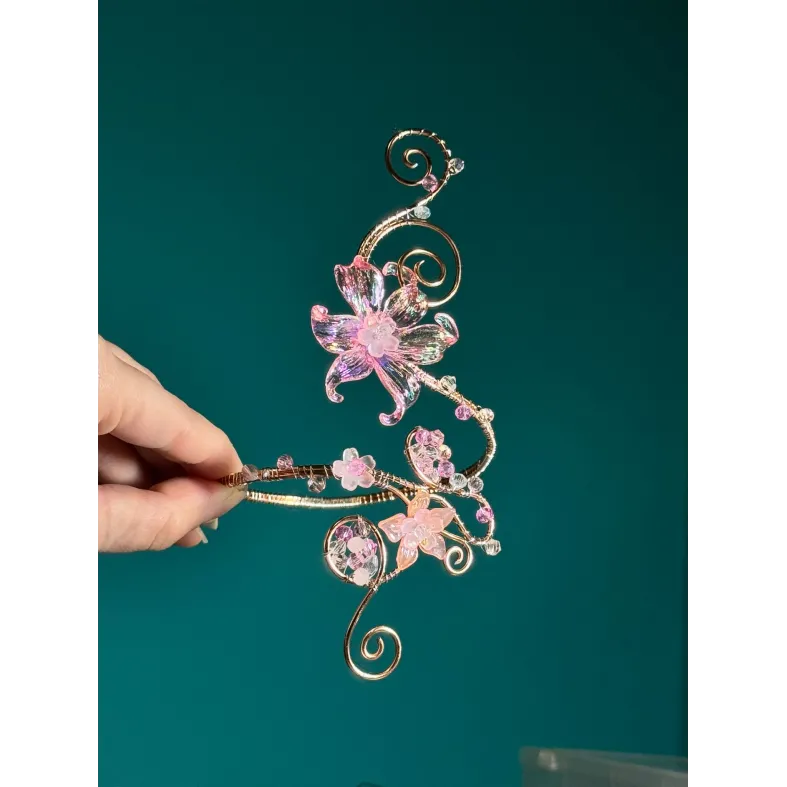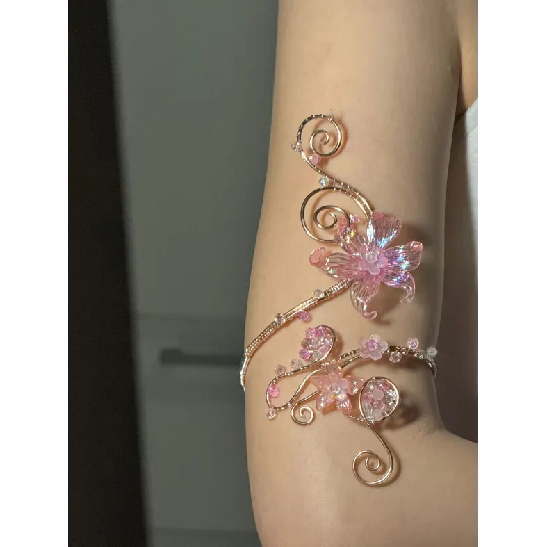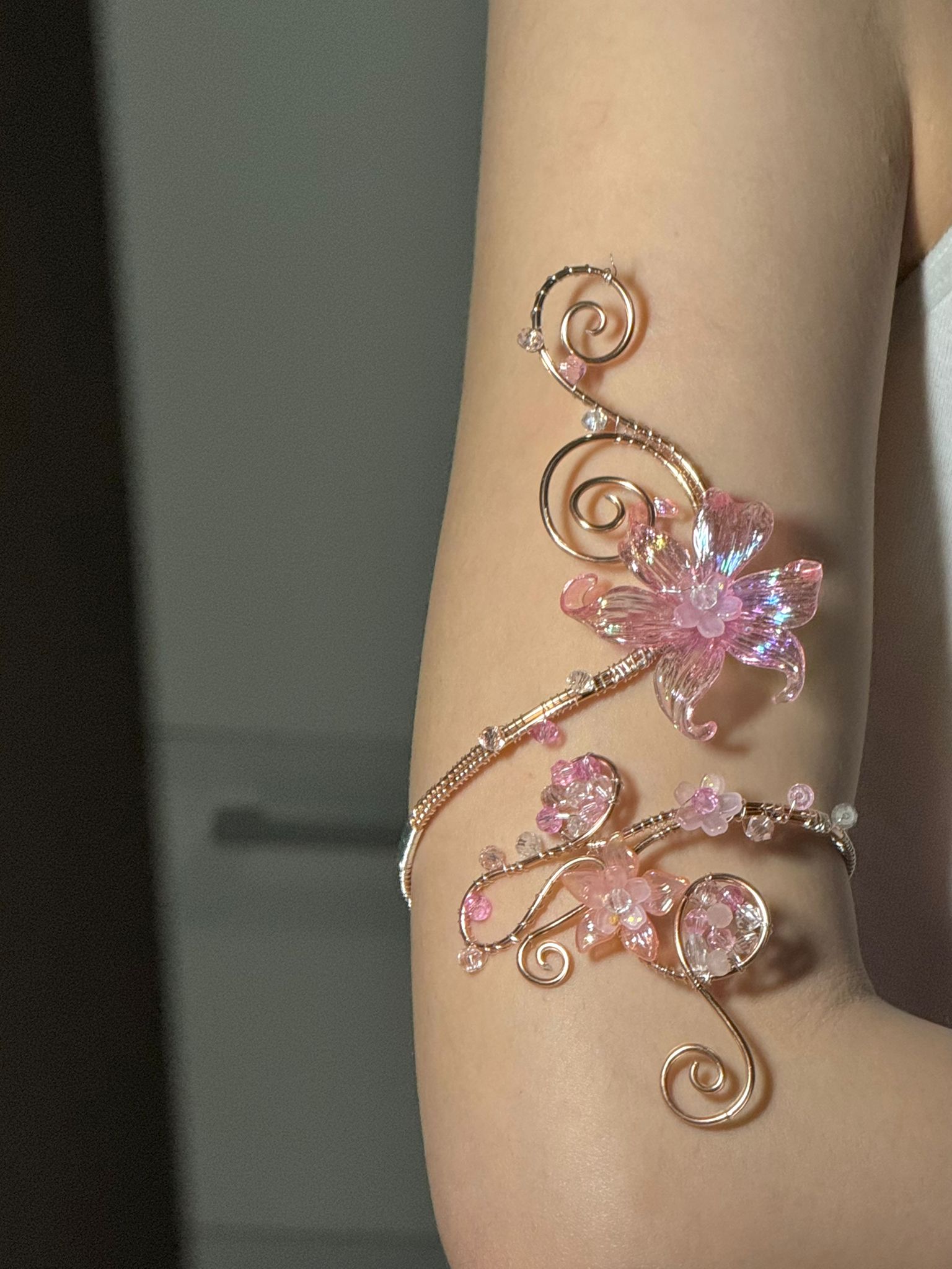 Imbrățișează eleganța unei zâne moderne cu această brățară statement pentru braț. Realizată manual prin tehnici meticuloase de modelare a sârmei, piesa este concepută pentru a se înfășura armonios în jurul brațului, creând efectul unei clematite prețioase care a înflorit direct pe mana ta.