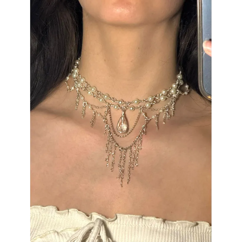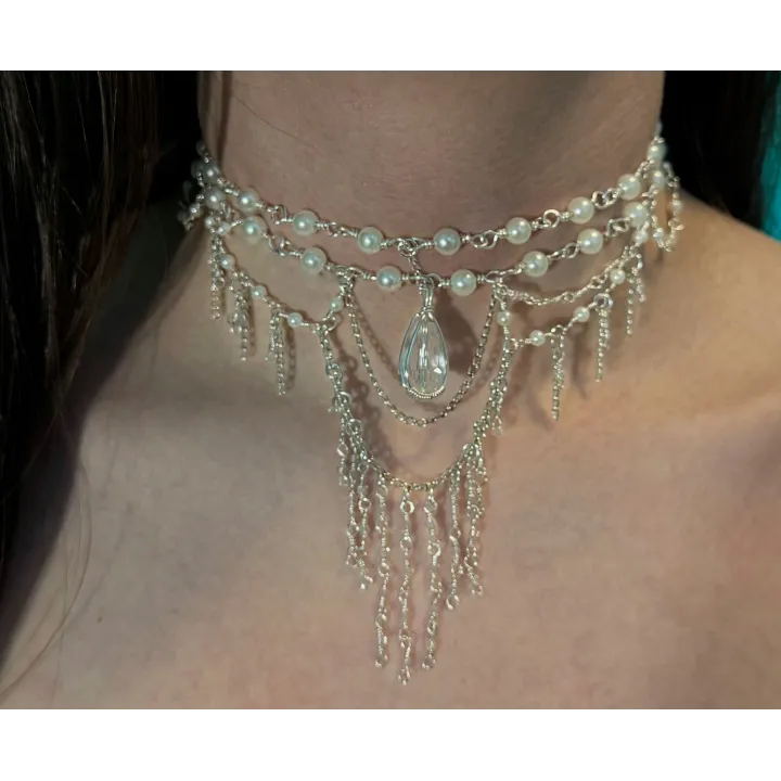 Redescoperă farmecul bijuteriilor clasice cu colierul Luminous Pearl, o piesă statement care emană grație și distincție. Creat manual pentru a pune în valoare decolteul, acest colier îmbină strălucirea argintului cu textura satinată a perlelor, totul culminând cu sclipirea spectaculoasă a unui cristal central.