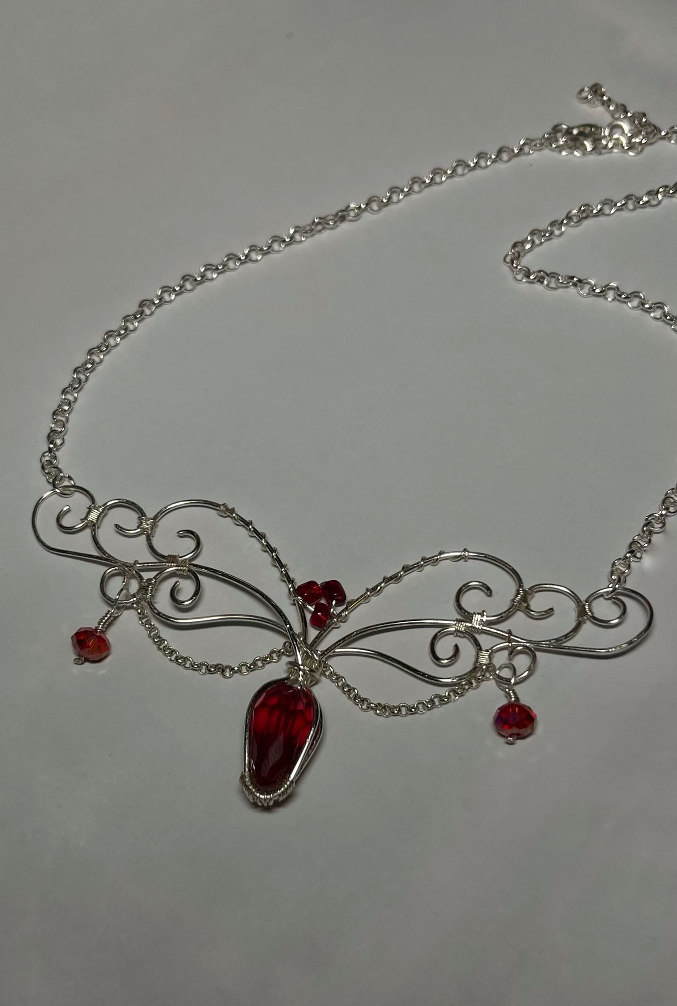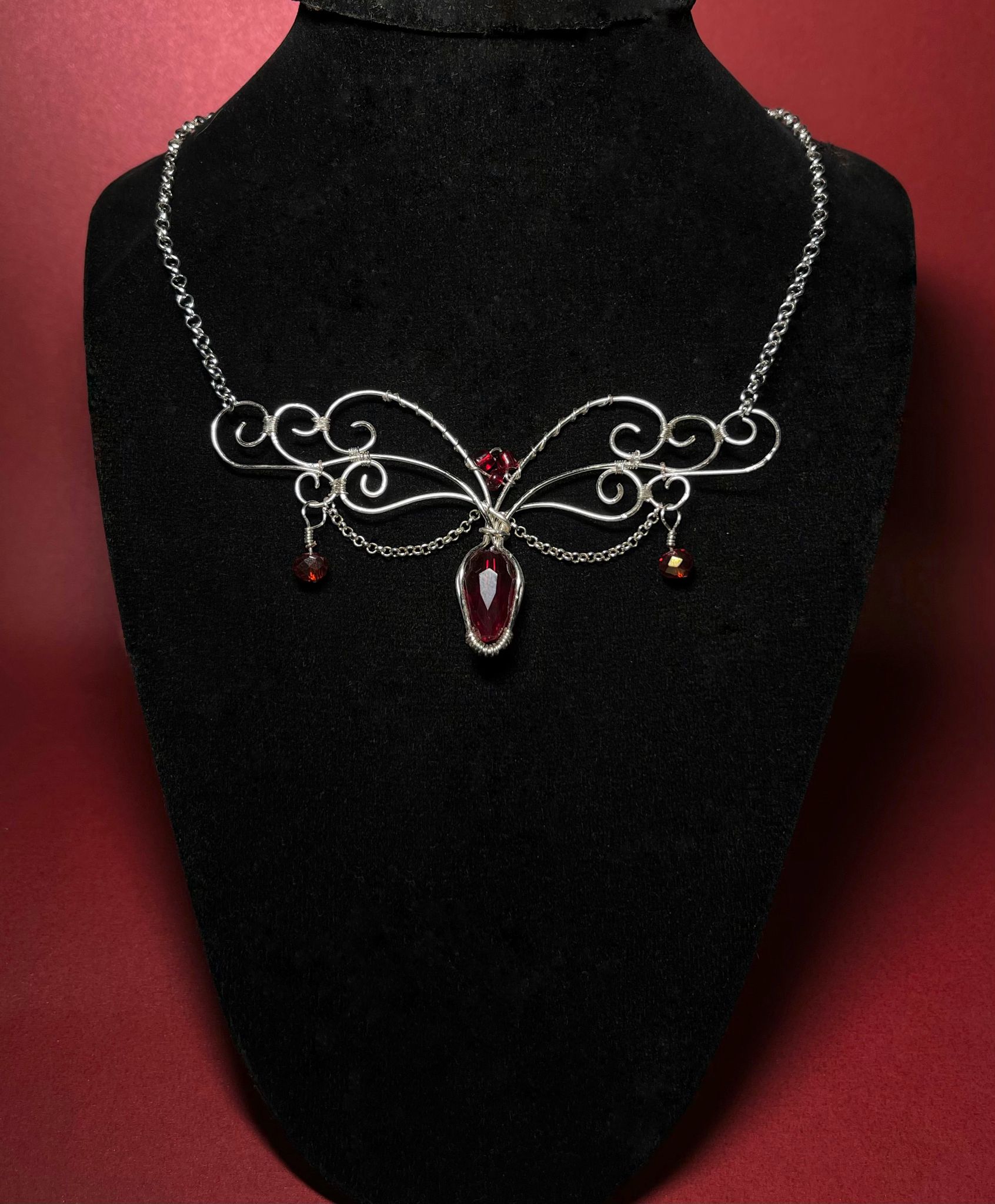 Contrast Puternic: Luciul rece al argintului subliniază intensitatea cristalelor roșu-burgundy, creând un punct focal spectaculos pentru orice ținută.