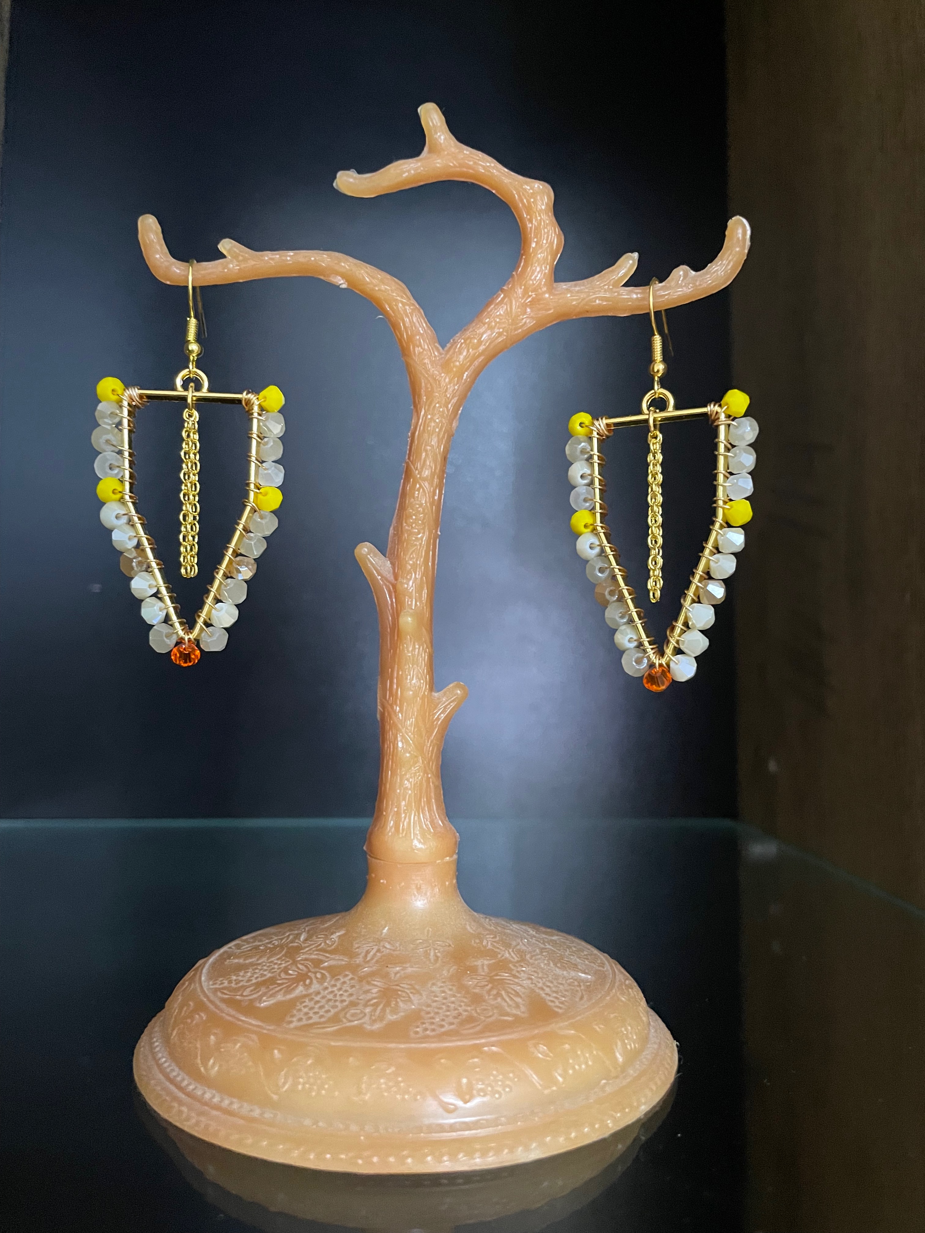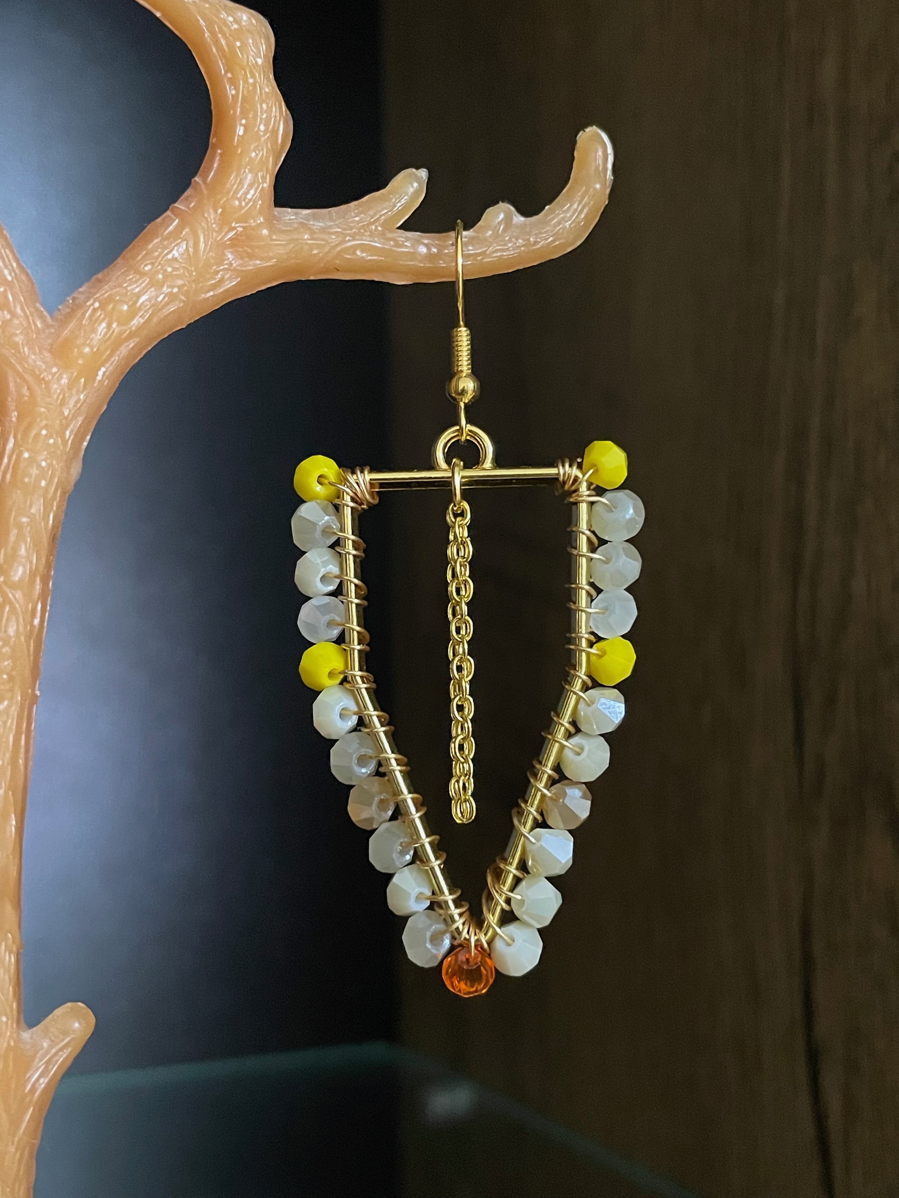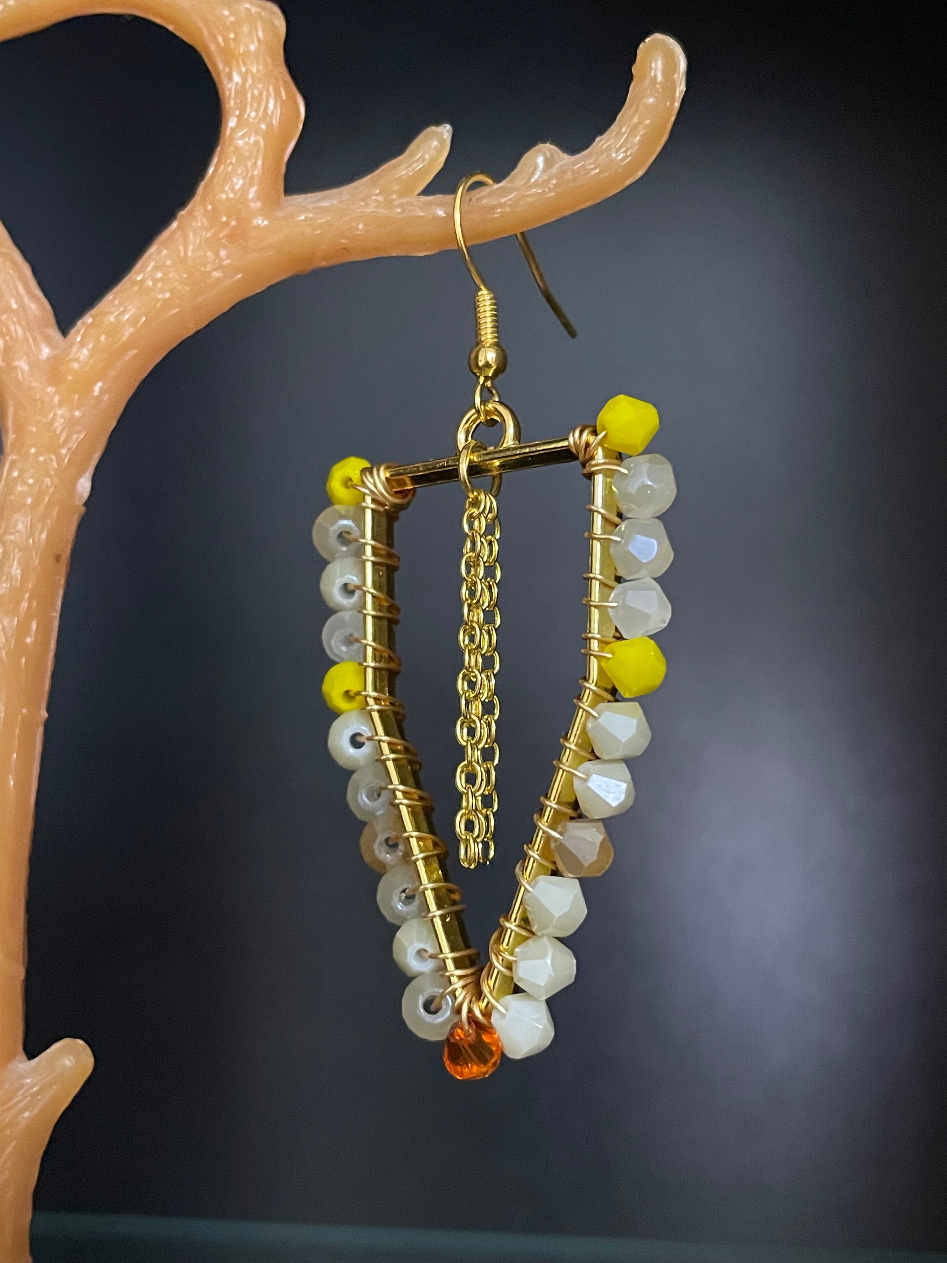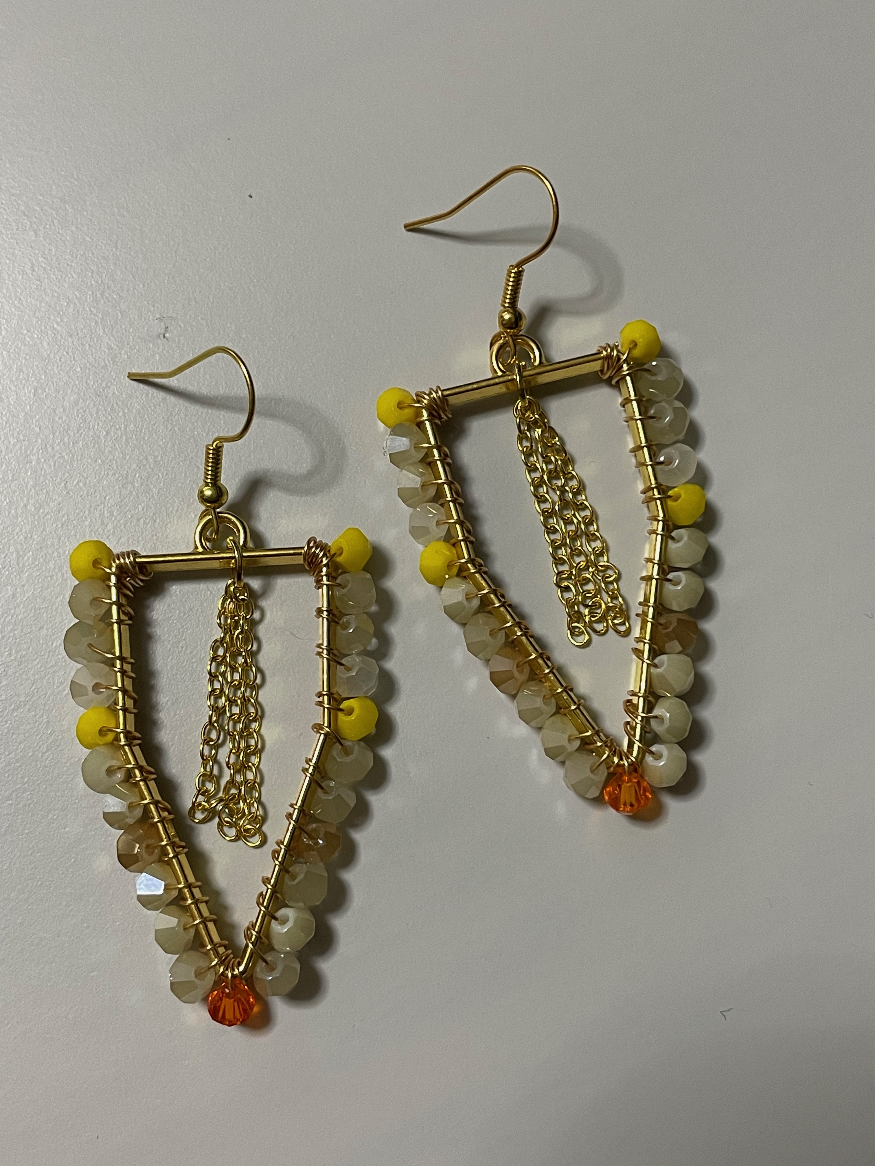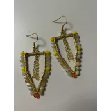 Cercei in forma triunghiulara, realizati din margele fatetate bej cu accente galbene si portocalii, completate de un detaliu central din lant auriu.