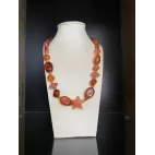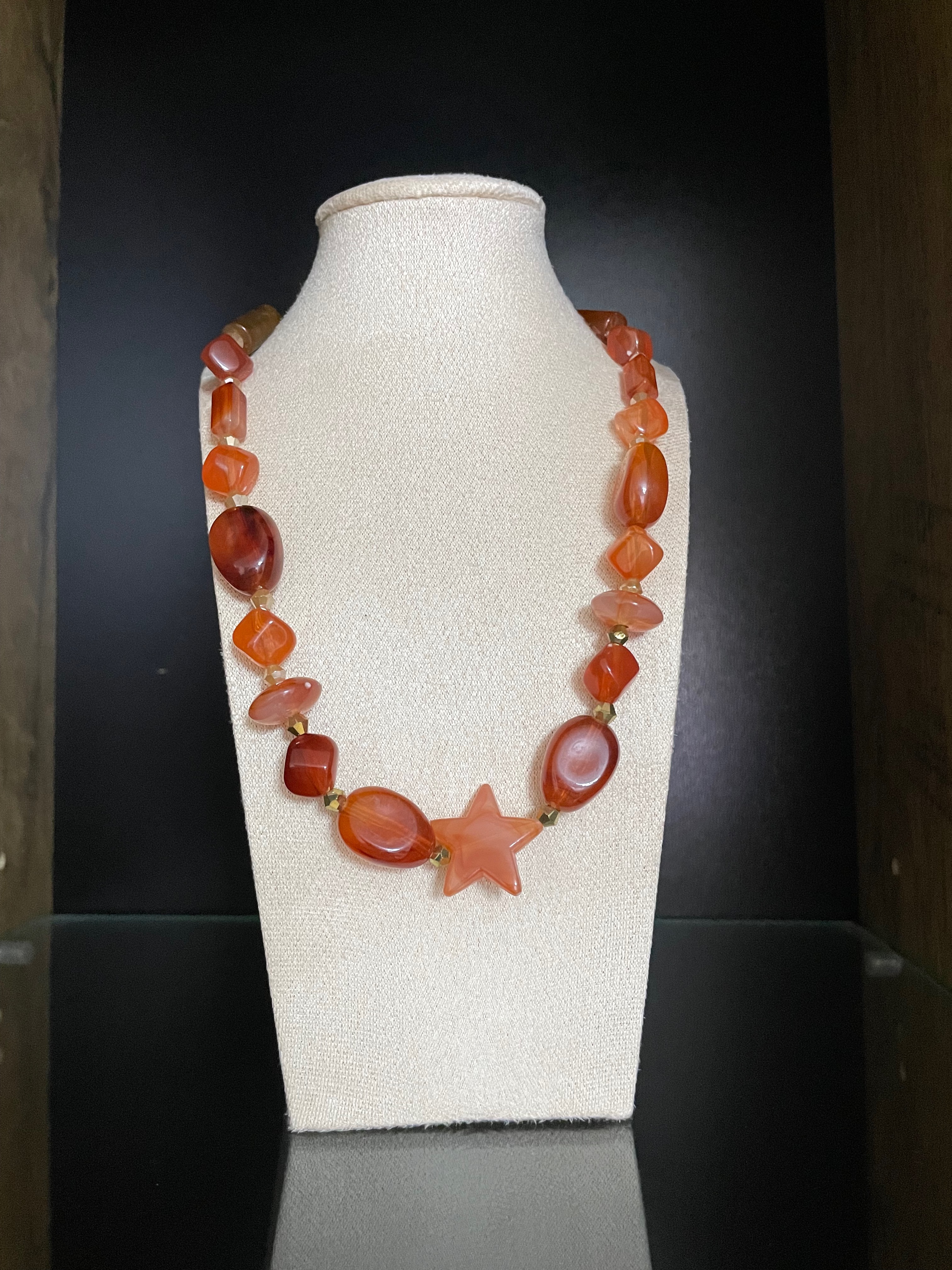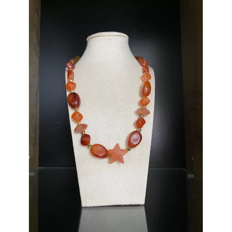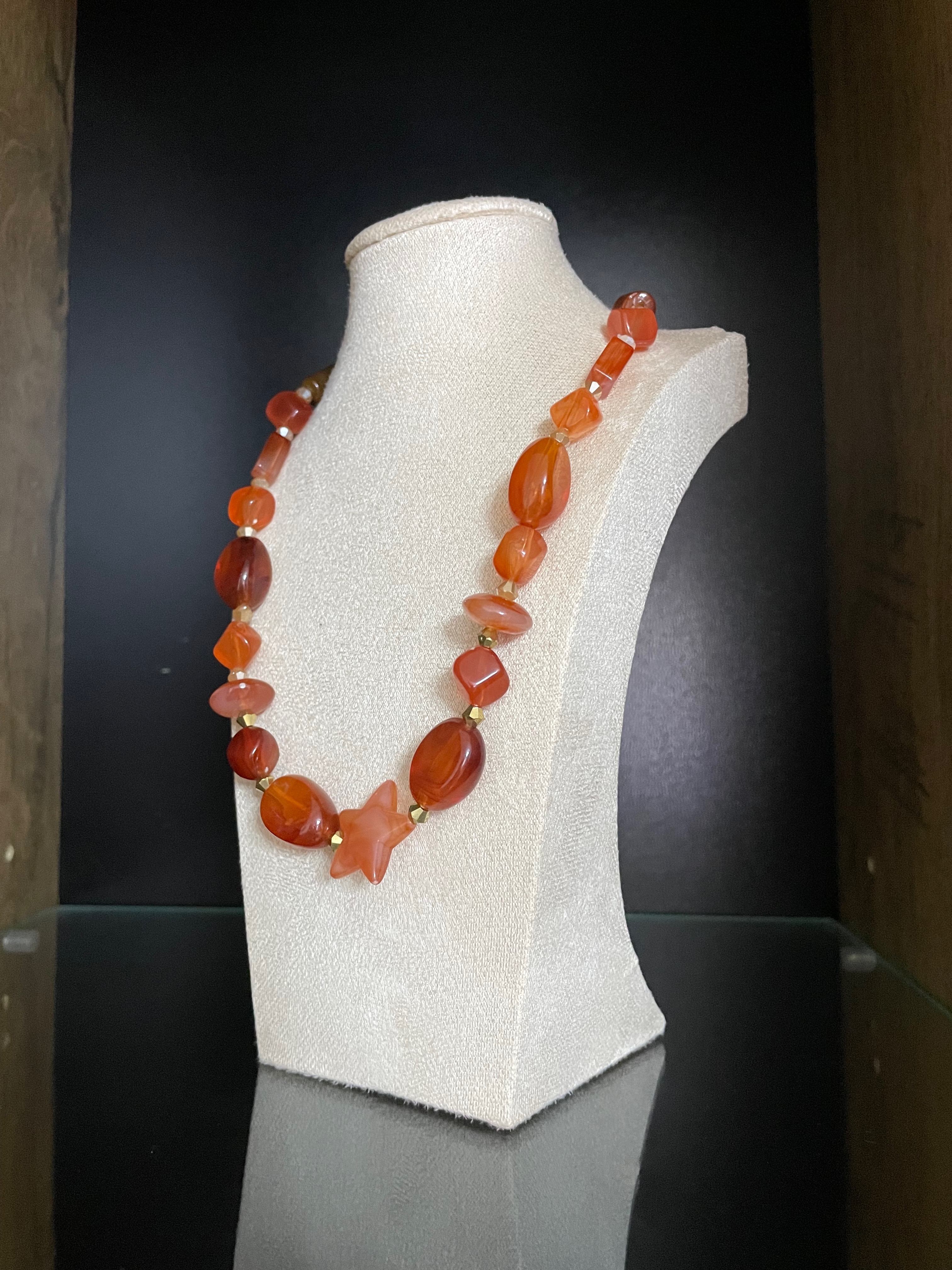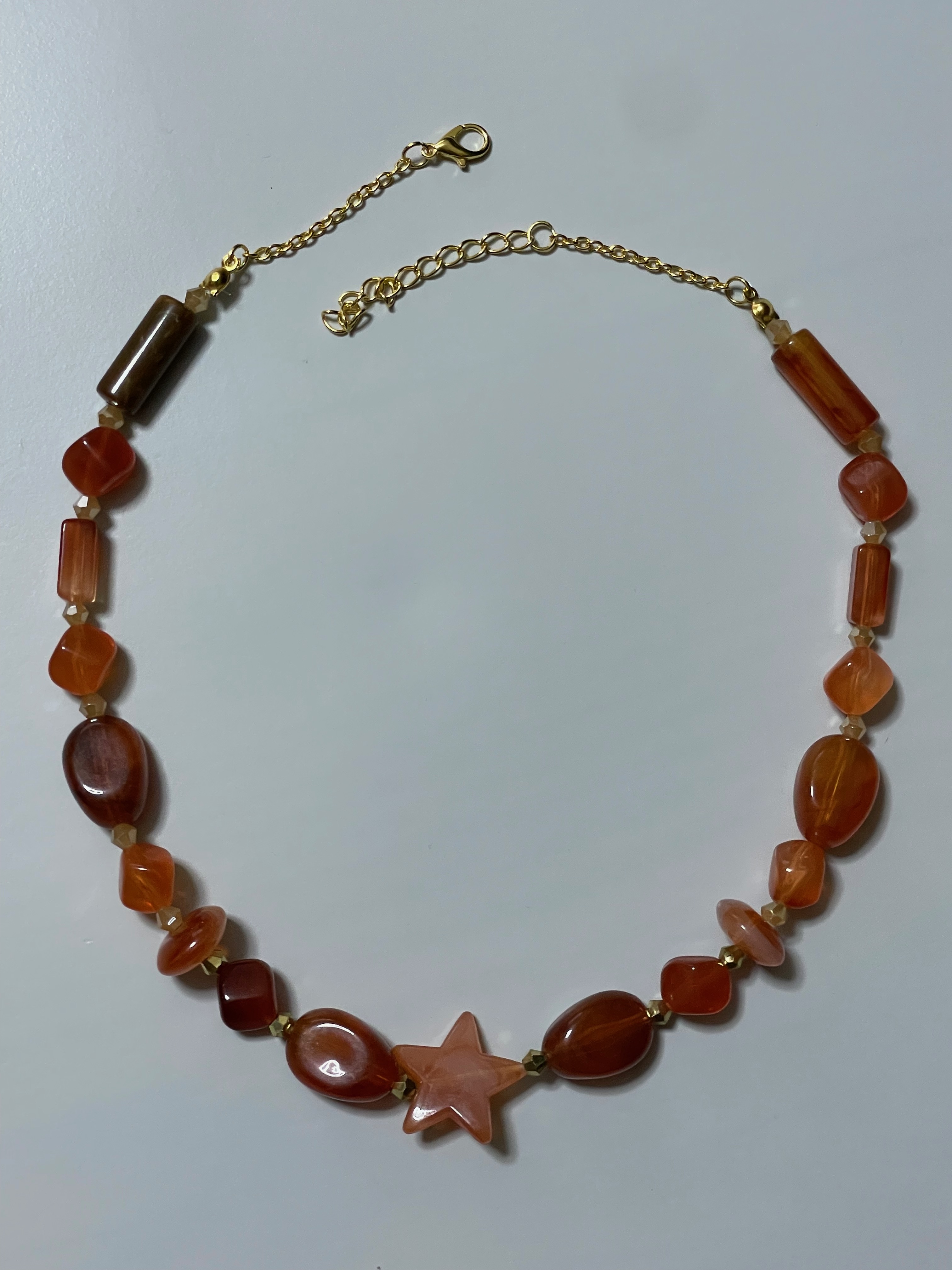 Colier elegant realizat manual, compus dintr-o selectie de pietre asimetrice in nuante de chihlimbar, conectate prin elemente discrete aurii, avand un element central in forma de stea.