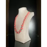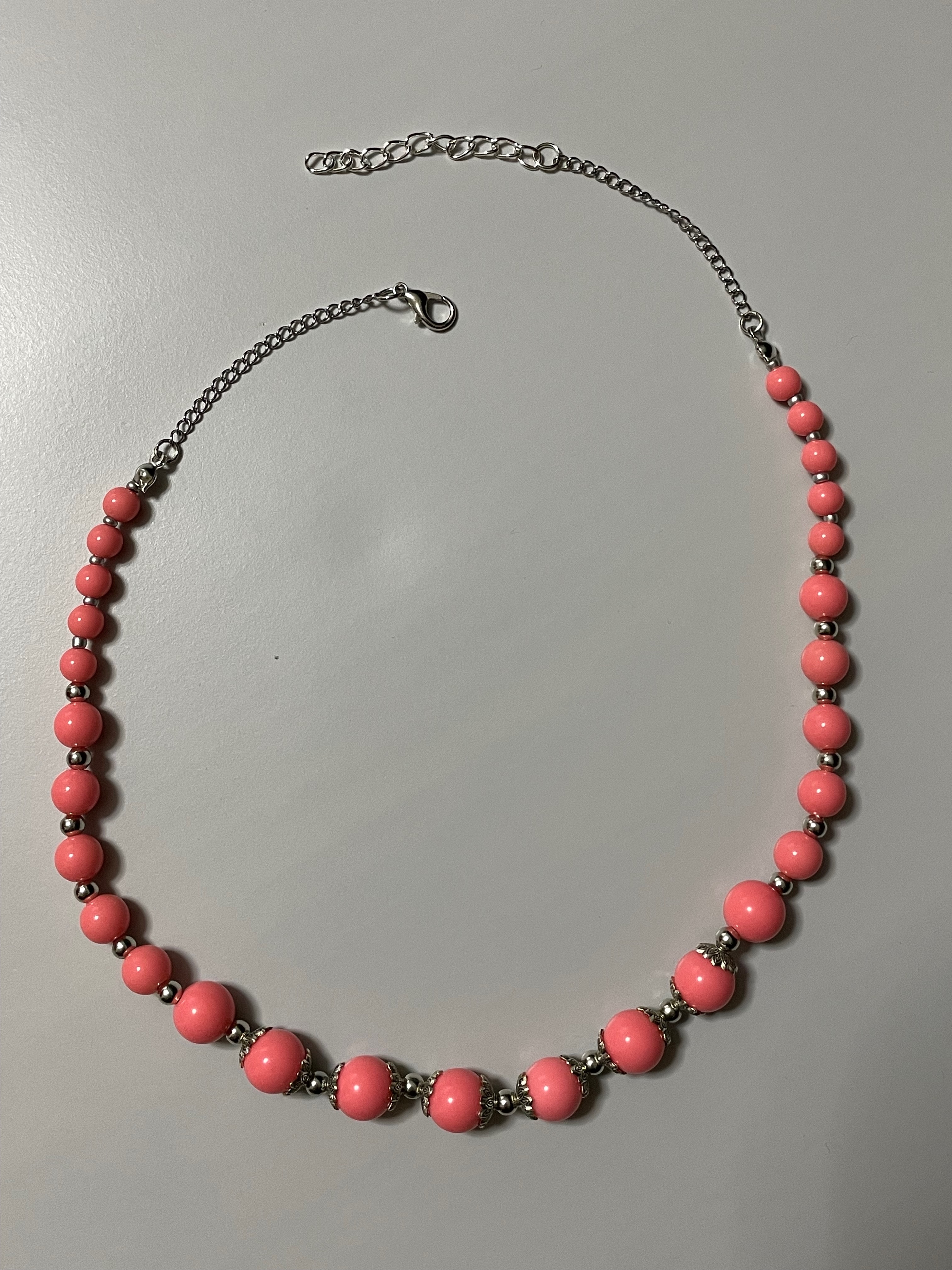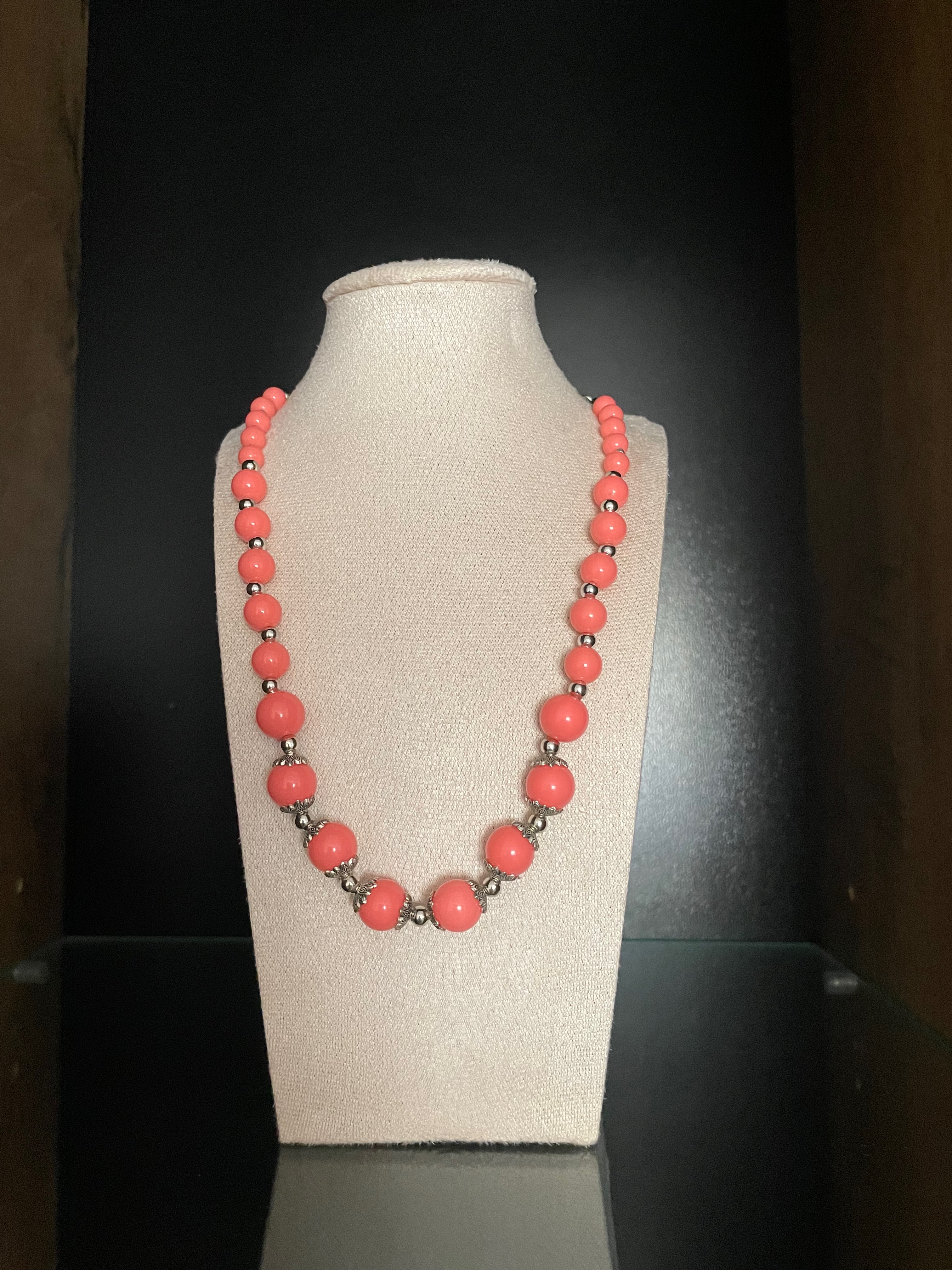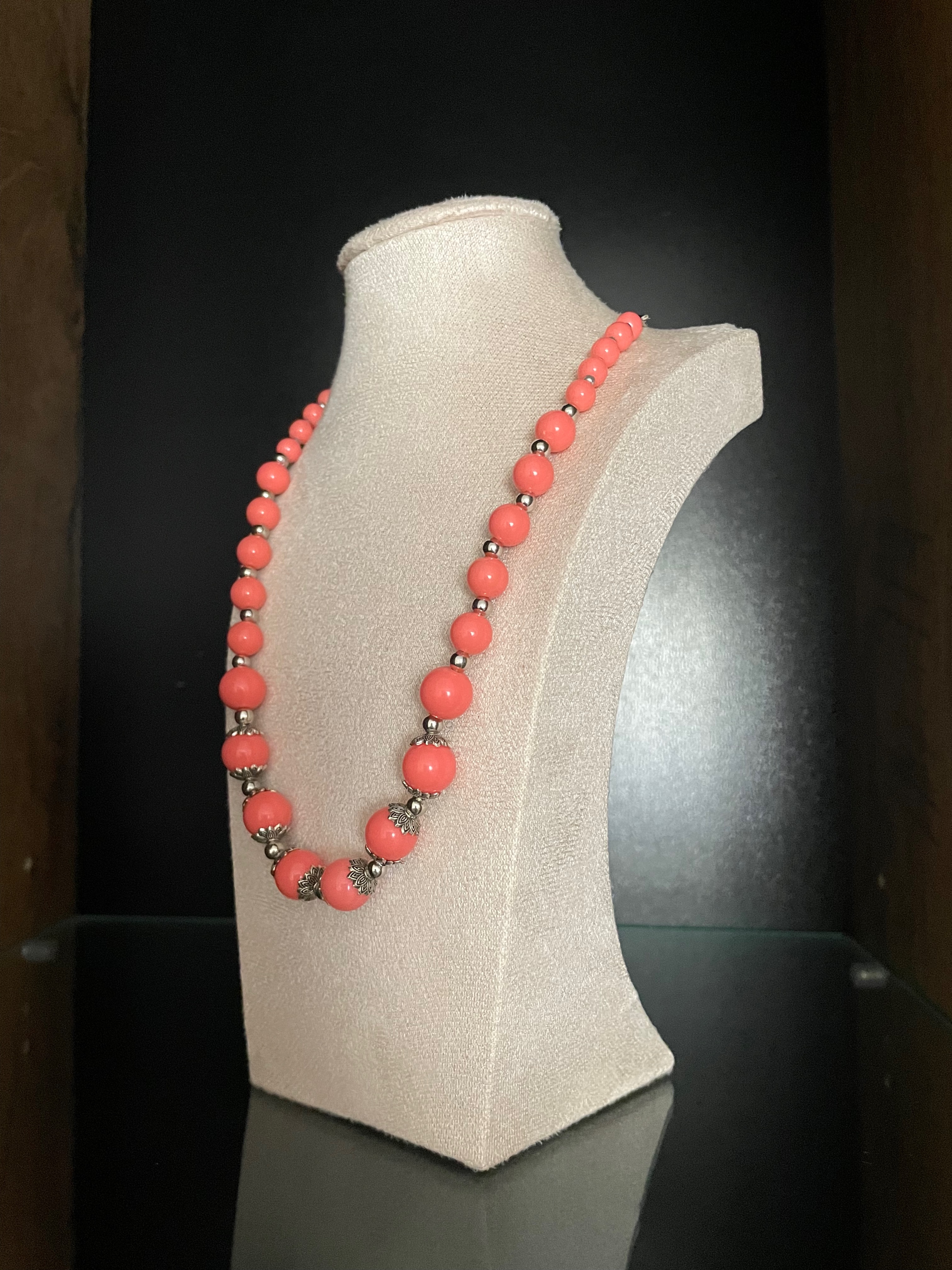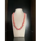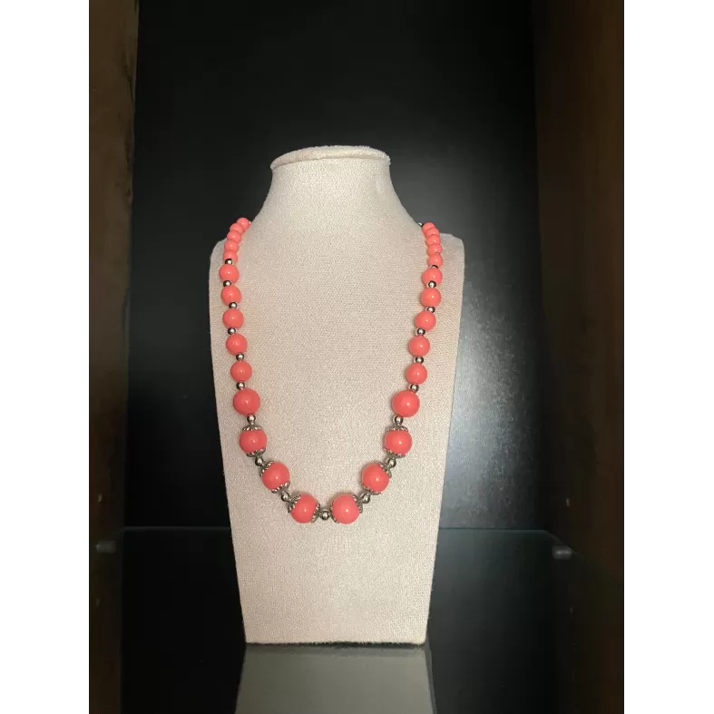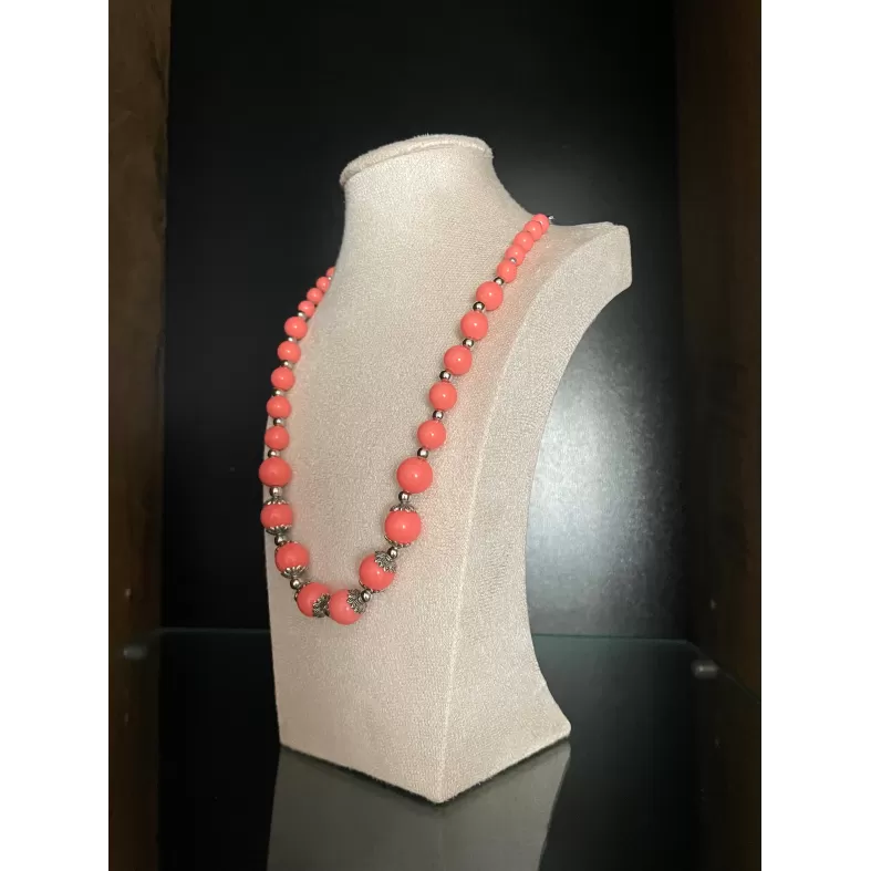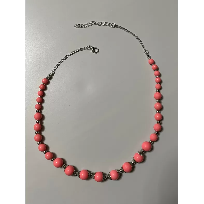 Colier realizat din margele de culoare coral, dispuse intr-un design echilibrat, cu insertii metalice decorative.