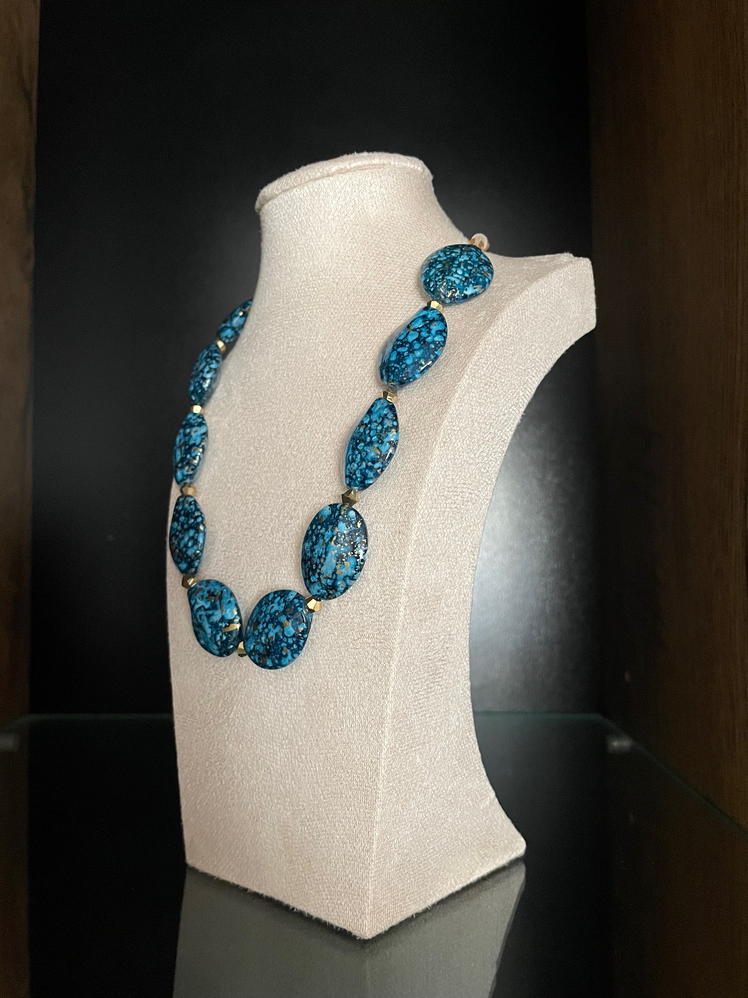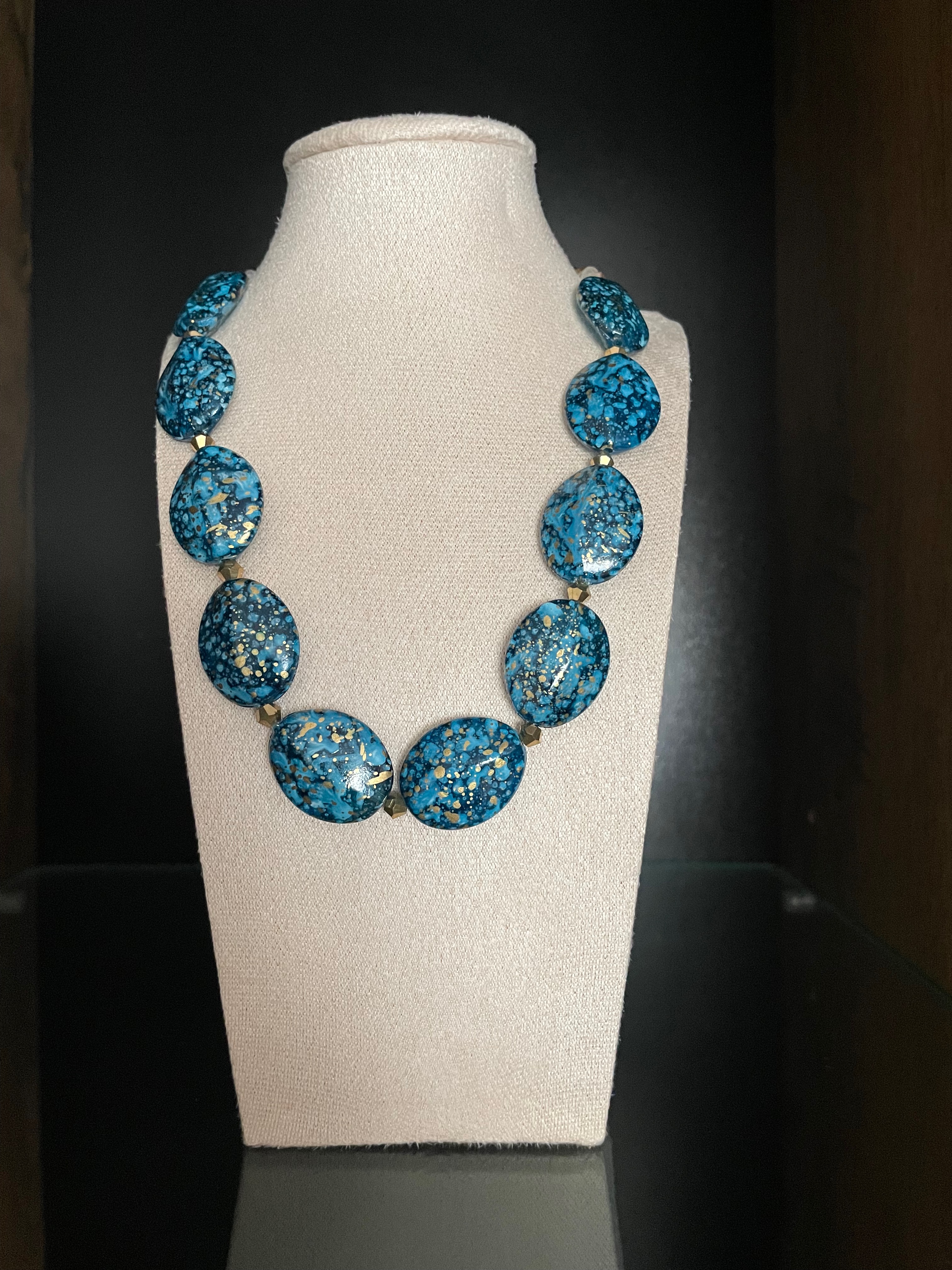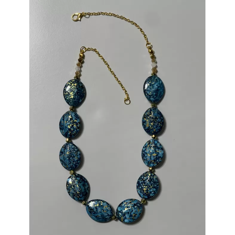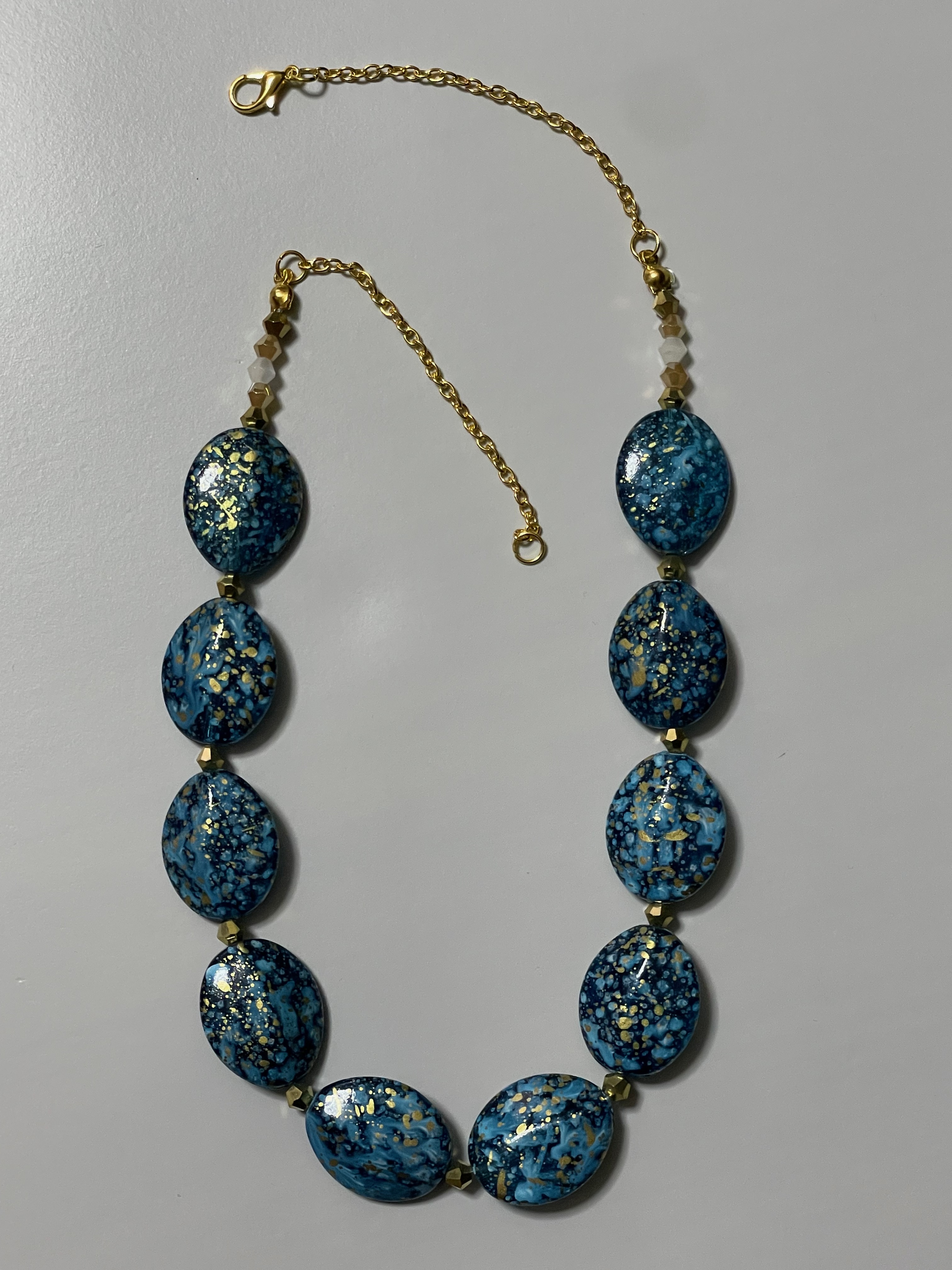 Colier elegant compus din margele mari, plate, de un albastru intens, cu efect de marmura si accente aurii.