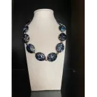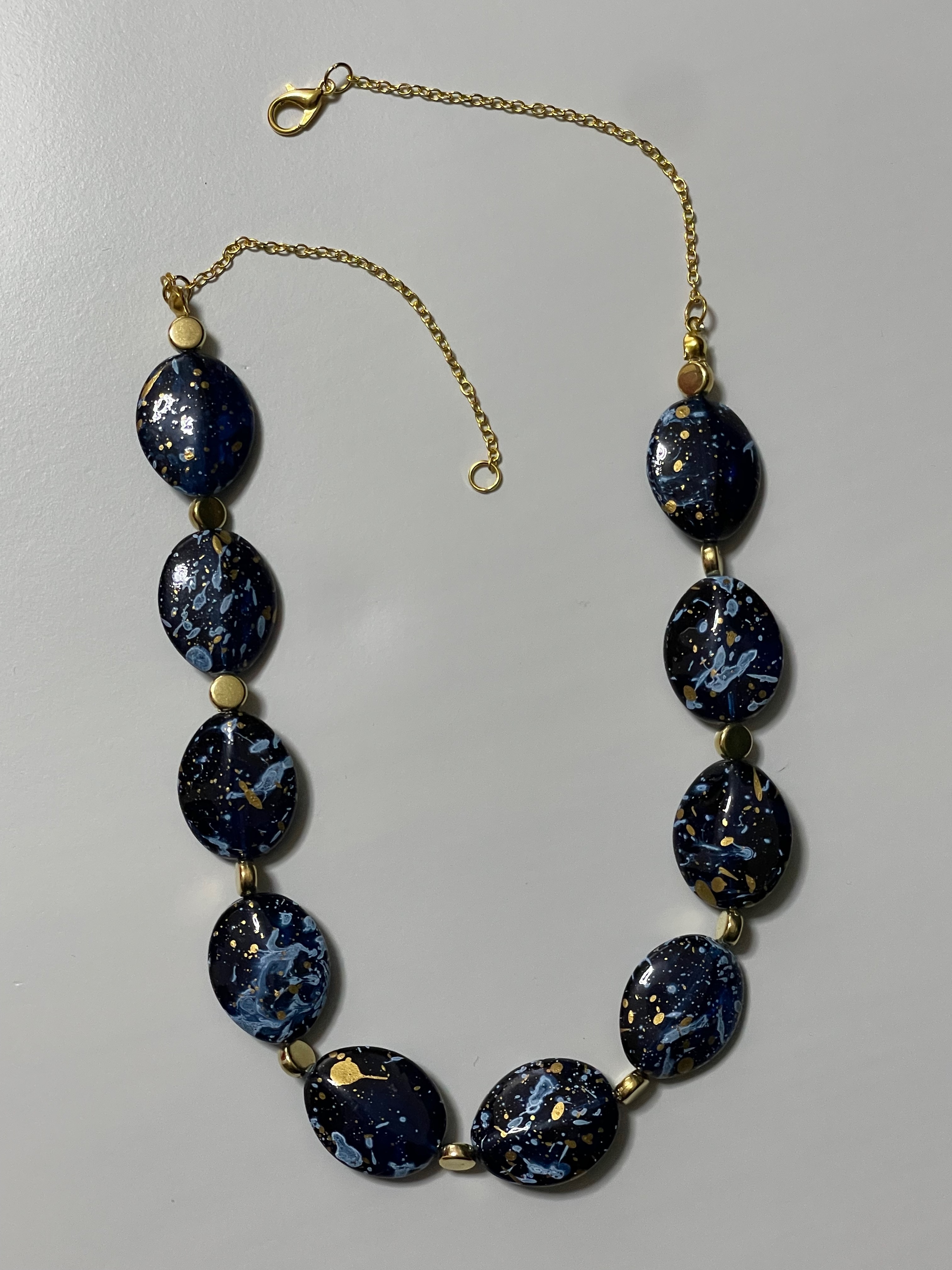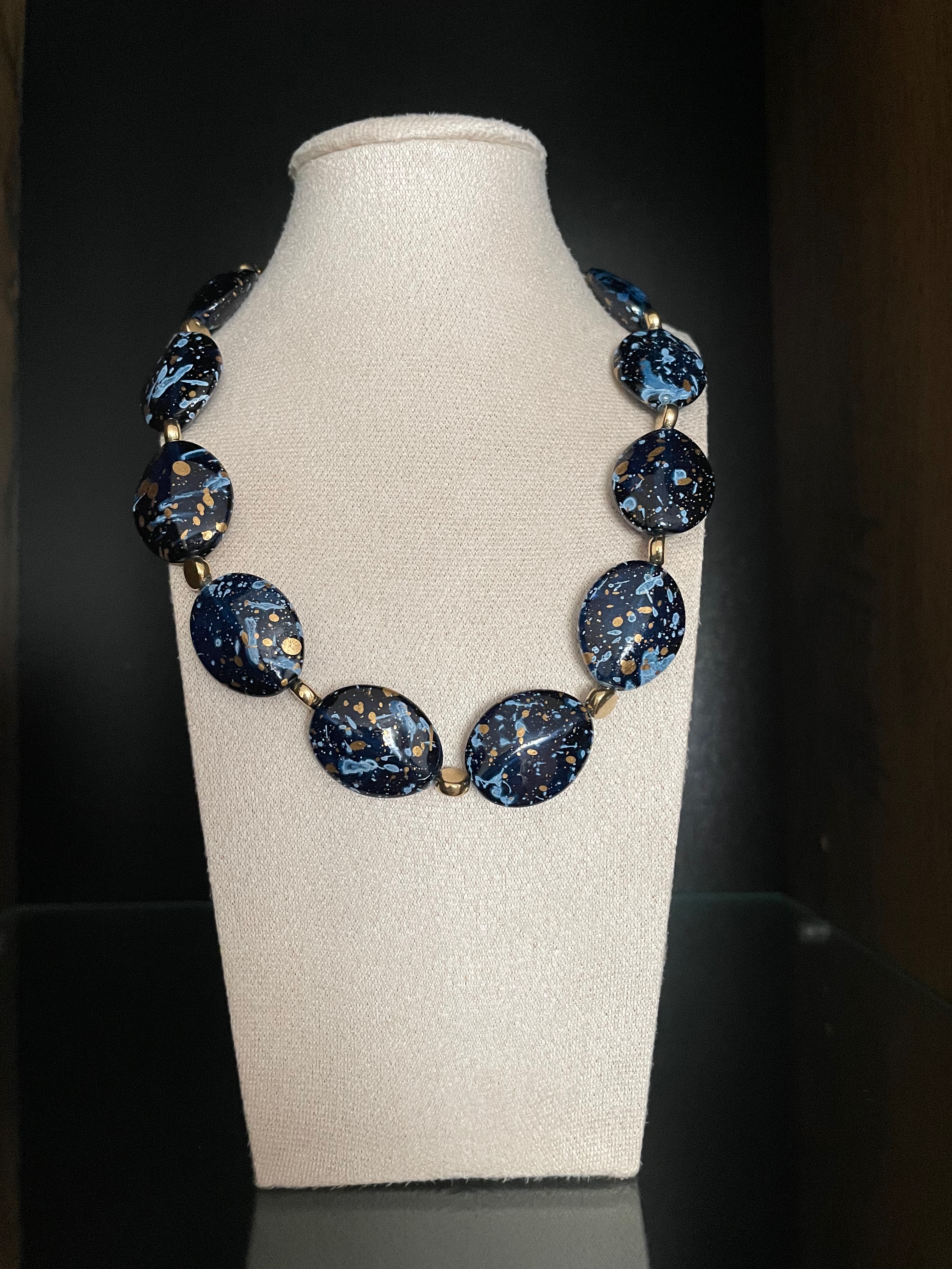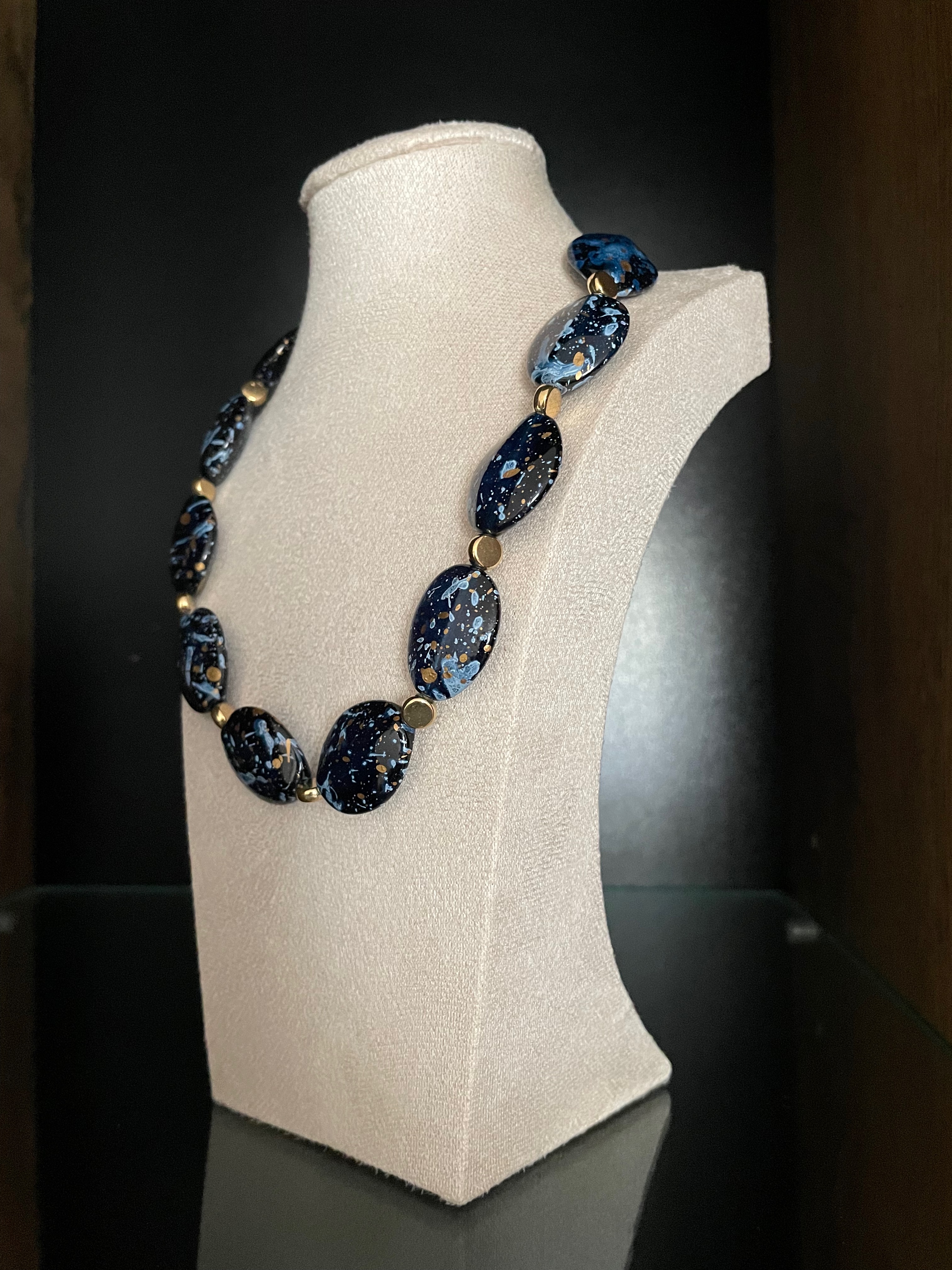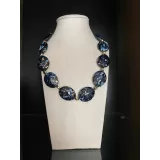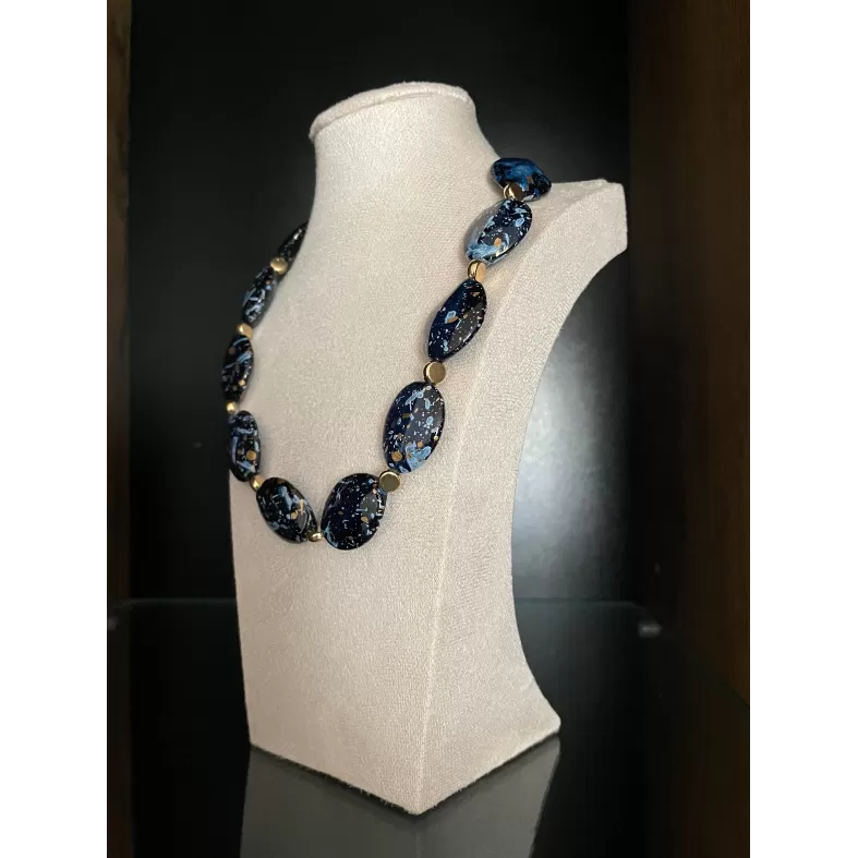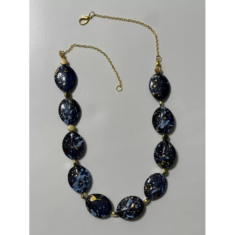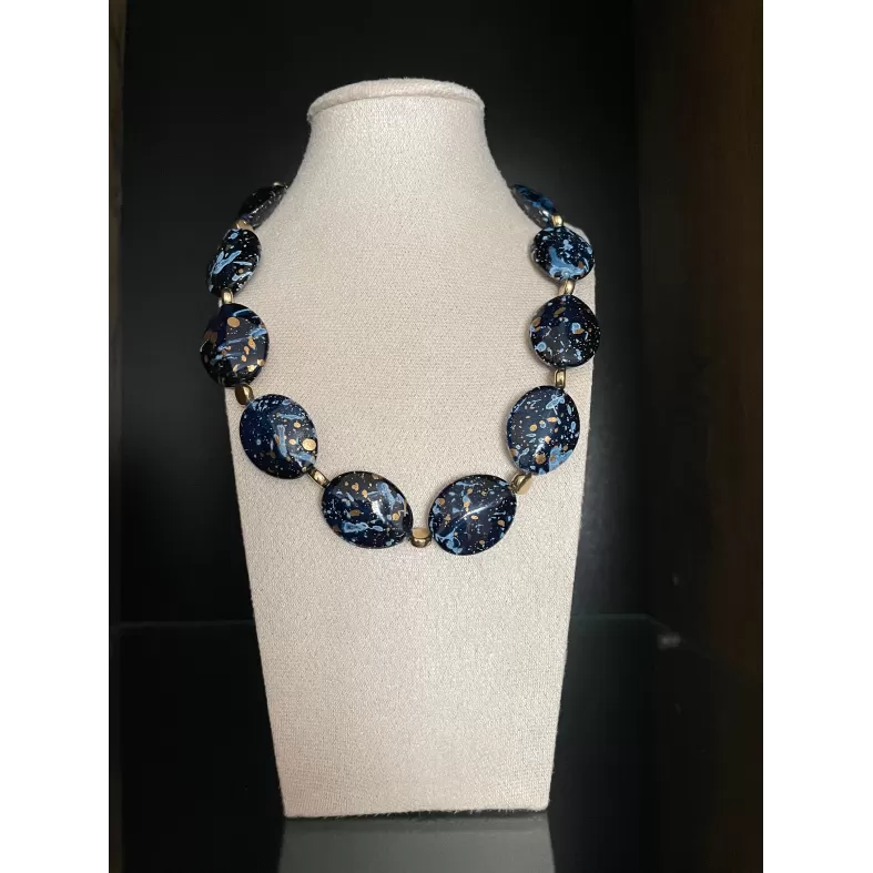 Colier elegant compus din margele mari, plate, bleumarin, cu efect de marmura si accente aurii.