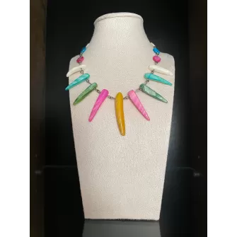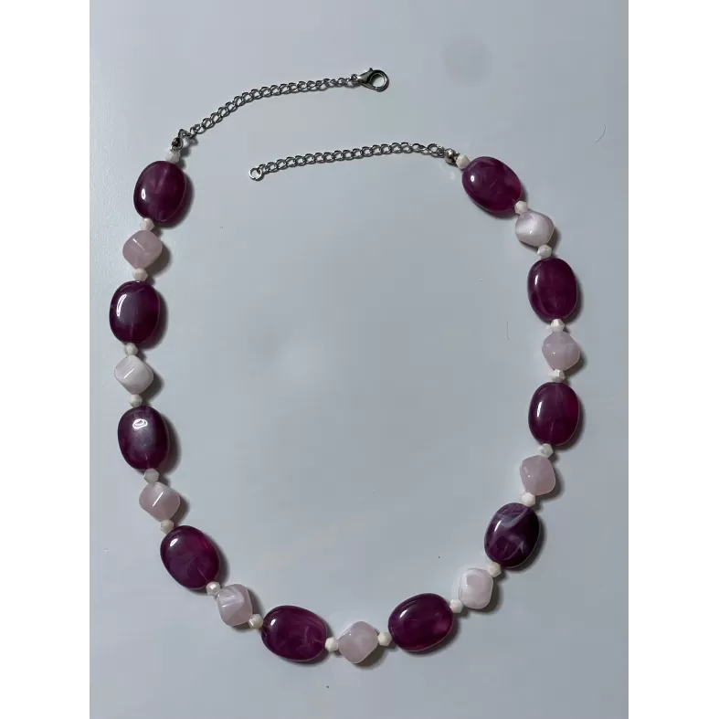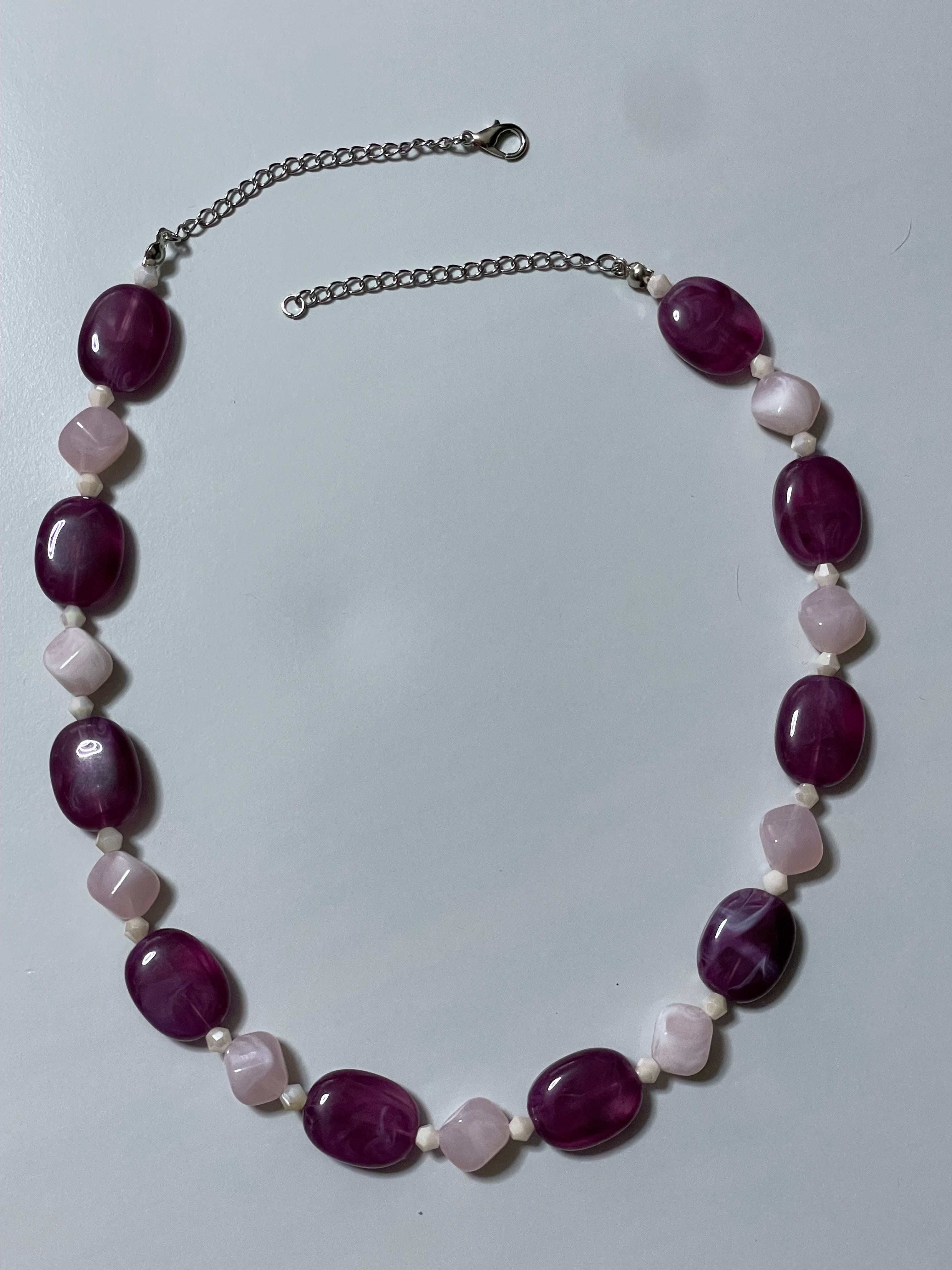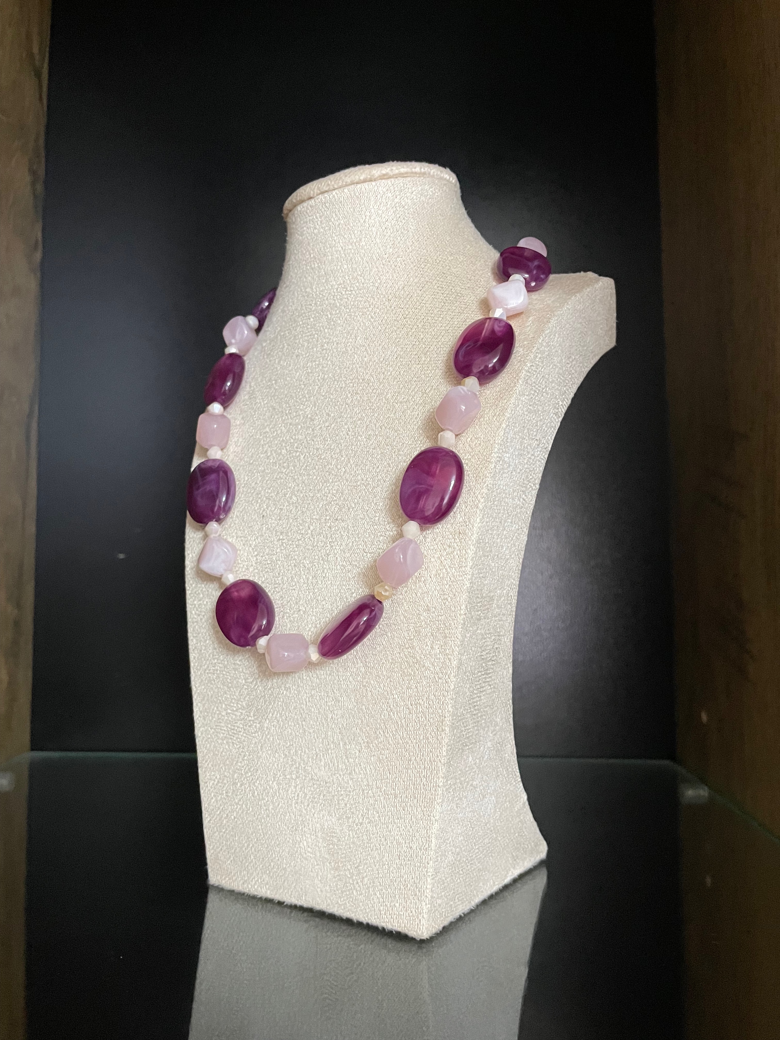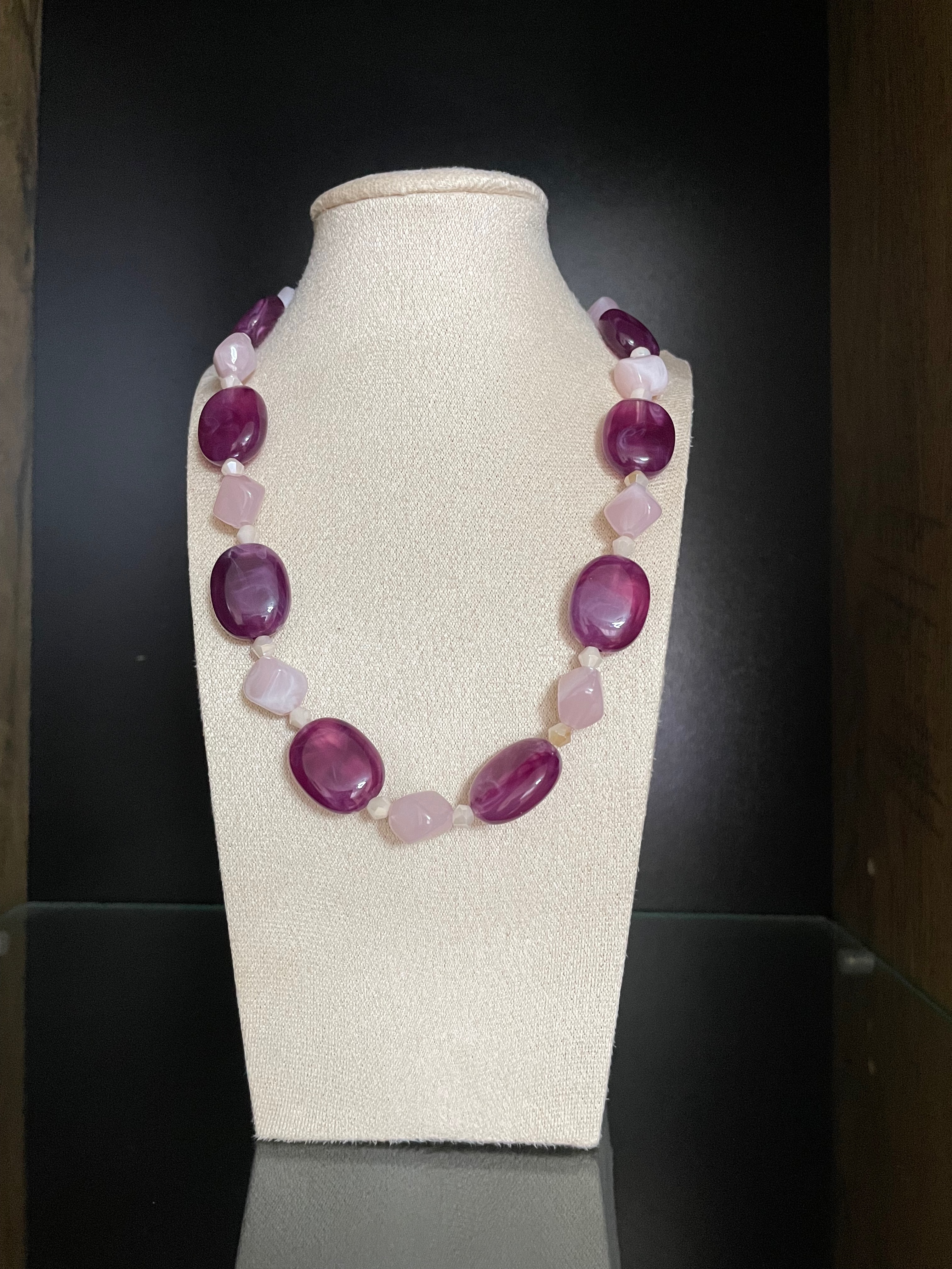 Colier elegant realizat manual, compus dintr-o selectie de pietre semipretioase in tonuri delicate de mov si roz.