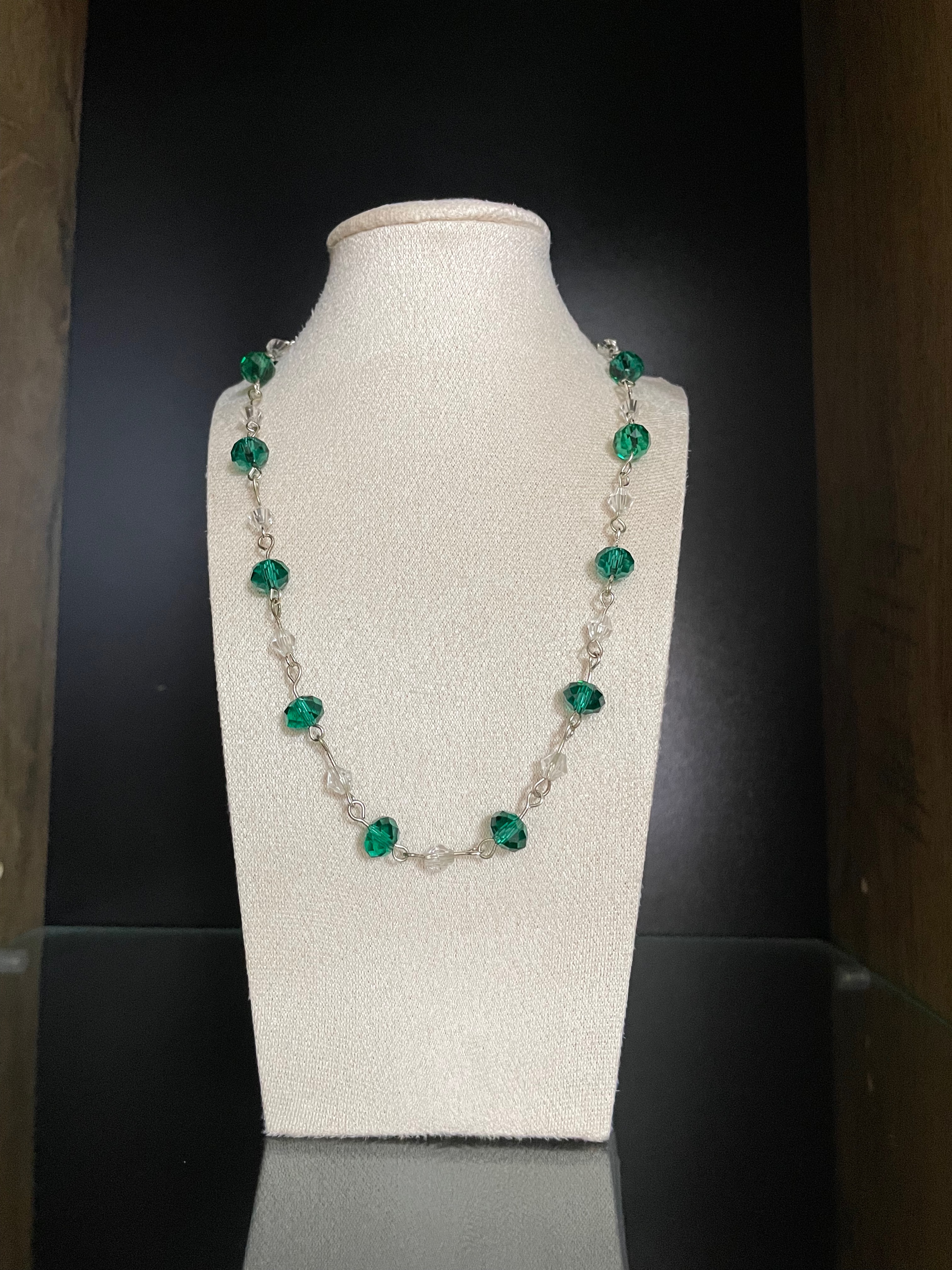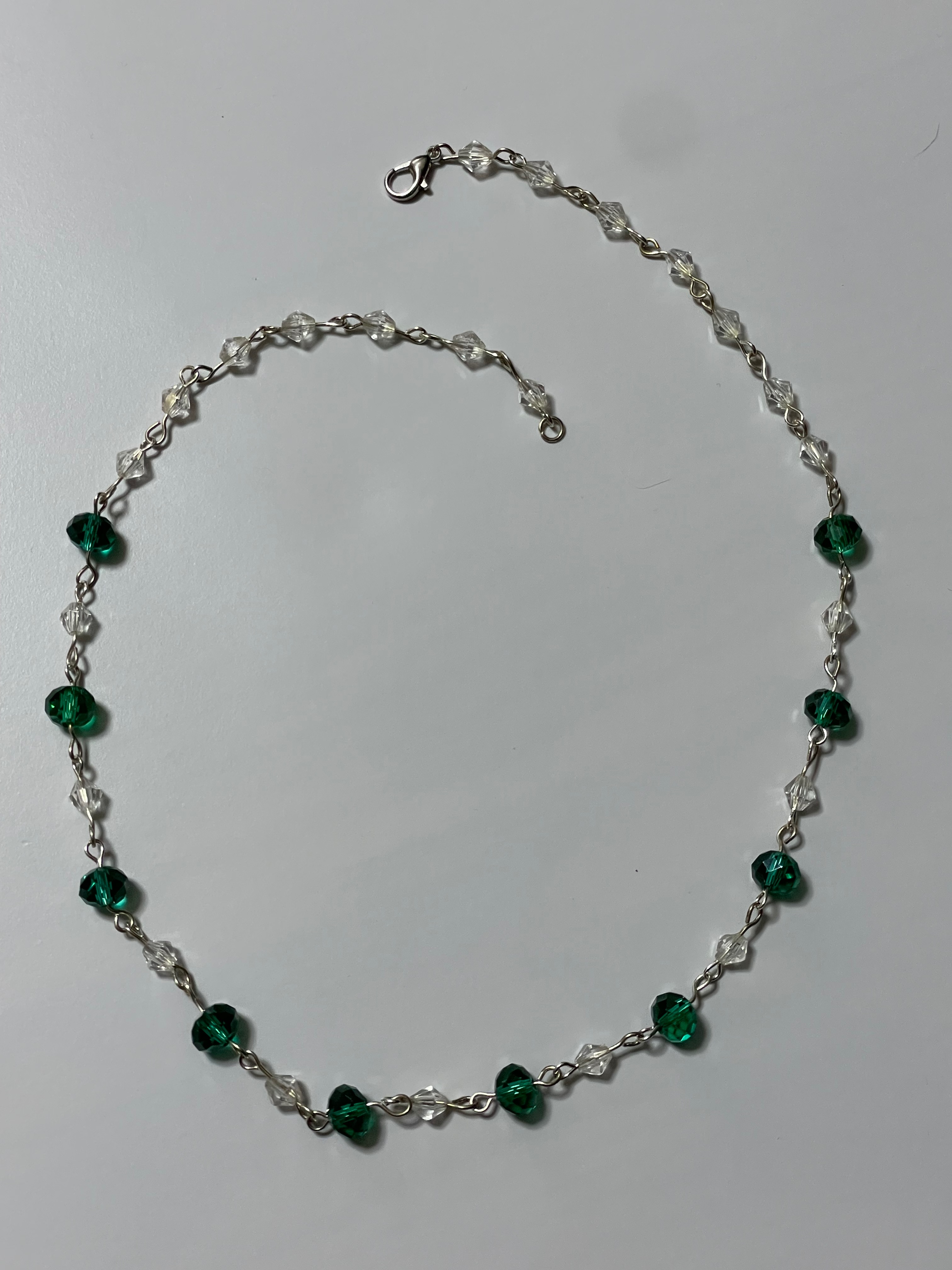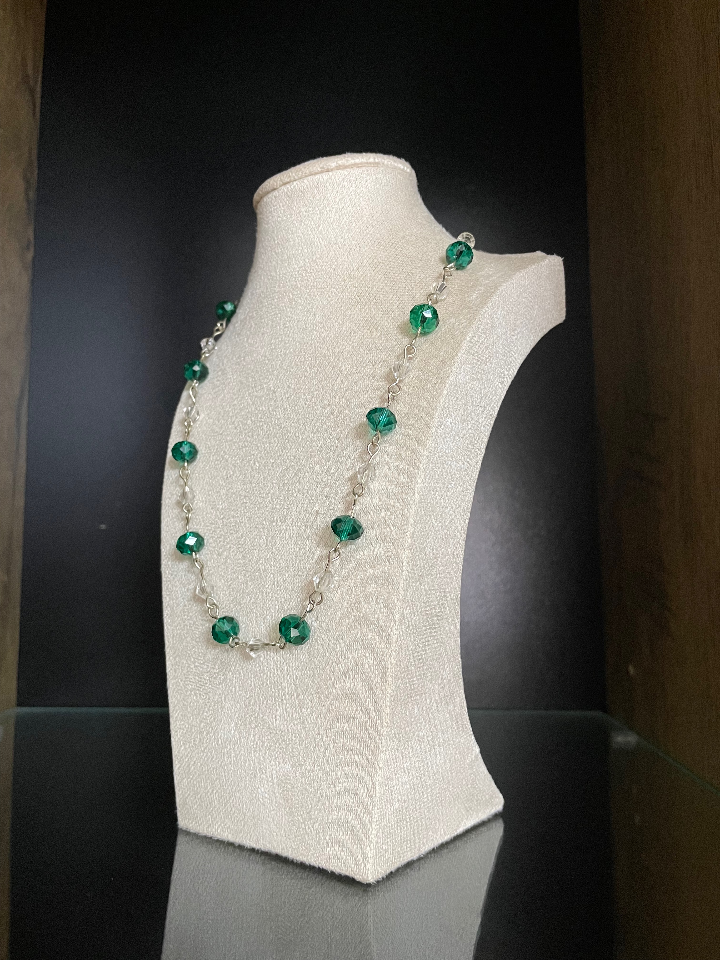 Colier discret cu margele de sticla fatetata de culoare verde, conectate printr-un lant metalic si elemente trasparente.