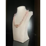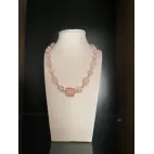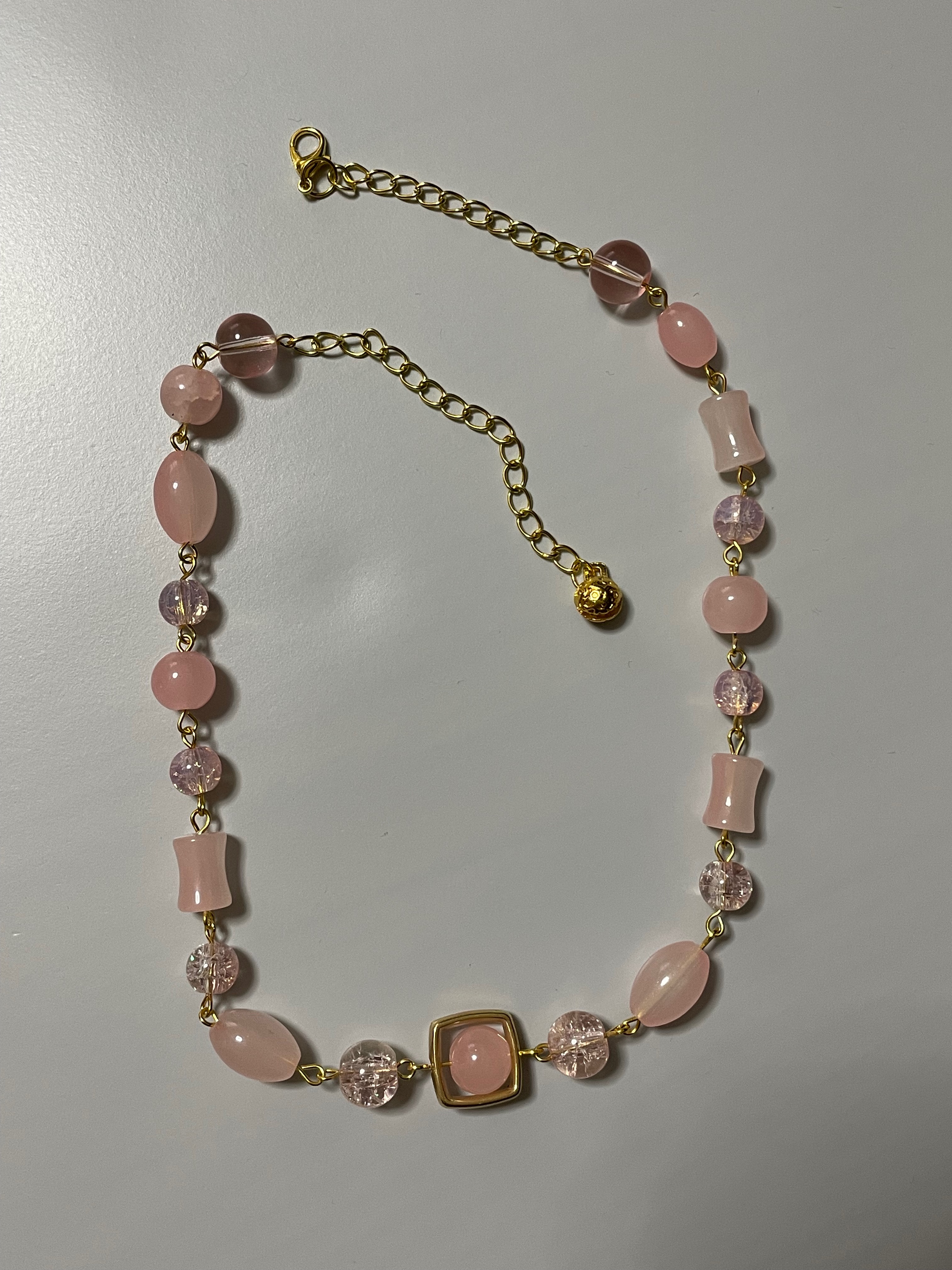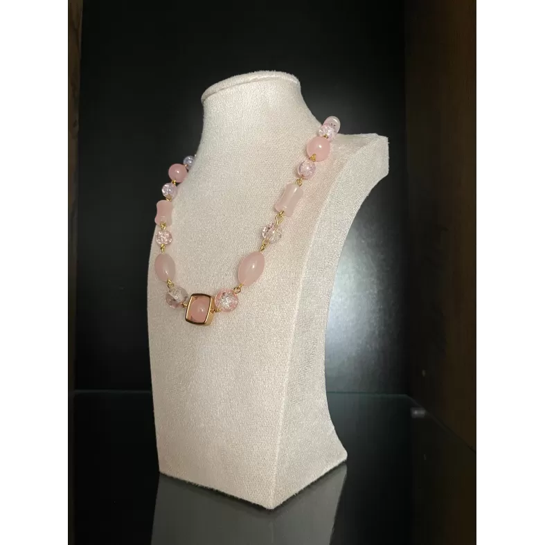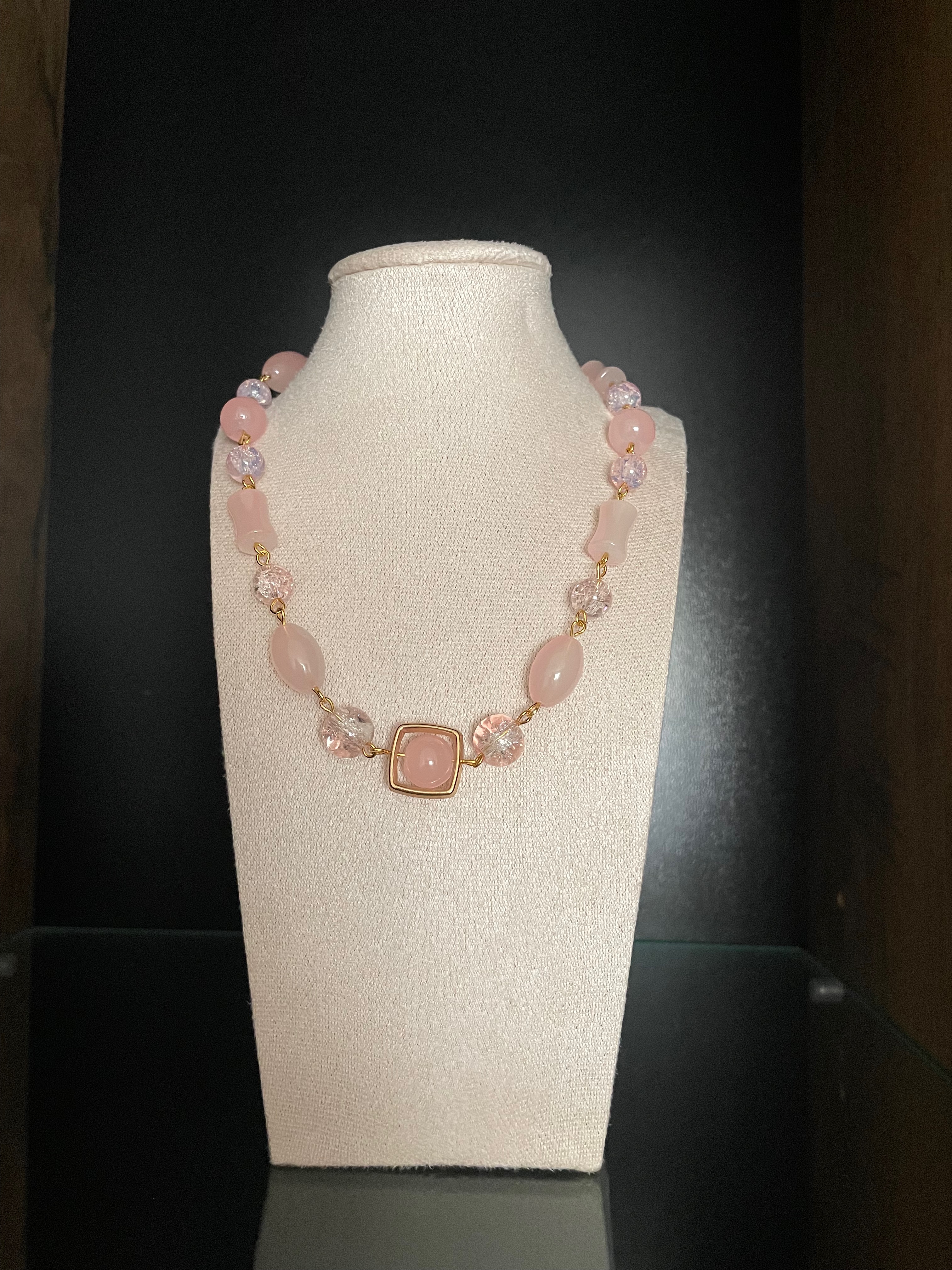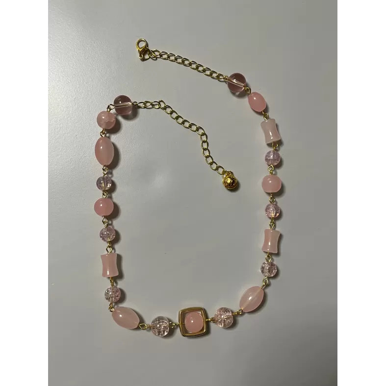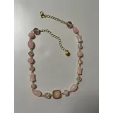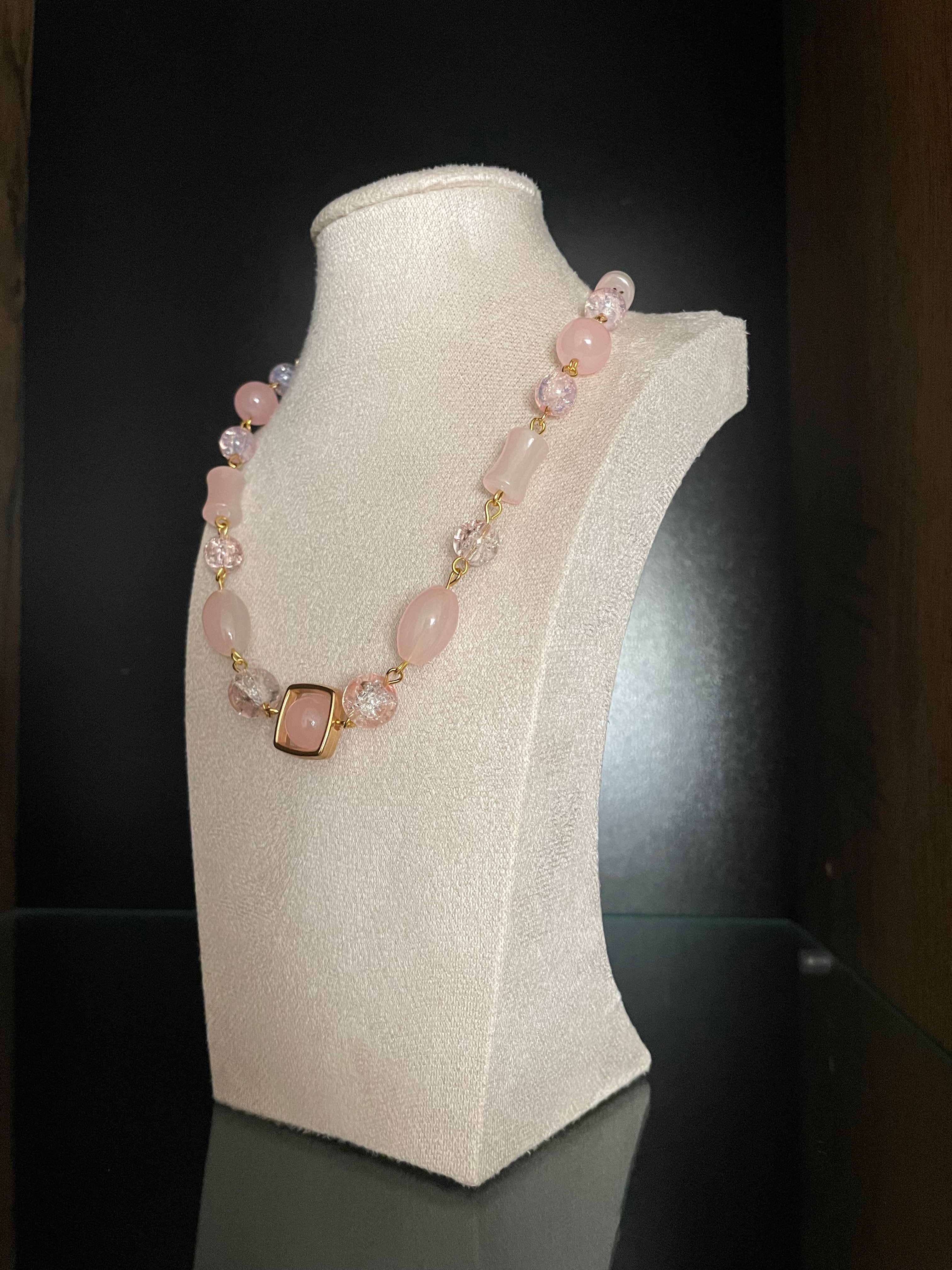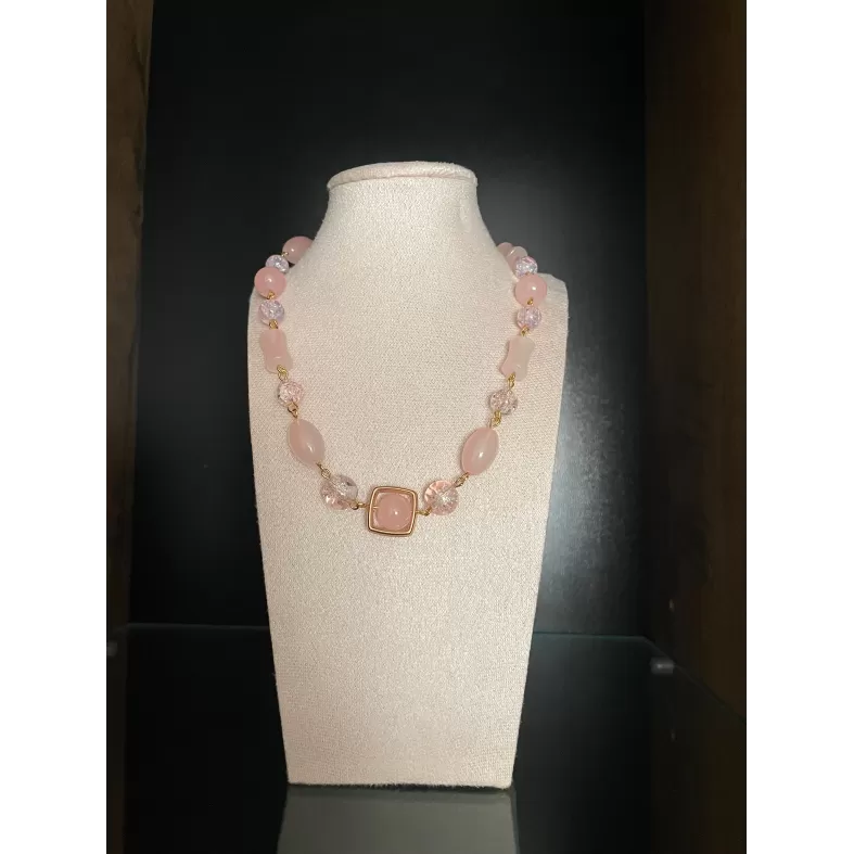 Colier elegant compus din margele roz de diferite forme si marimi, imbinate cu elemente transparente si accente aurii. Punctul central al colierului este o piatra incadrata in metal auriu care adauga un plus de rafinament.