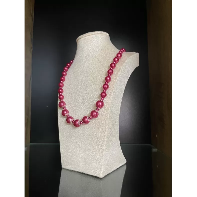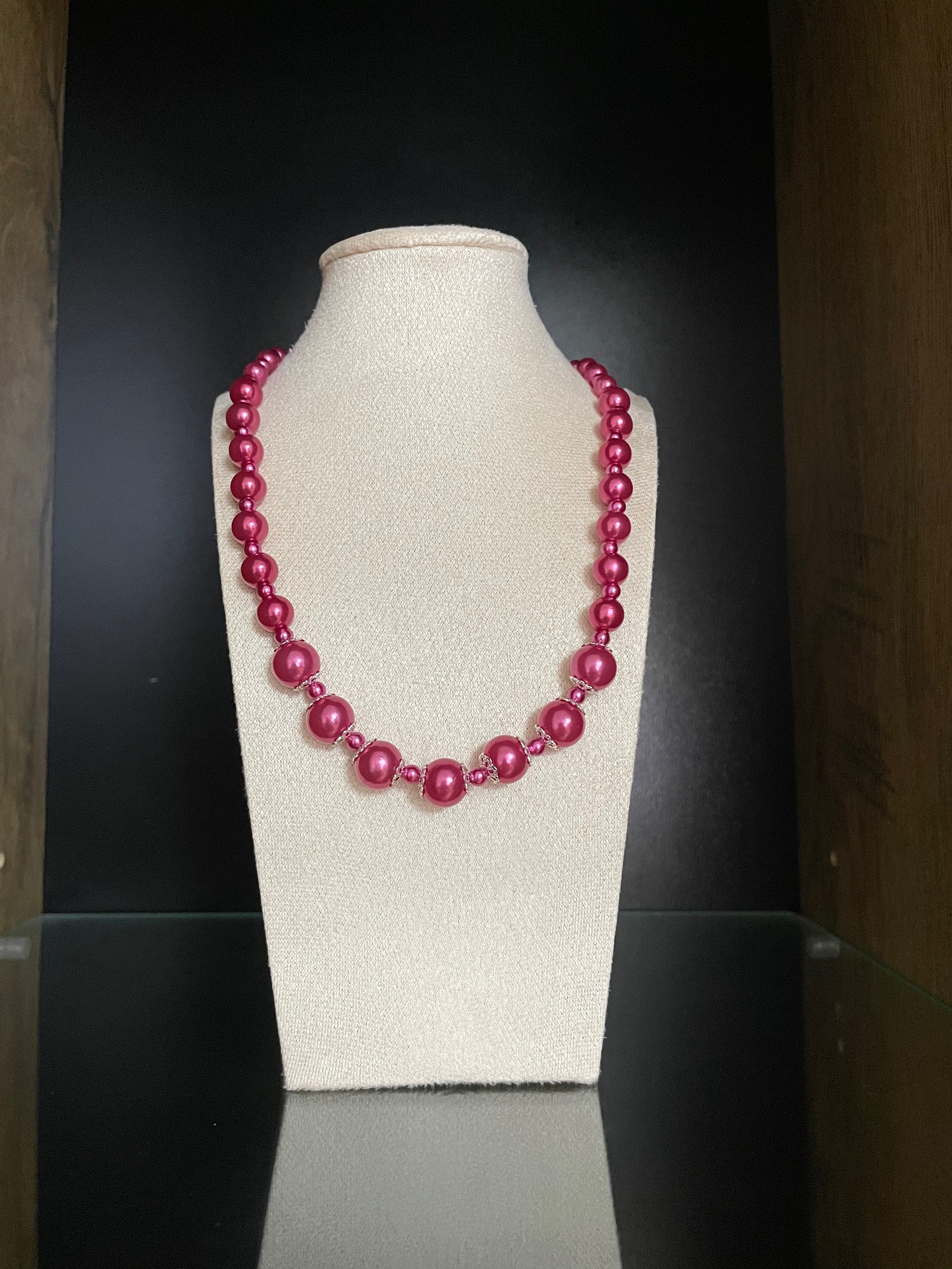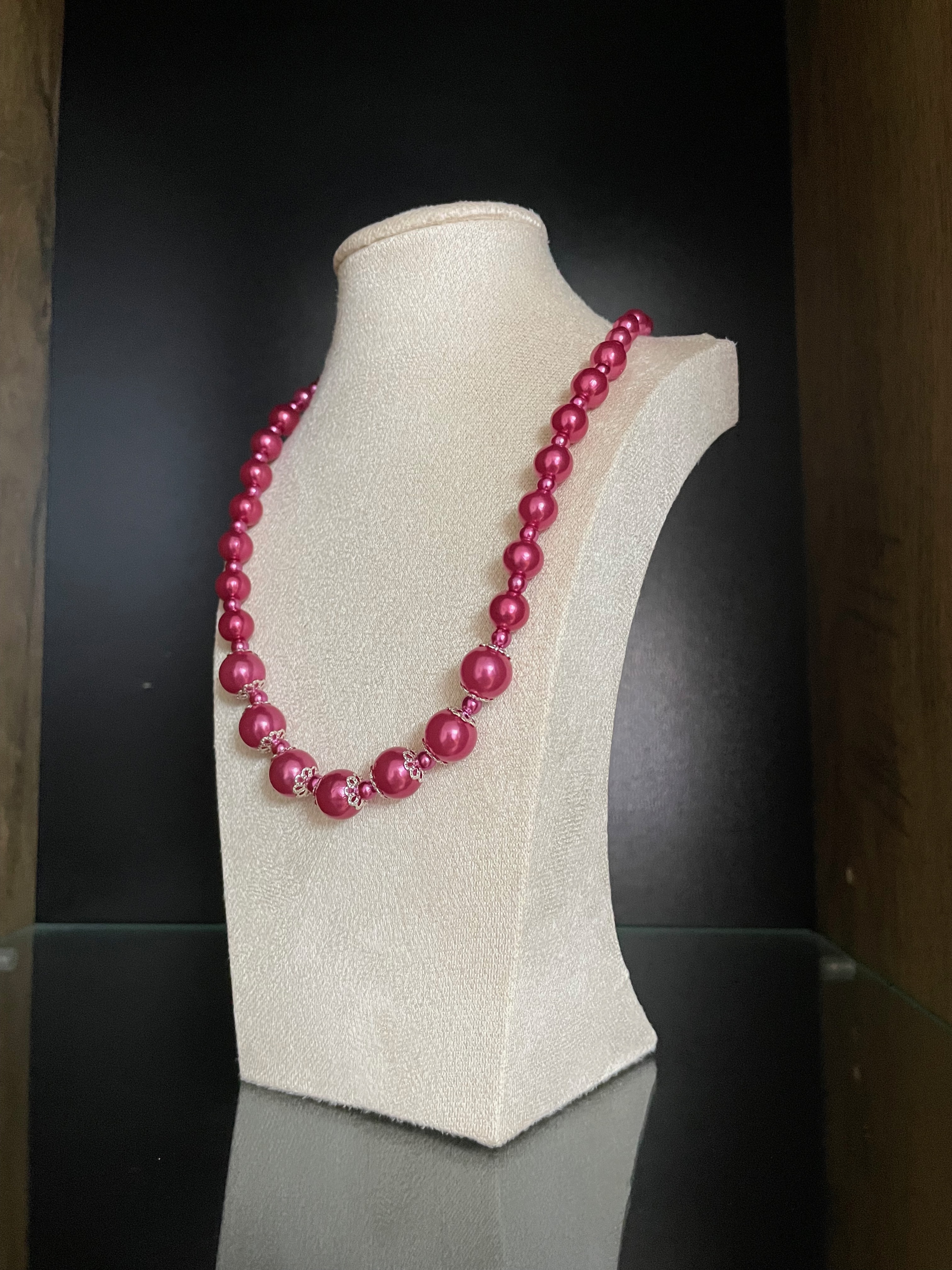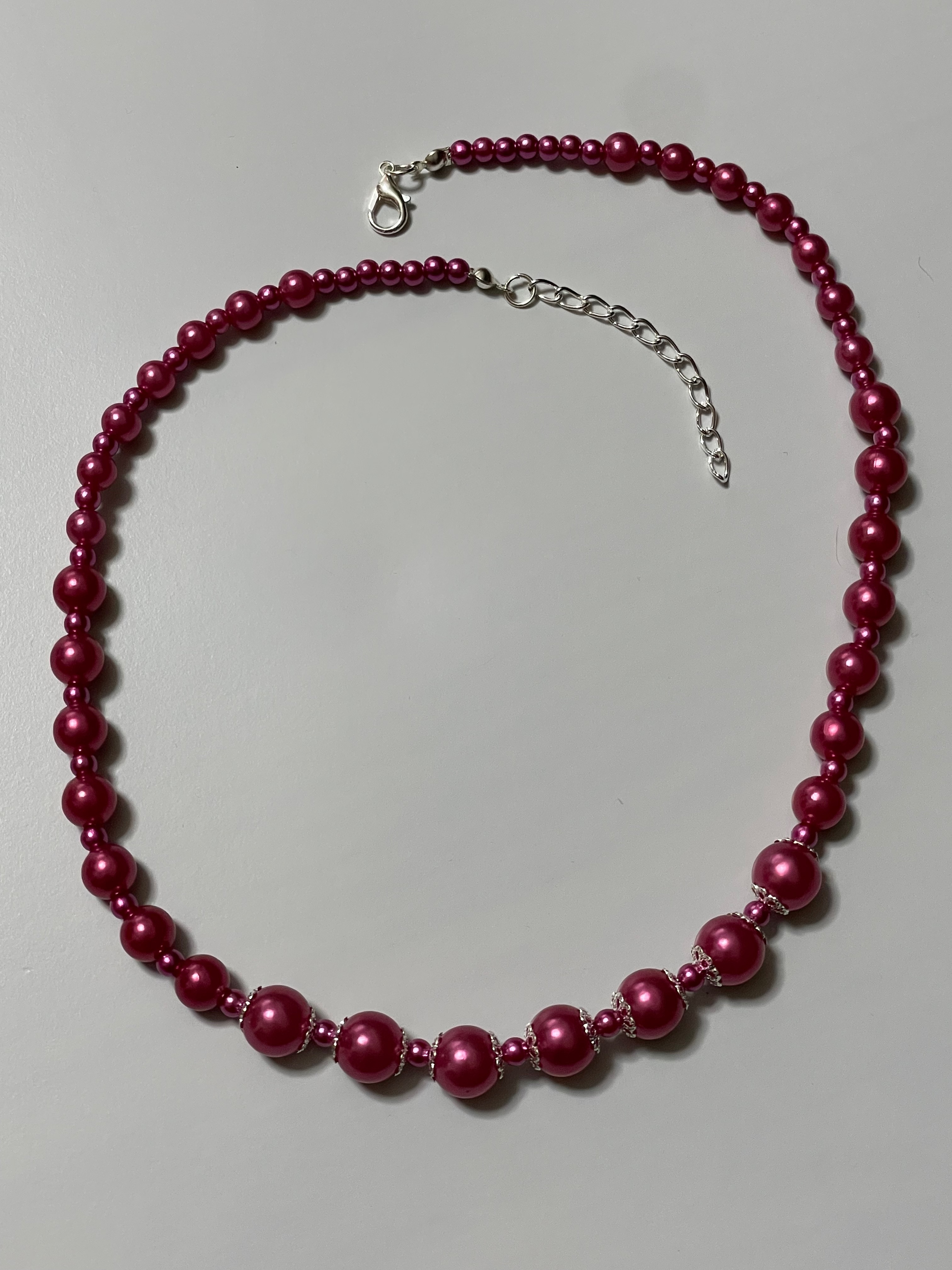 Colier realizat din margele raspberry pink, dispuse intr-un design echilibrat, cu insertii metalice decorative.