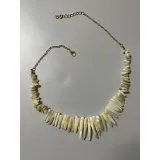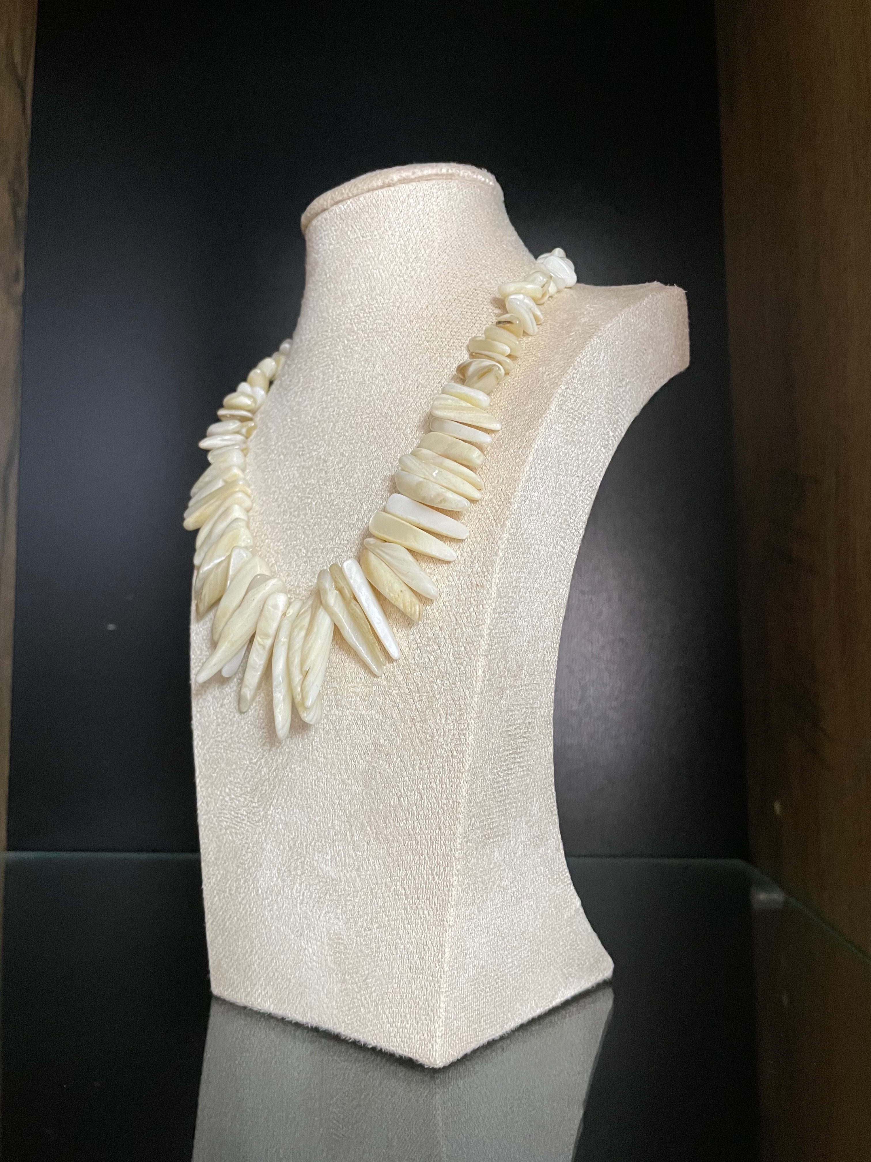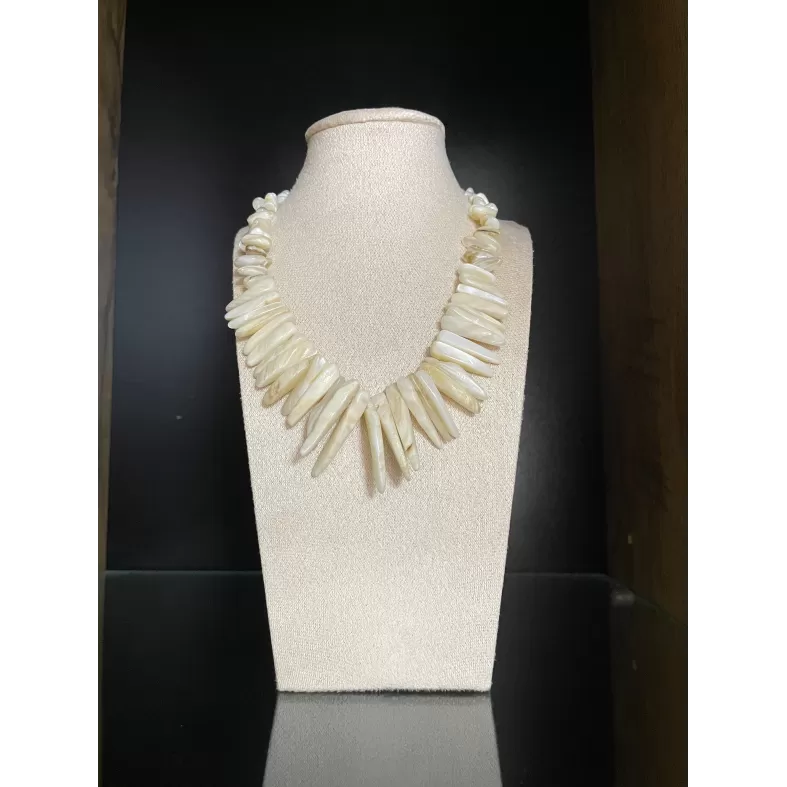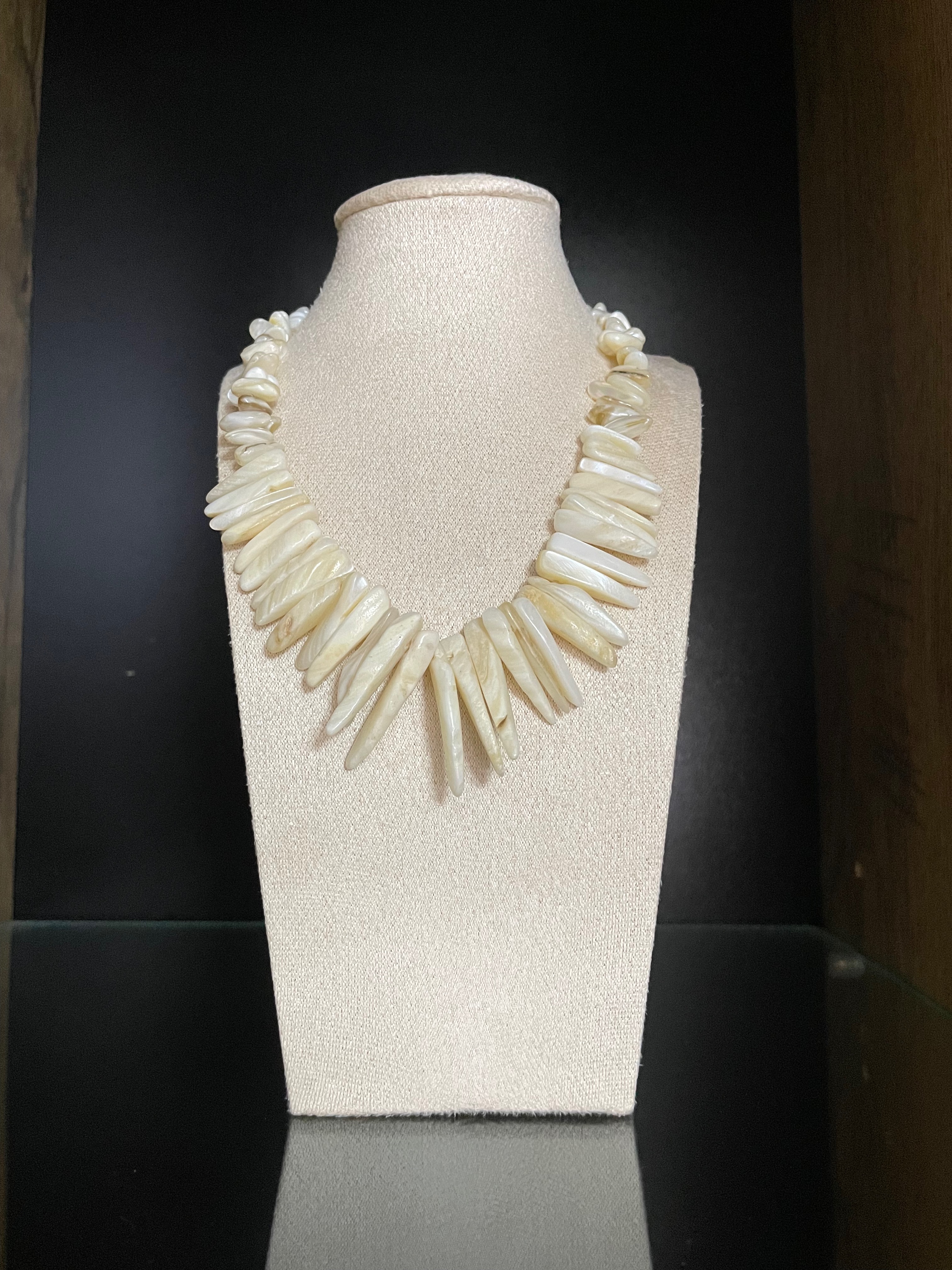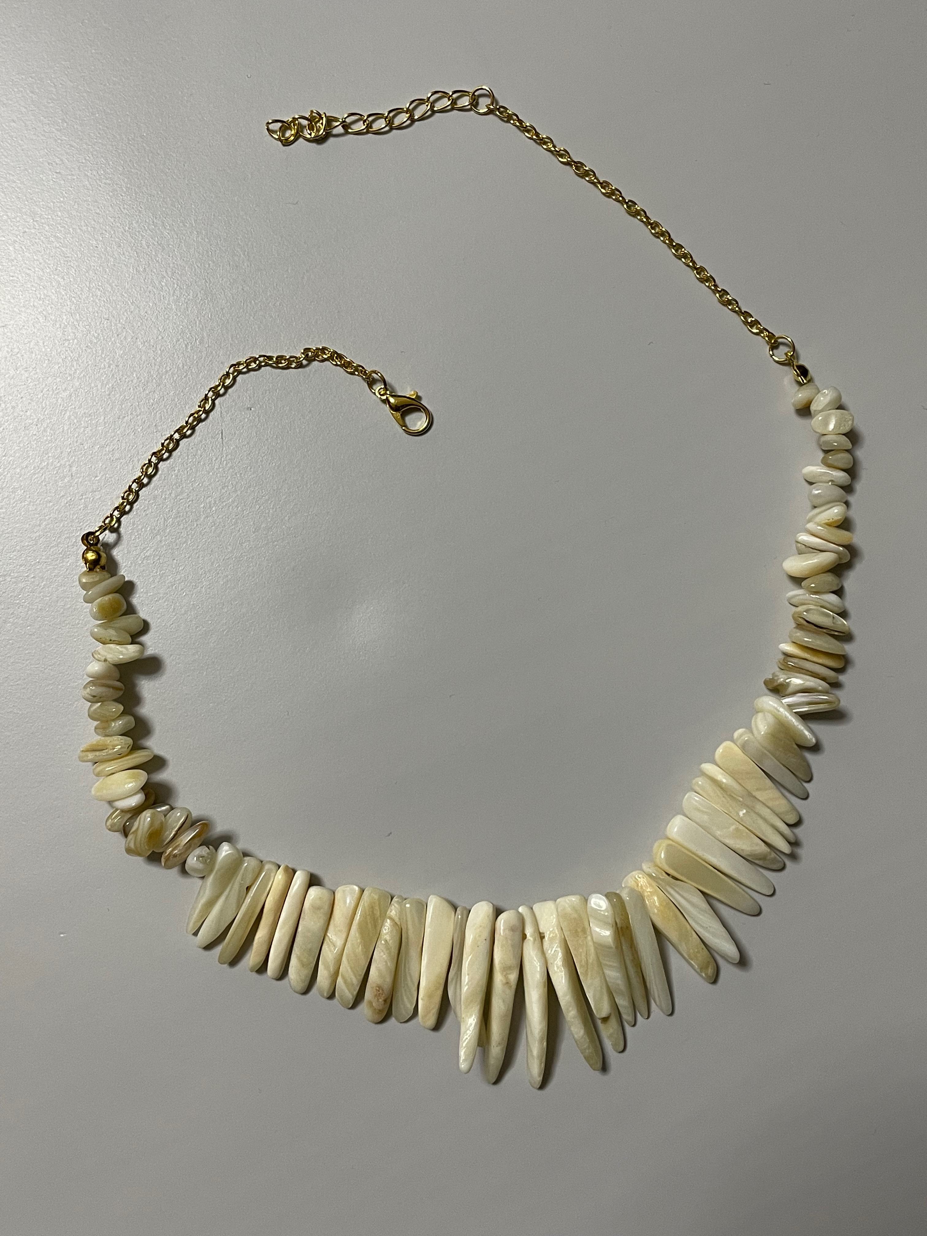 Colier statement realizat din elemente alungite de sidef in nuante nude.