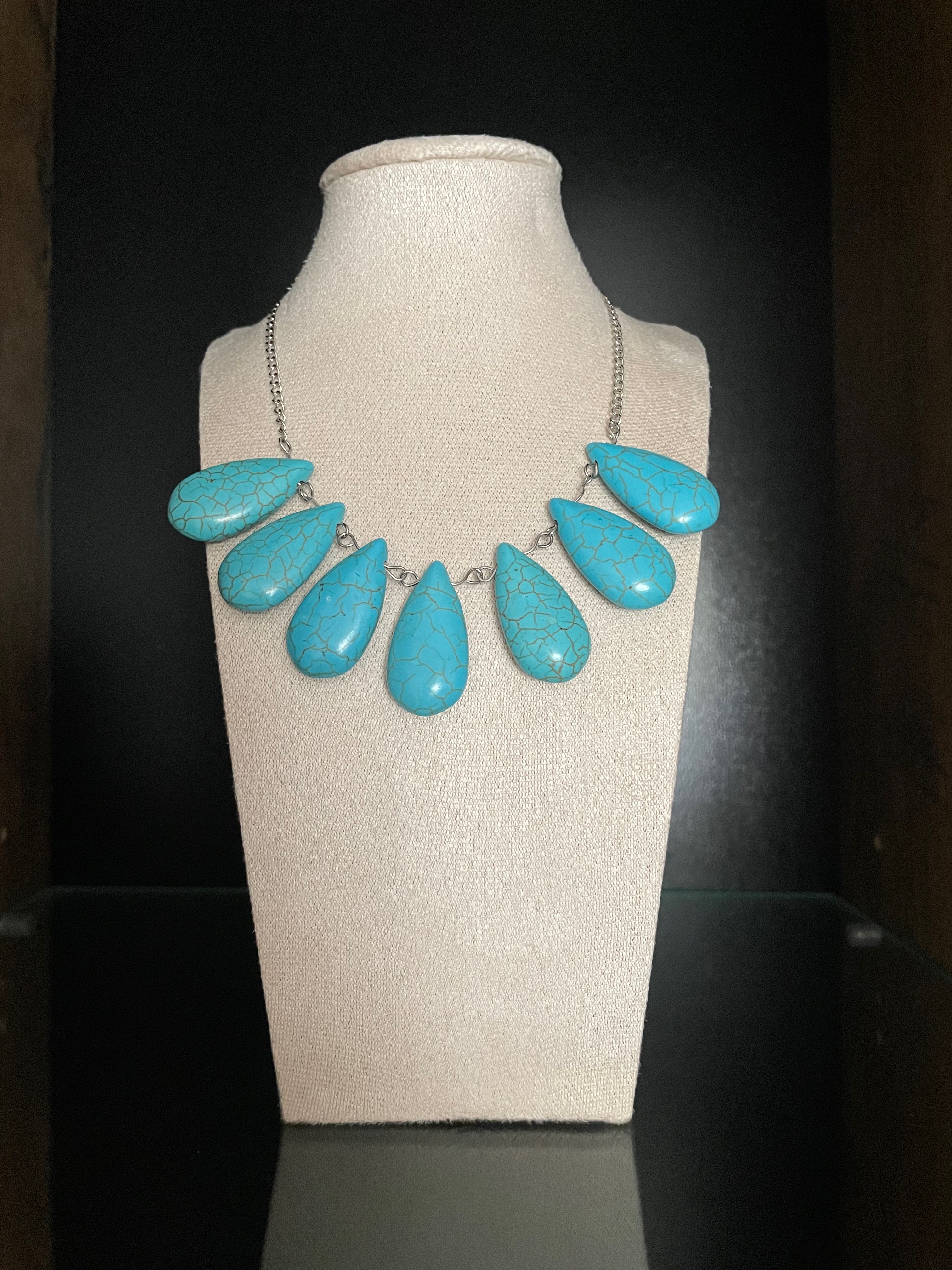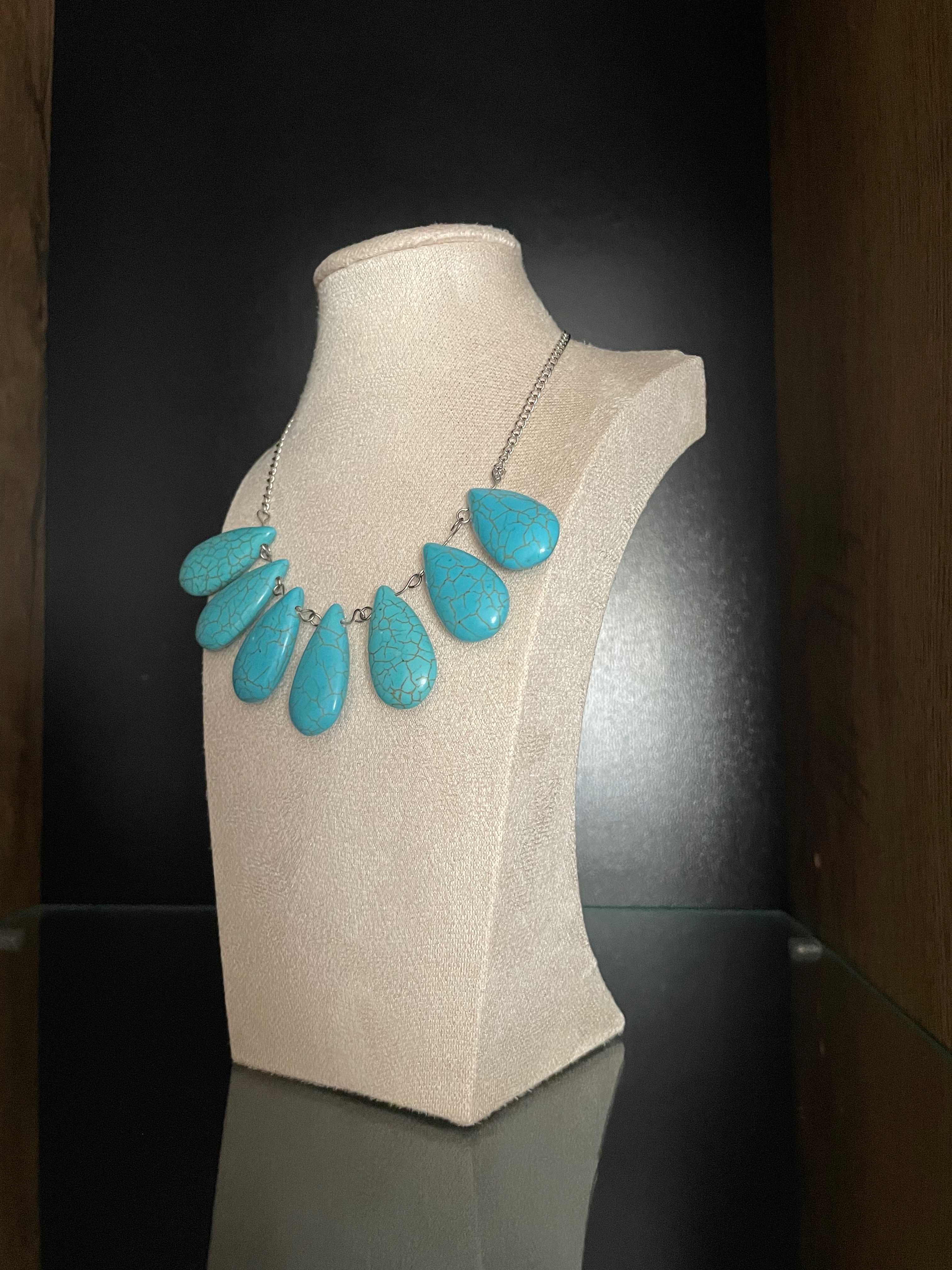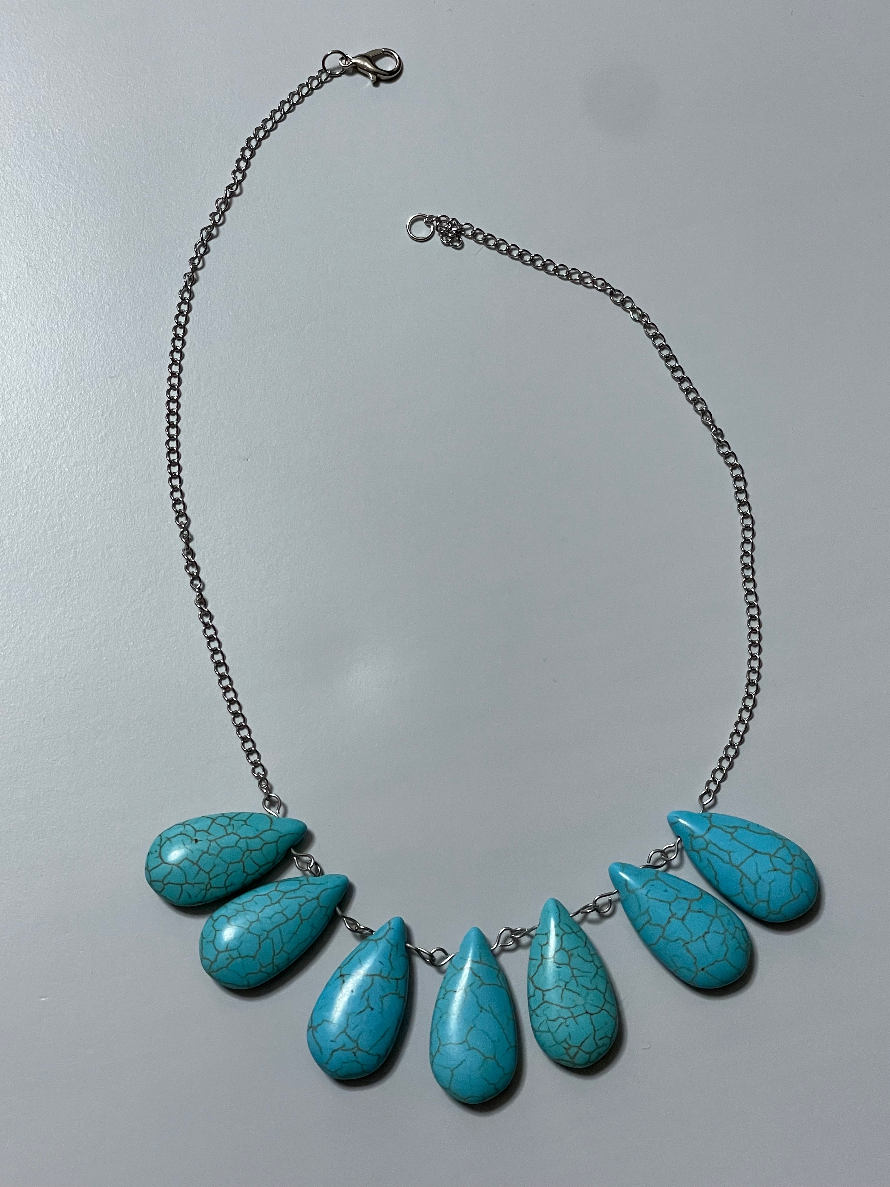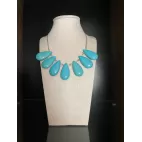 Colier elegant cu lant metalic argintiu si pietre turcoaz in forma de lacrima, dispuse simetric.