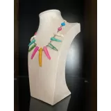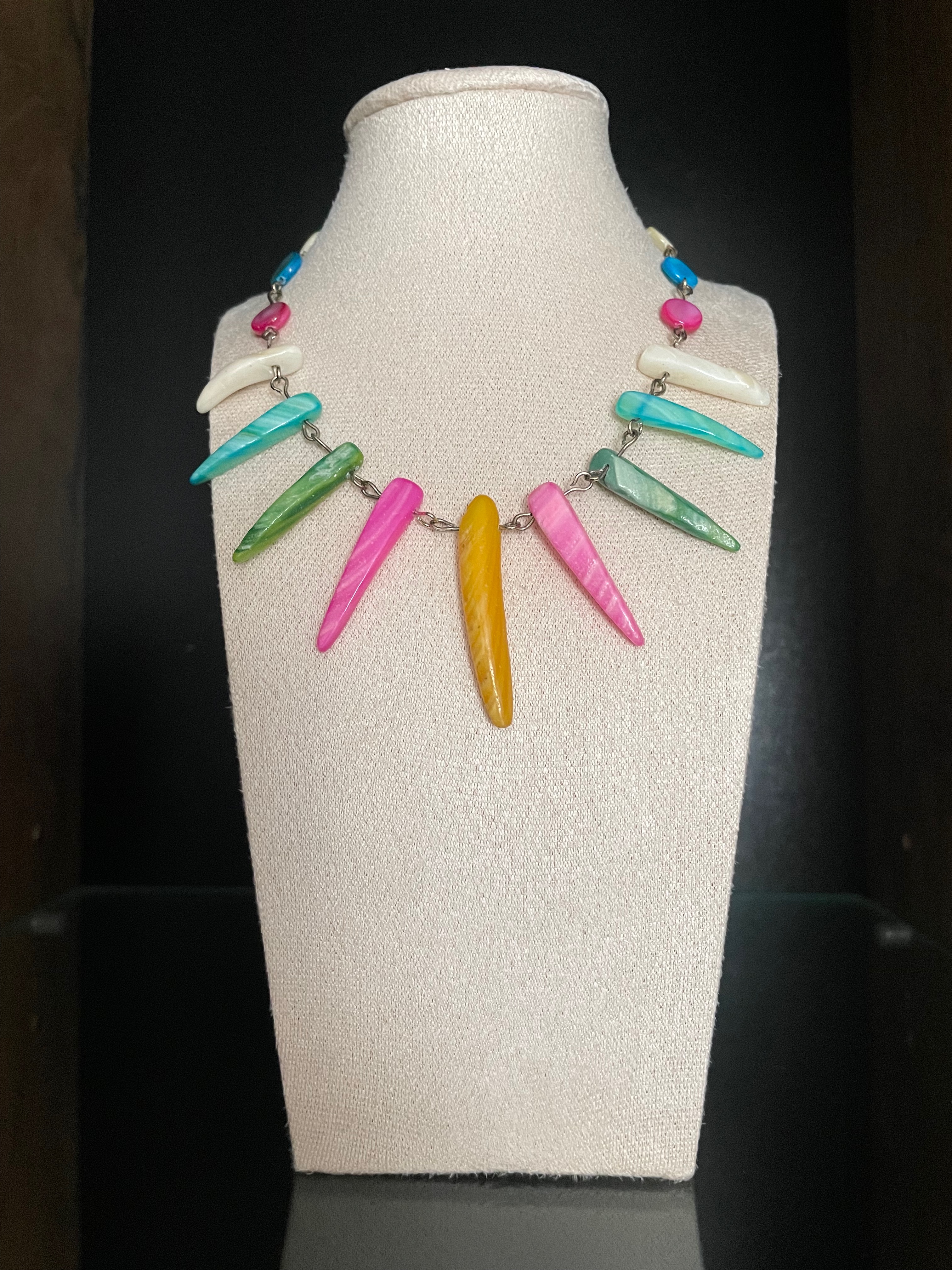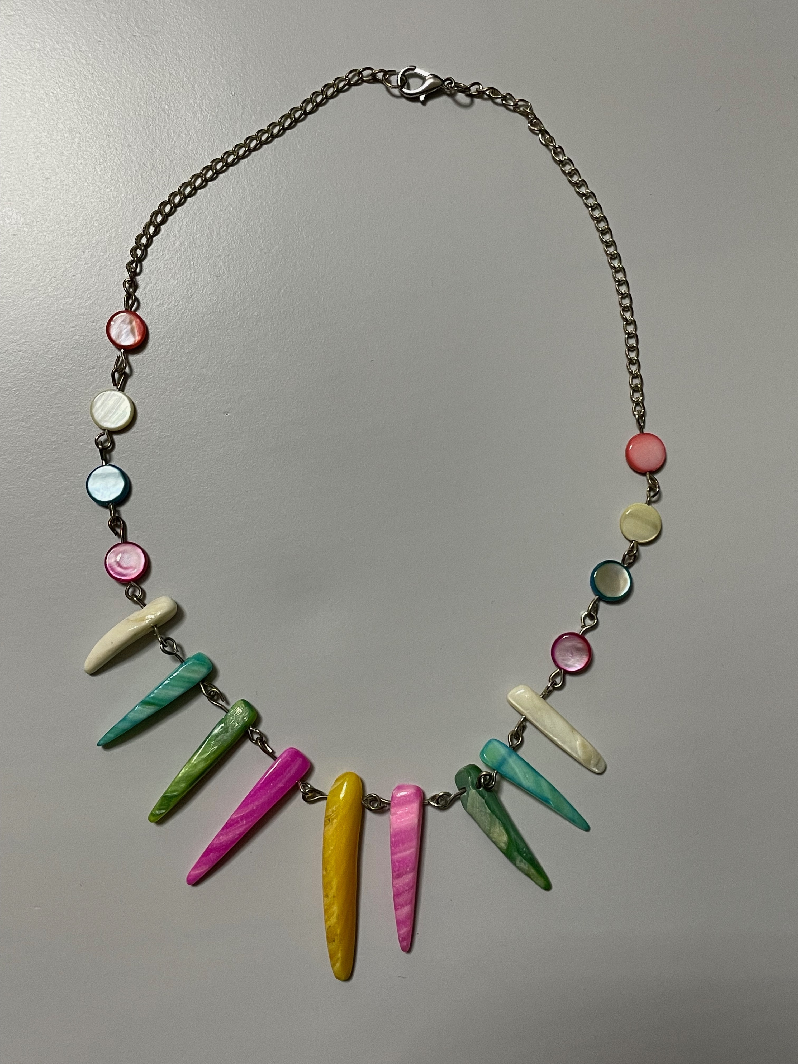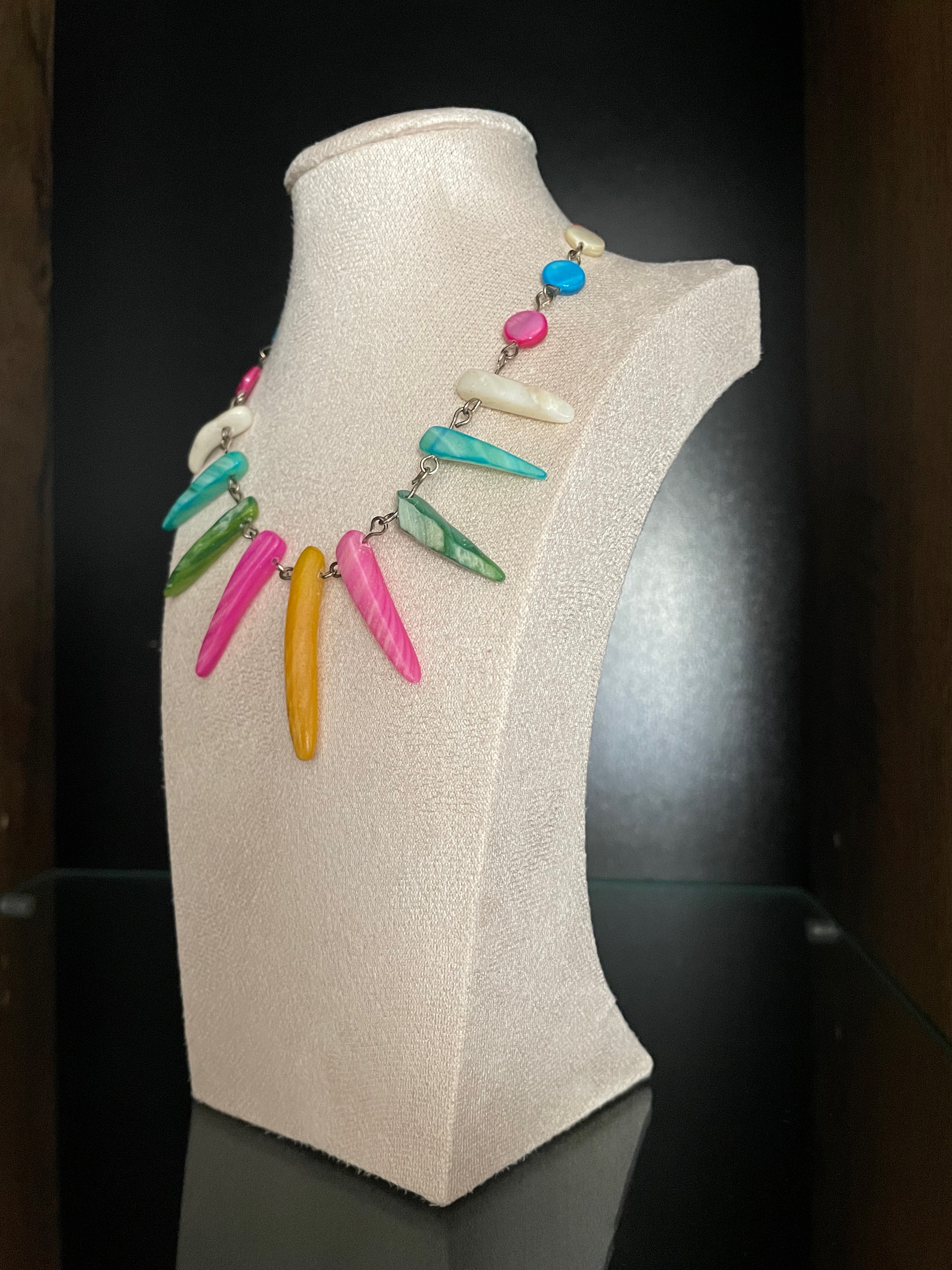 Colier statement realizat din elemente alungite de sidef, dispuse pe un lant metalic. Culorile intense - roz, galben, verde, albastru - ofera un aer exotic si modern, perfect pentru a completa orice tinuta cu o nota de originalitate.