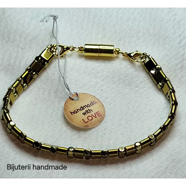 Această brățară unicat handmade este realizată din mărgele metalice de culoare aurie, cu un design elegant și modern. Este prevăzută cu un sistem de închidere magnetic, oferind un plus de confort și ușurință în utilizare. Aspectul sofisticat al brățării o face potrivită atât pentru ținute de zi, cât și pentru evenimente speciale. Este ambalată cu grijă într-un săculeț delicat, fiind ideală și ca idee de cadou. Alege o brățară versatilă și rafinată, creată cu dragoste pentru detalii!