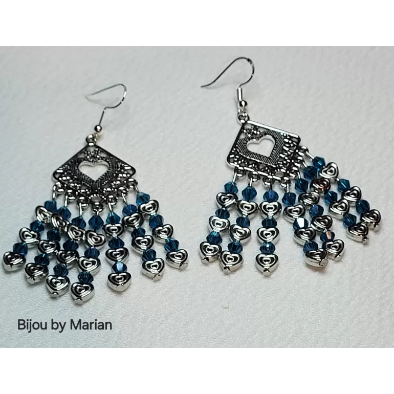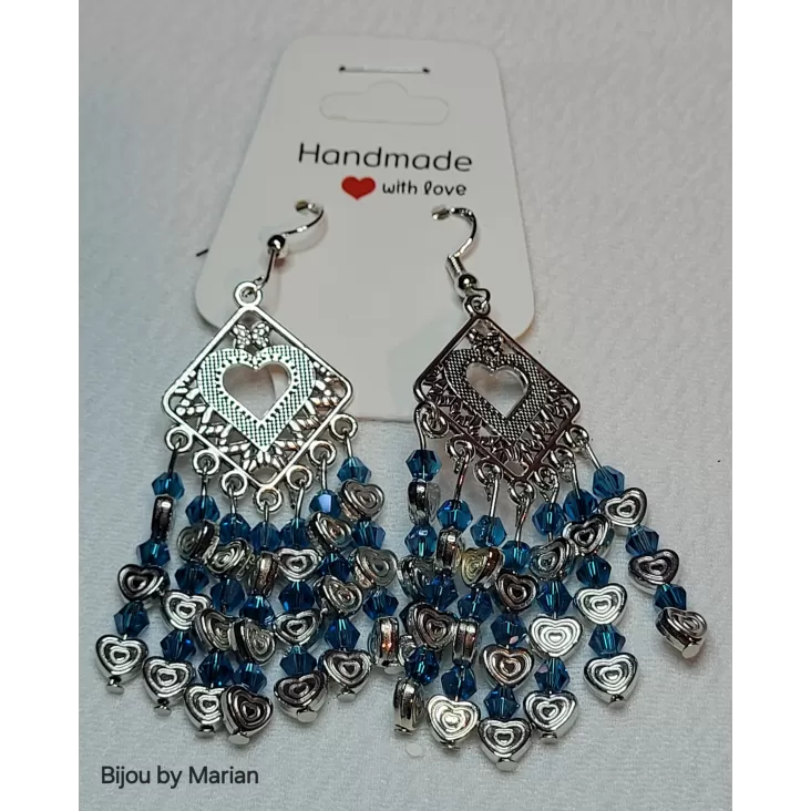 Cerceii handmade unicat „Bijou by Marian” sunt creați din materiale de calitate, cu detalii elegante ce includ mărgele albastre fațetate și charm-uri sub formă de inimioare din metal argintiu. Aceștia sunt realizați pe o bază delicată în formă de romb cu decupaj inimă, având un design de tip candelabru, perfect pentru a adăuga un plus de rafinament oricărei ținute. Livrarea se face într-un săculeț cadou deosebit, ideal pentru a fi dăruiți cu drag. Ideali pentru ocazii speciale sau pentru a transforma o zi obișnuită într-una plină de stil!