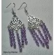 Acești cercei unicat handmade sunt creați cu măiestrie, având un design romantic și delicat. Realizați din elemente metalice cu motive filigranate și mărgele de sticlă în nuanțe de violet pastel, aceștia sunt alegerea perfectă pentru a accesoriza ținutele elegante sau casual-chic.