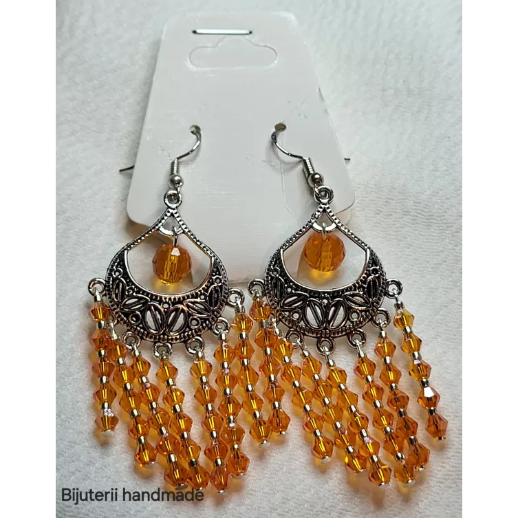 Cerceii unicat handmade tip candelabru sunt creați din materiale de calitate, având un design elegant și detalii rafinate. Sunt realizați din mărgele portocalii strălucitoare și accesorii metalice cu motive florale, oferind un aspect sofisticat și boem. Ideali pentru ocazii speciale sau pentru a adăuga o notă de eleganță unei ținute casual, acești cercei sunt livrați într-un săculeț delicat, perfect pentru cadouri. Alege să porți sau să oferi bijuterii unicat care să reflecte personalitatea și stilul!