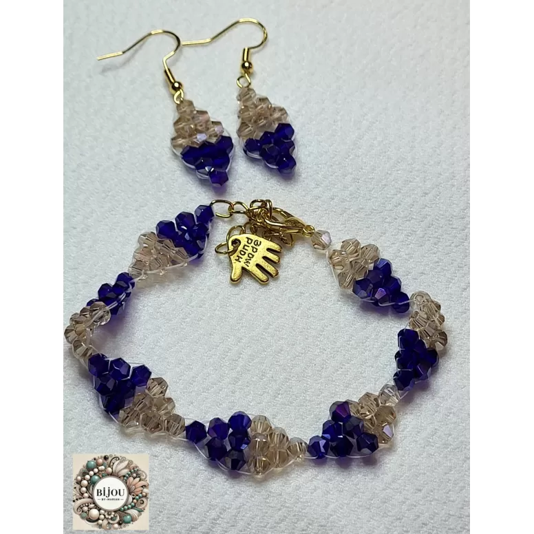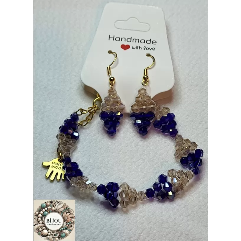 Acest set de cercei și brățară handmade, realizat manual cu grijă și atenție la detalii, combină armonios mărgele de cristal în nuanțe de albastru regal și champagne. Designul său sofisticat aduce un plus de strălucire și rafinament oricărei ținute, fie că este vorba de o ocazie specială sau un outfit de zi cu zi.