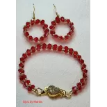 Acest set elegant și rafinat, realizat manual, este compus dintr-o brățară delicată și o pereche de cercei rotunzi, ambele lucrate cu grijă din mărgele fațetate de cristal în nuanțe vibrante de roșu, completate de detalii aurii.