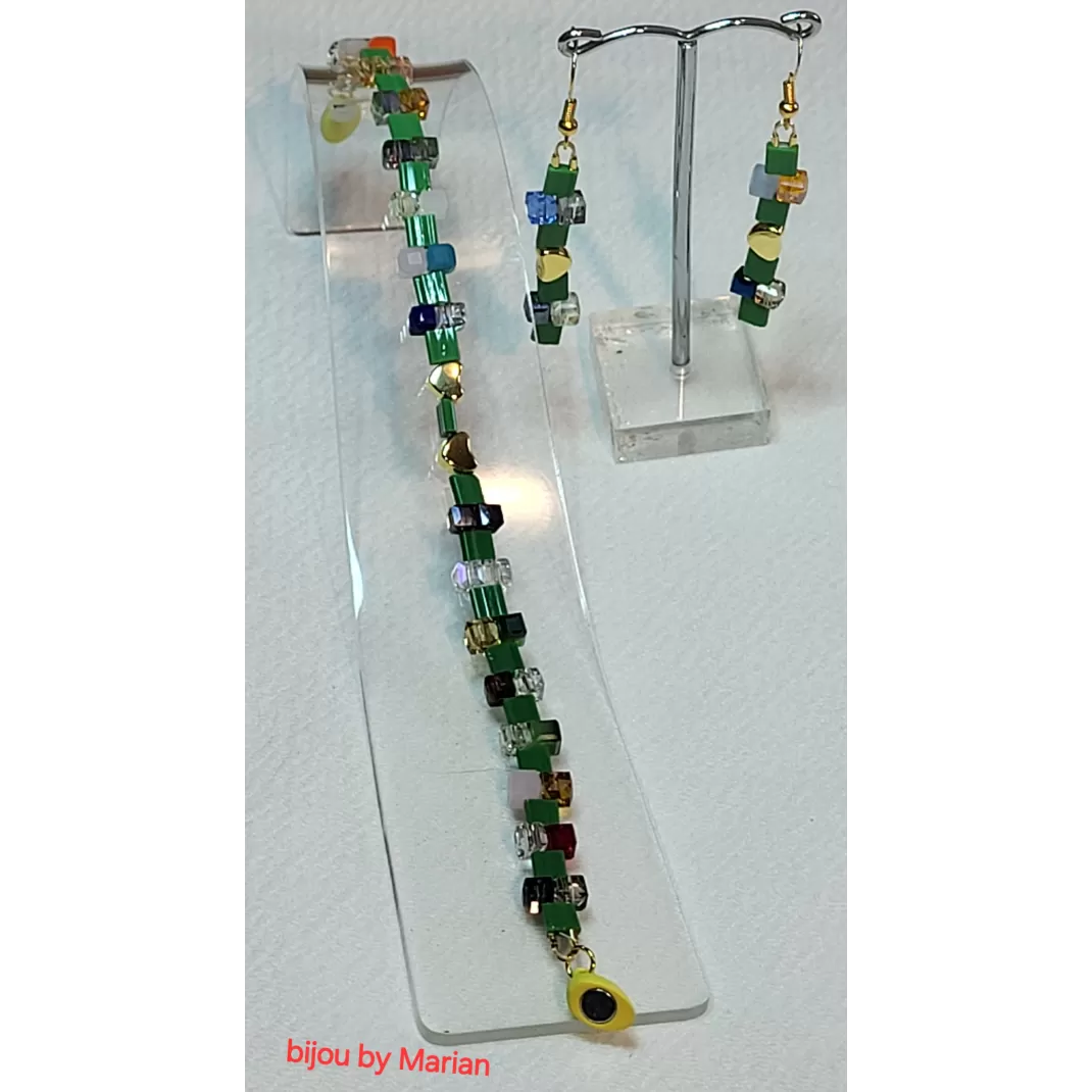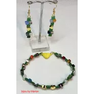 - Designul brățării include mărgele tila verzi, alternate cu cuburi transparente și colorate în nuanțe vibrante precum albastru, roșu, maro și auriu.