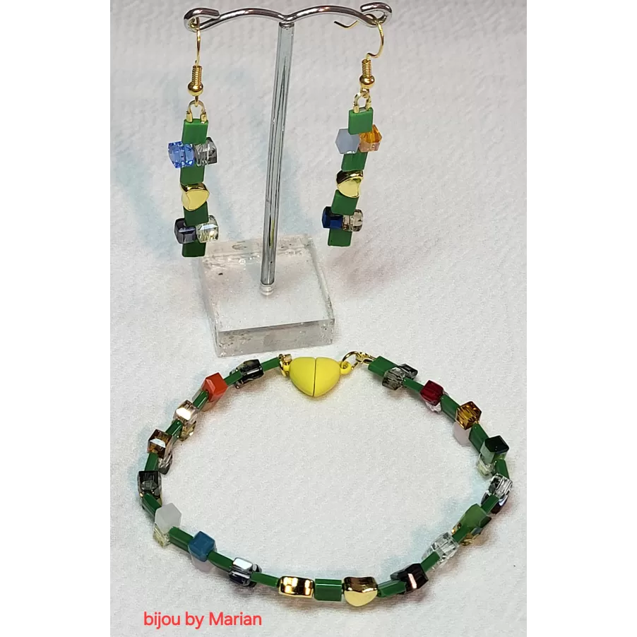 Acest set de bijuterii unicat handmade este compus dintr-o brățară și o pereche de cercei, realizate dintr-o combinație armonioasă de mărgele geometrice și elemente metalice aurii, ce oferă un aspect modern și elegant.
