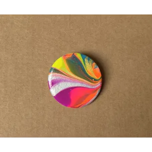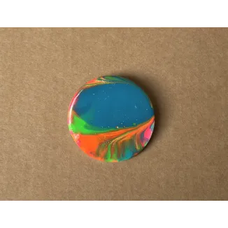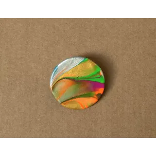 Brosa rotunda realizata din lut si vopsea. Brosa este lacuita cu vernis. Prinderea se face cu ac de brosa din inox. Diametru: 3,3 cm. A se depozita intr-un loc inchis, ferit de razele directe ale soarelui, departe de obiecte grele sau ascutite care ar putea deteriora brosa.