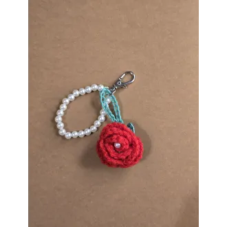 Breloc cu trandafir crosetat, cu perla in mijloc și cu șirag de perle atasat. Prindere cu carabina
