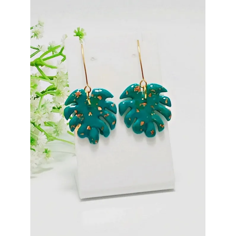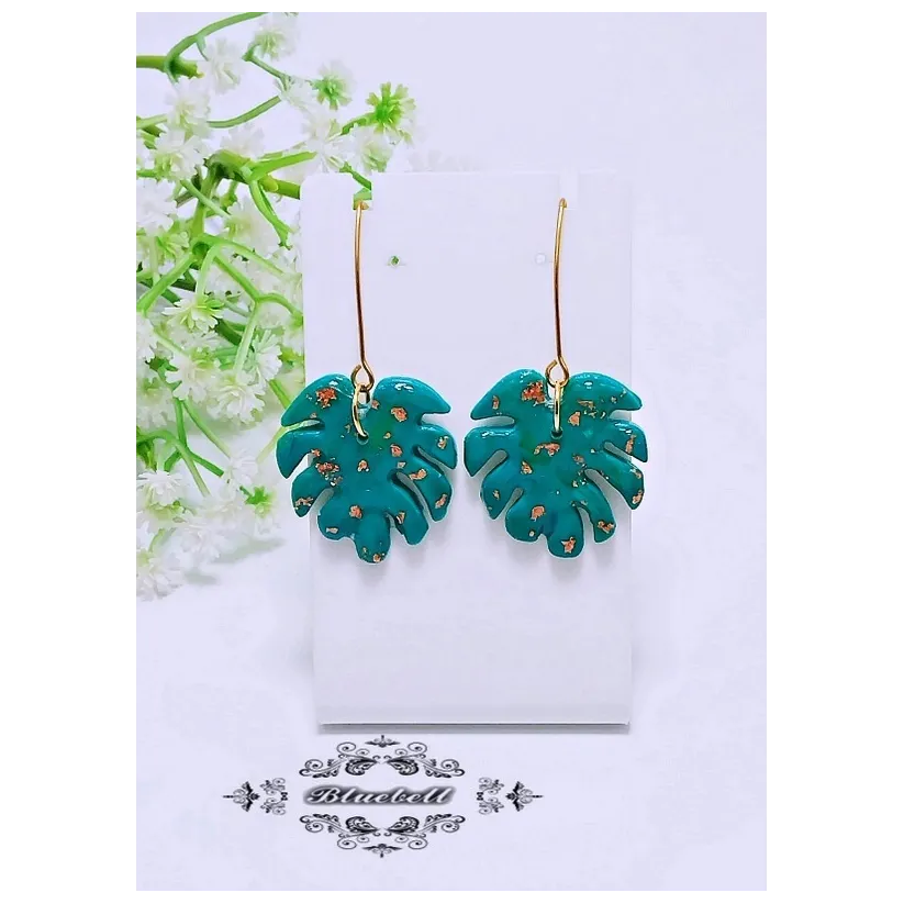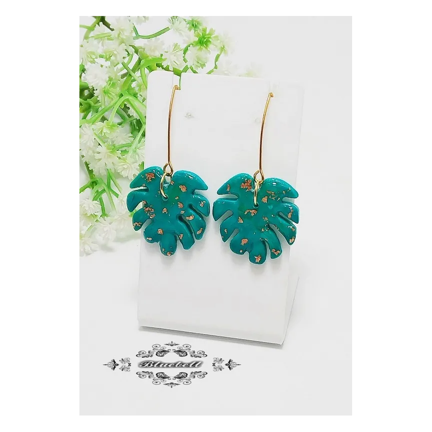 Cercei lucrati manual din lut polimeric si rășină, cu elemente metalice aurii din oțel inoxidabil.