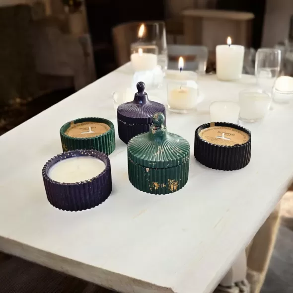 Lumanare parfumata din 100% ceara naturala de soia, in bol din ceramica cu capac handmade*, sigilat cu lac special pentru utilizare in fabricarea lumanarilor.