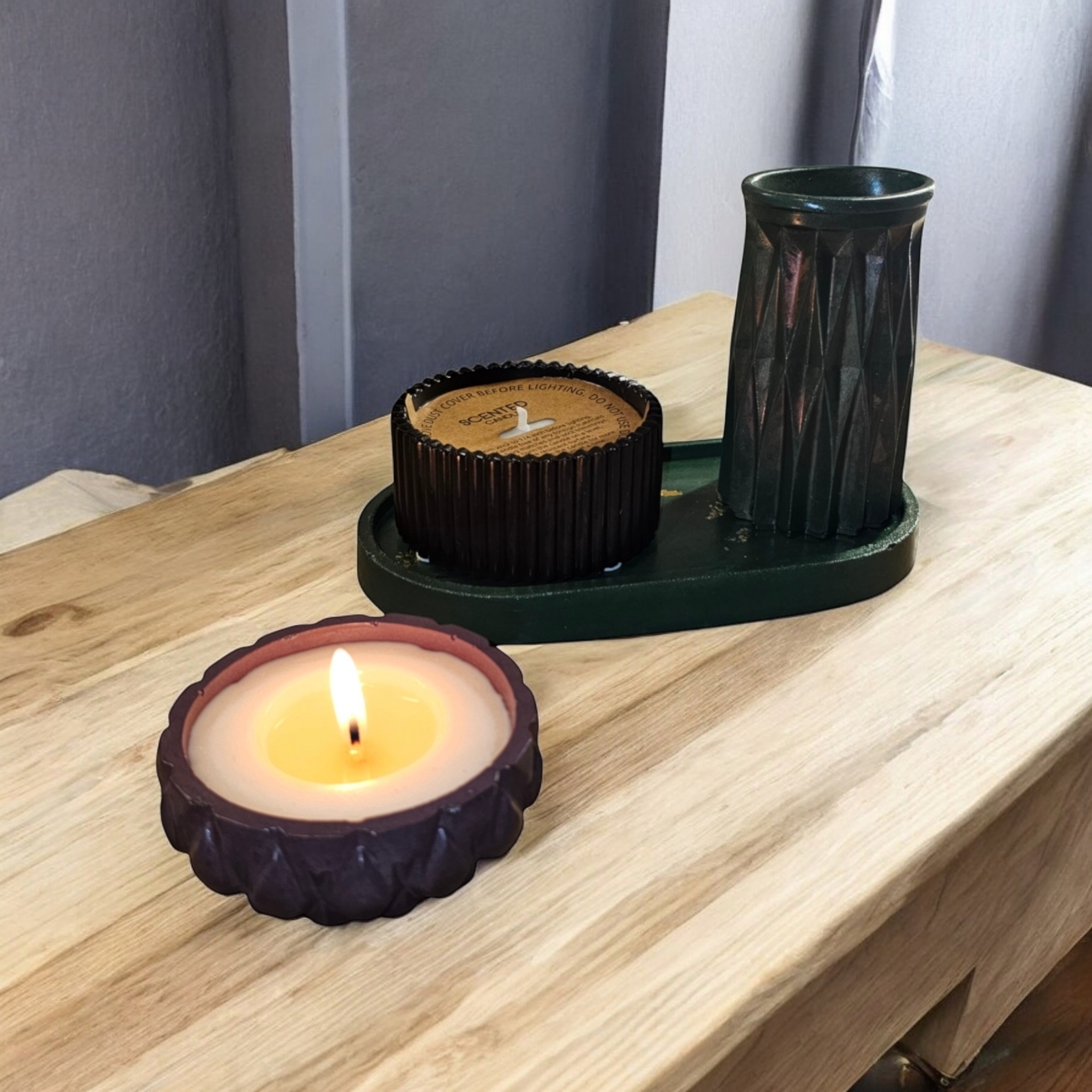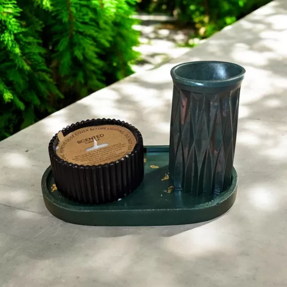*Vasul din ceramica este realizat manual si poate fi personalizat, la cerere, in culori precum rosu, albastru, verde, alb, galben, portocaliu, negru, maro si nuante derivate. Timpul de realizare a recipientului este de aproximativ 5 zile (turnare, uscare, slefuire, sigilare waterproof cu minim 2 straturi de lac), la care se adauga timpul de maturare a lumanarii parfumate (recomandat este minim 14 zile).