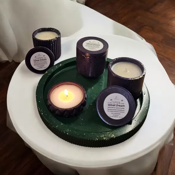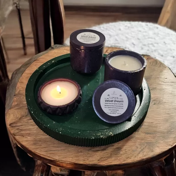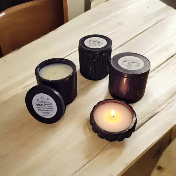 Lumanare parfumata din 100% ceara naturala de soia, in pahar din ceramica cu capac handmade*, sigilat cu lac special pentru utilizare in fabricarea lumanarilor.