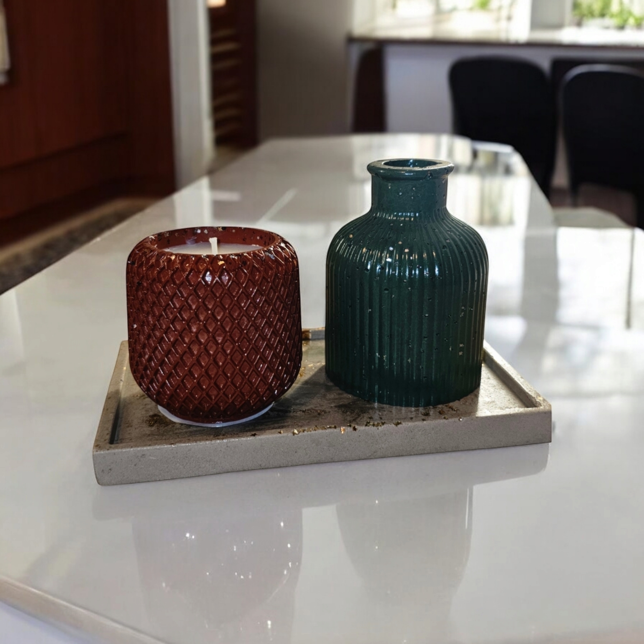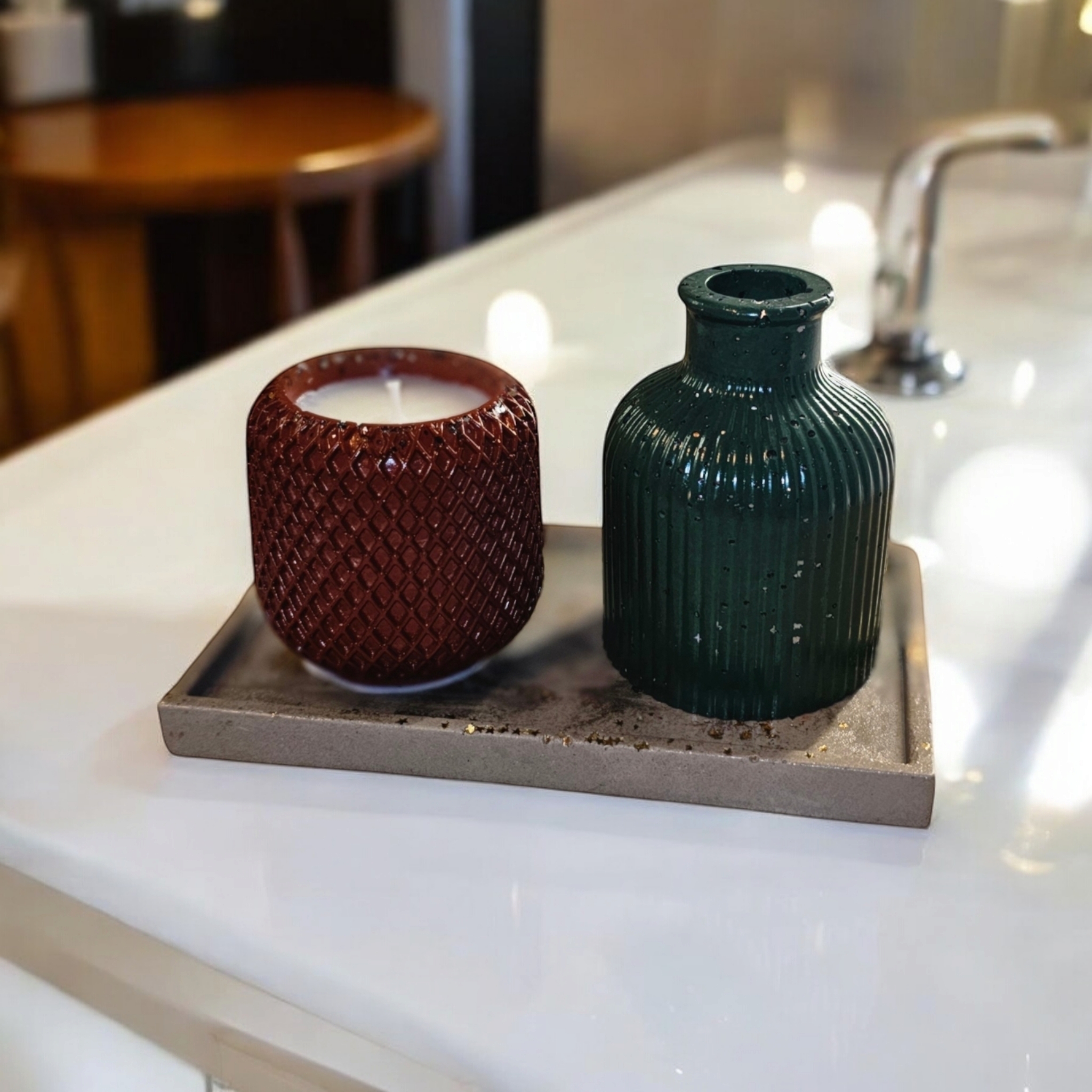 *Vasul din ceramica este realizat manual si poate fi personalizat, la cerere, in culori precum rosu, albastru, verde, alb, galben, portocaliu, negru, maro si nuante derivate. Timpul de realizare a recipientului este de aproximativ 5 zile (turnare, uscare, slefuire, sigilare waterproof cu minim 2 straturi de lac), la care se adauga timpul de maturare a lumanarii parfumate (recomandat este minim 14 zile).