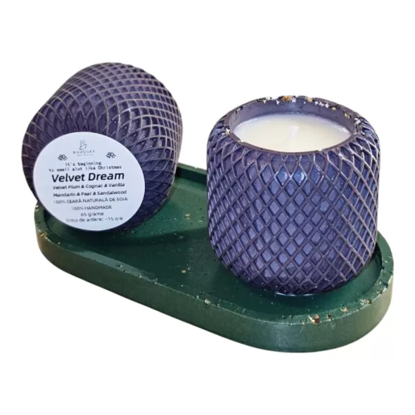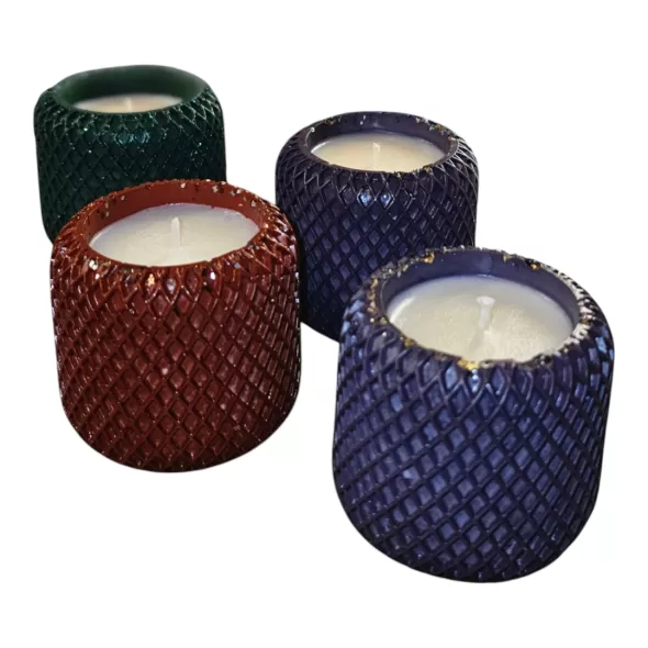 Lumanare parfumata din 100% ceara naturala de soia, in pahar mic cu detalii romburi din ceramica handmade