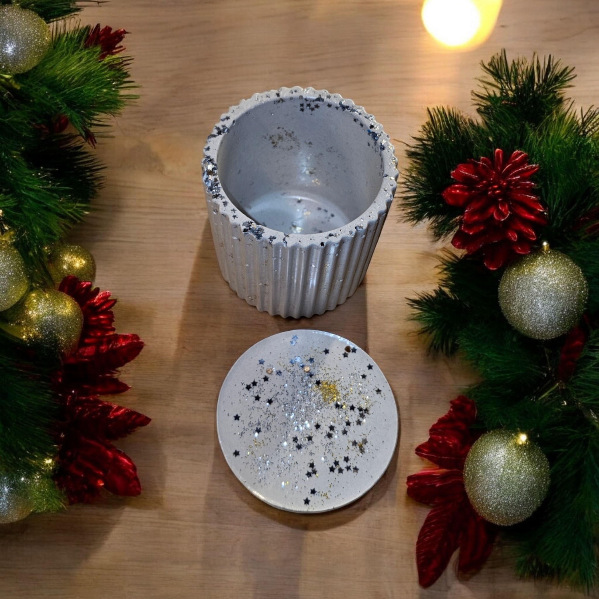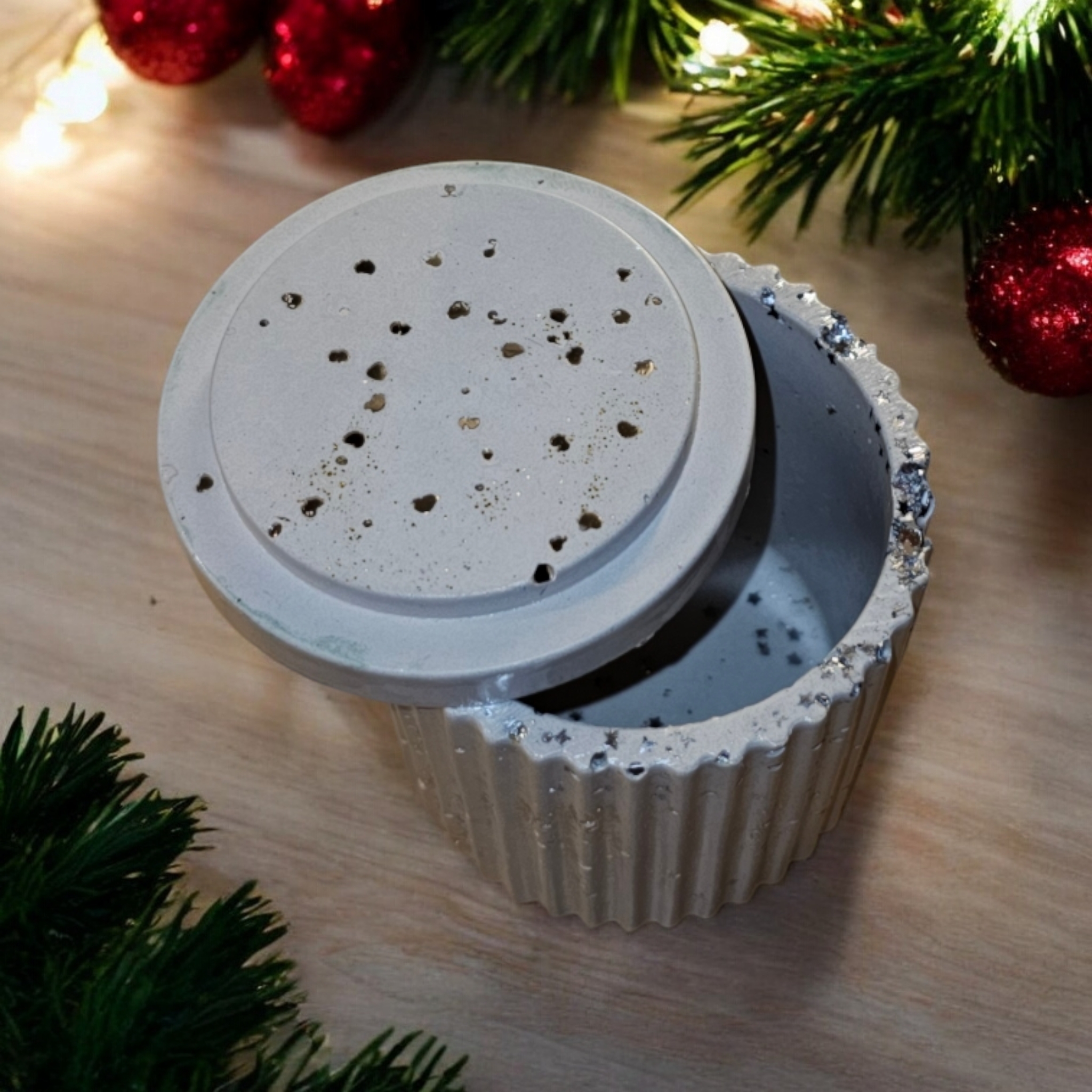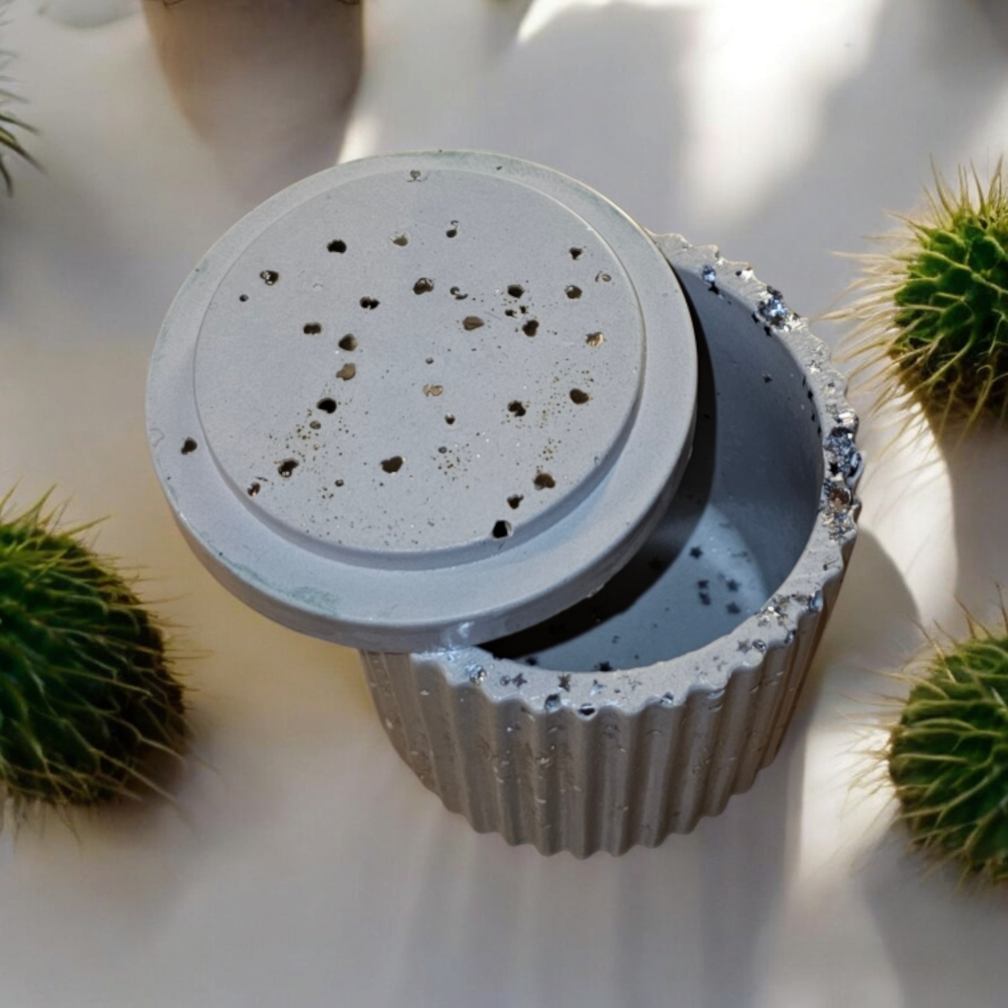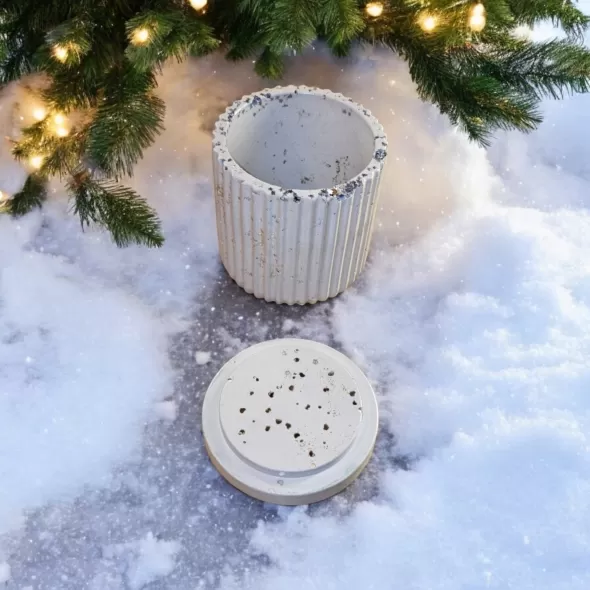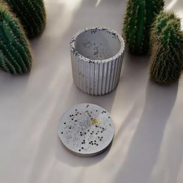 Pahar decorativ din ceramica, cu detalii striate la exterior, turnat manual, cu capac, sigilat cu lac waterproof.
