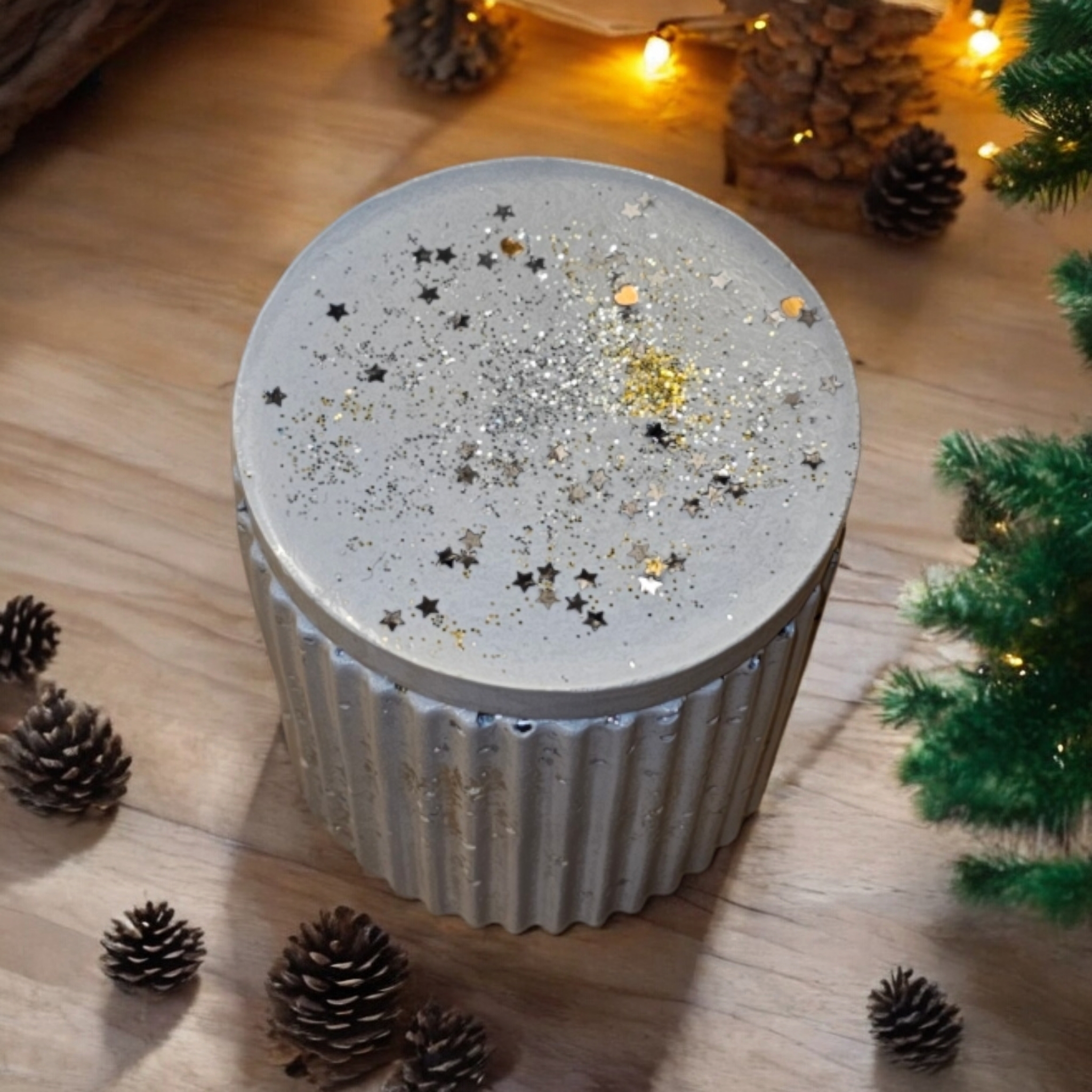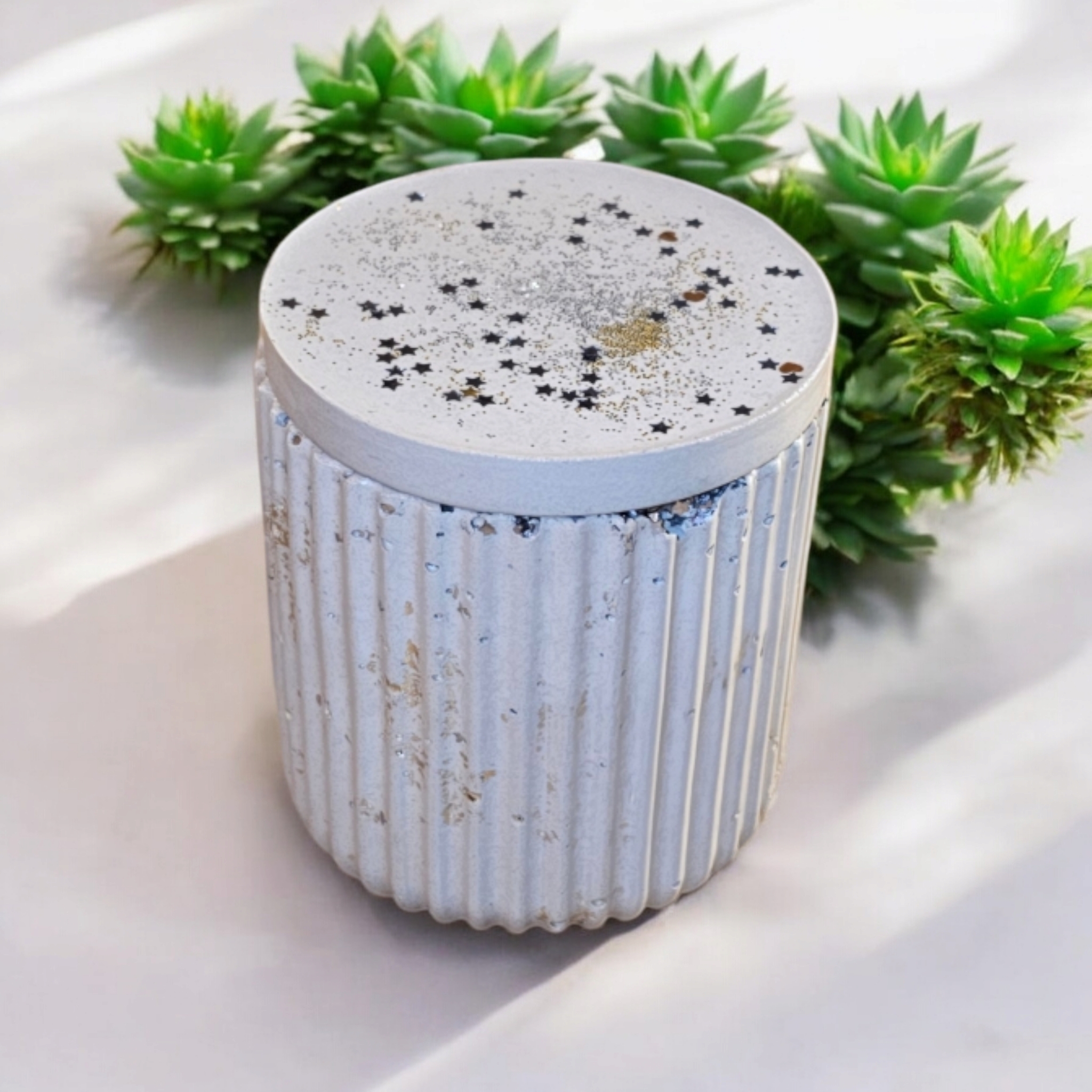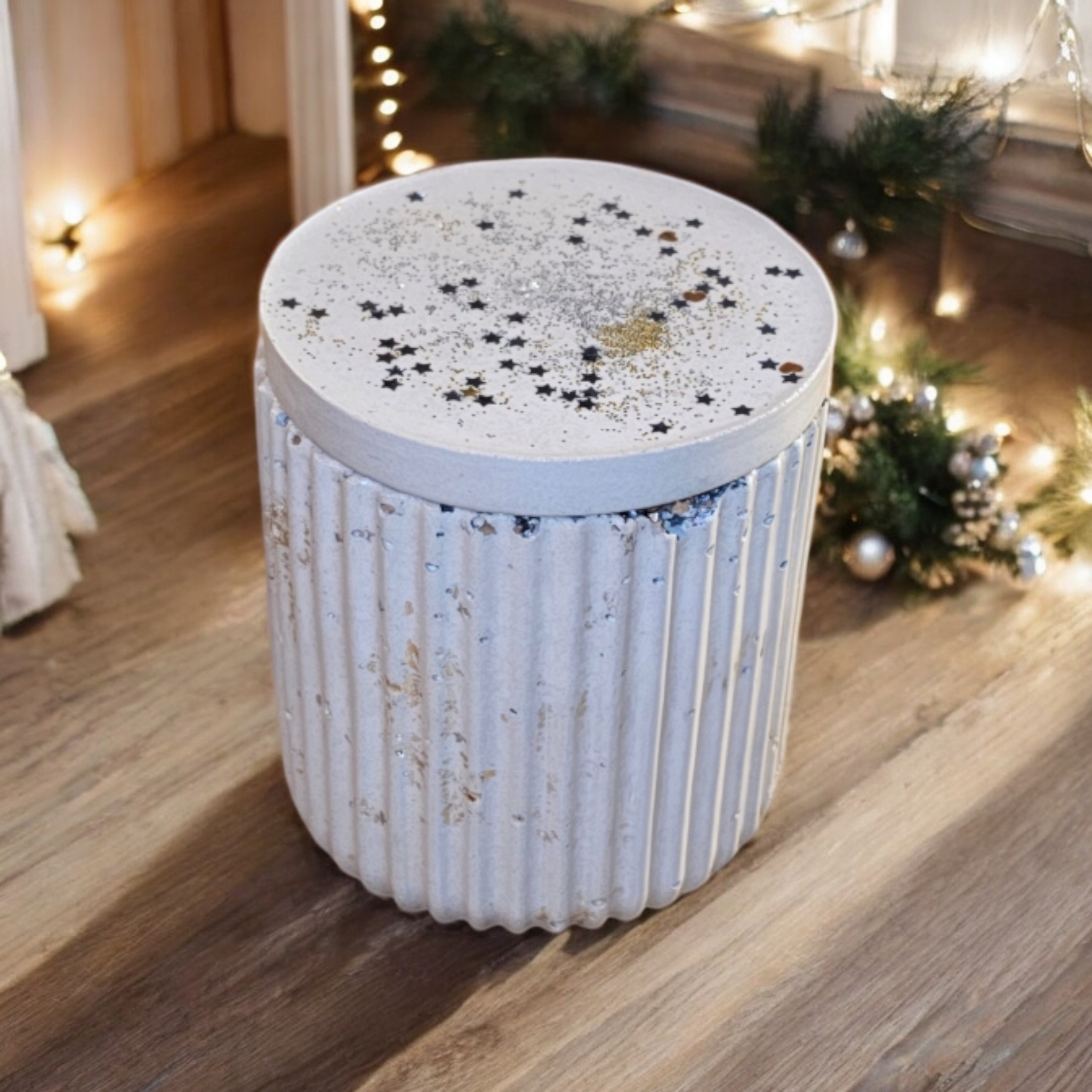 Pahar decorativ din ceramica, cu detalii striate la exterior, turnat manual, cu capac, sigilat cu lac waterproof.