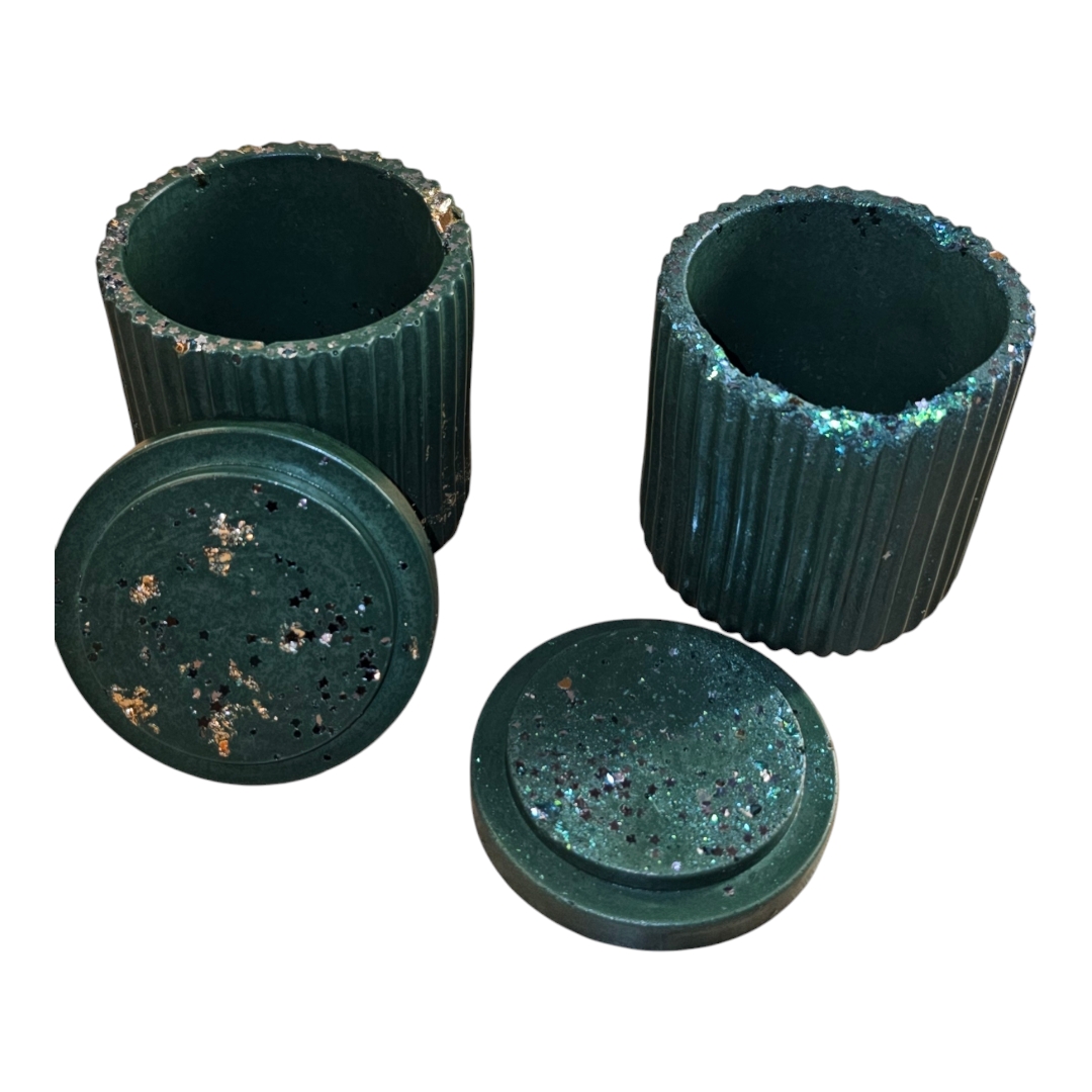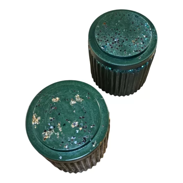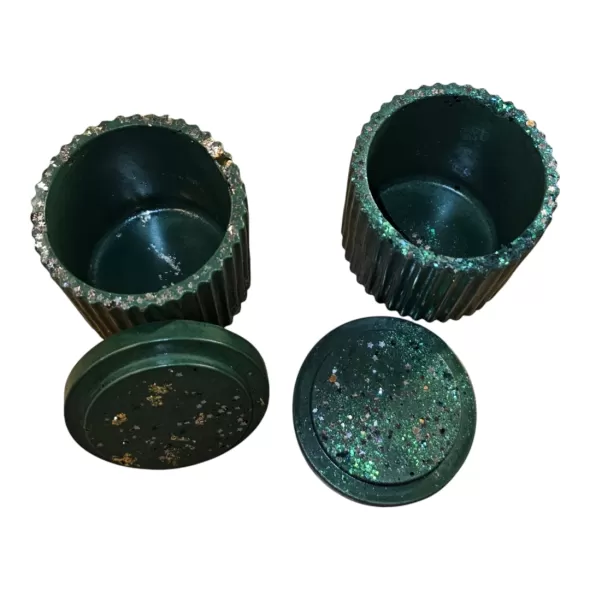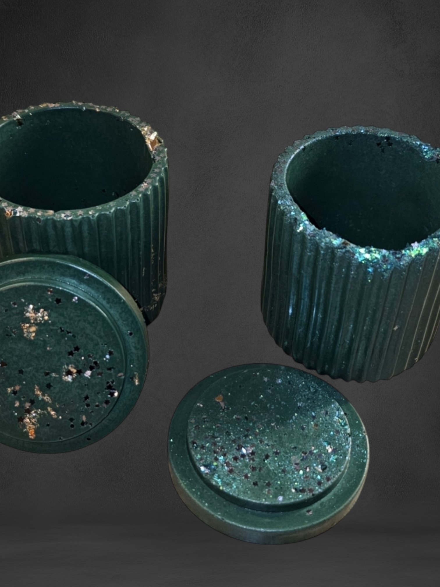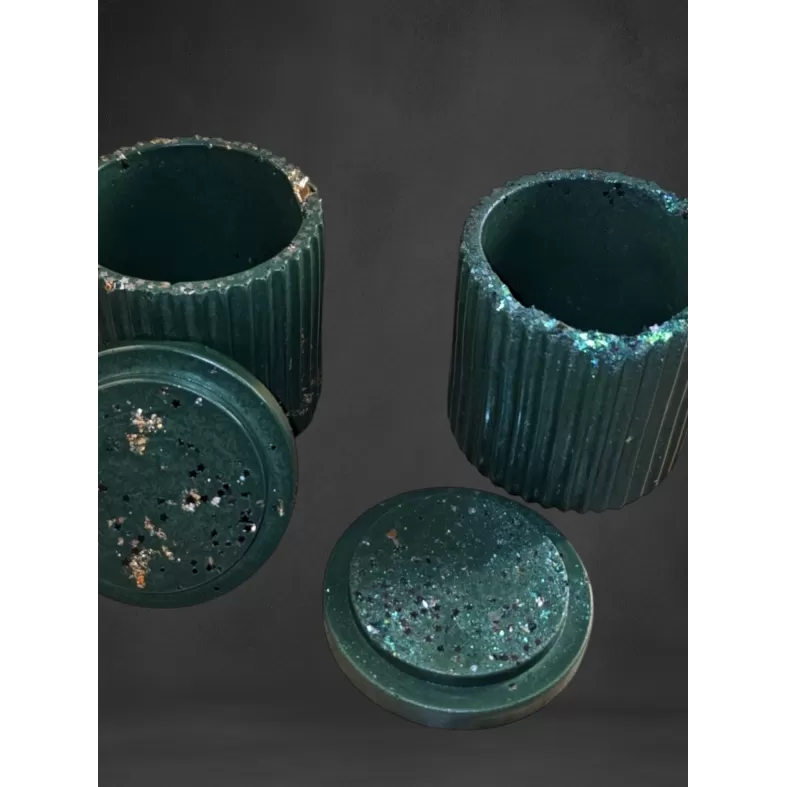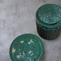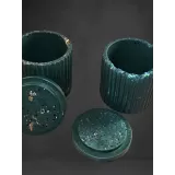 Pahar decorativ din ceramica, cu detalii striate la exterior, turnat manual, cu capac, sigilat cu lac waterproof.