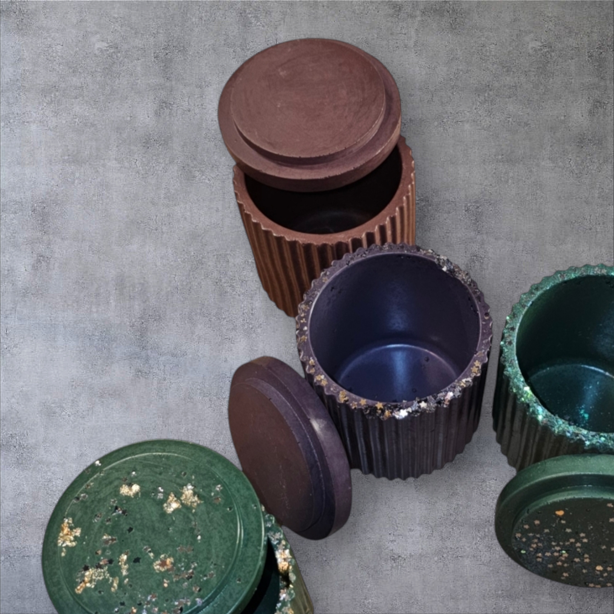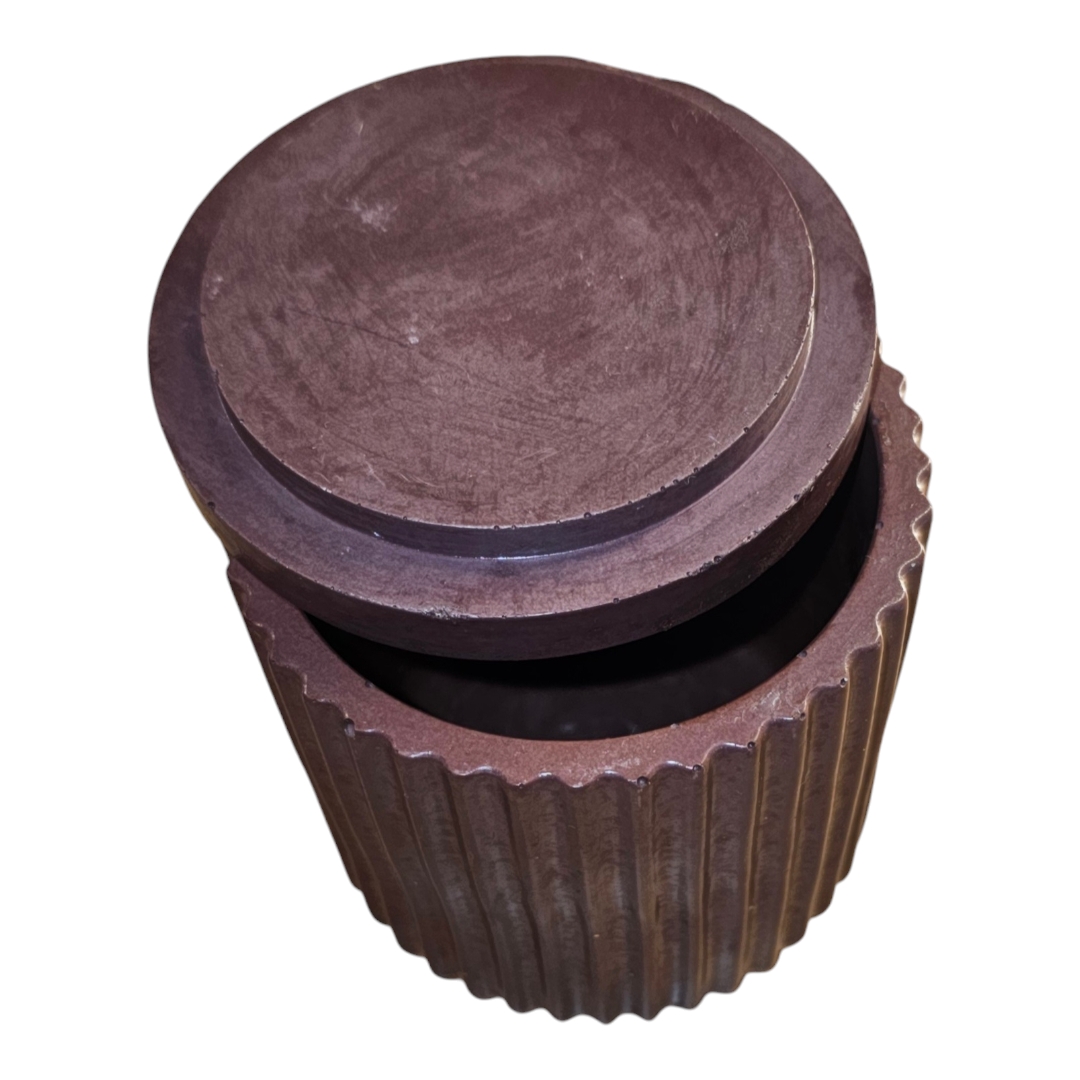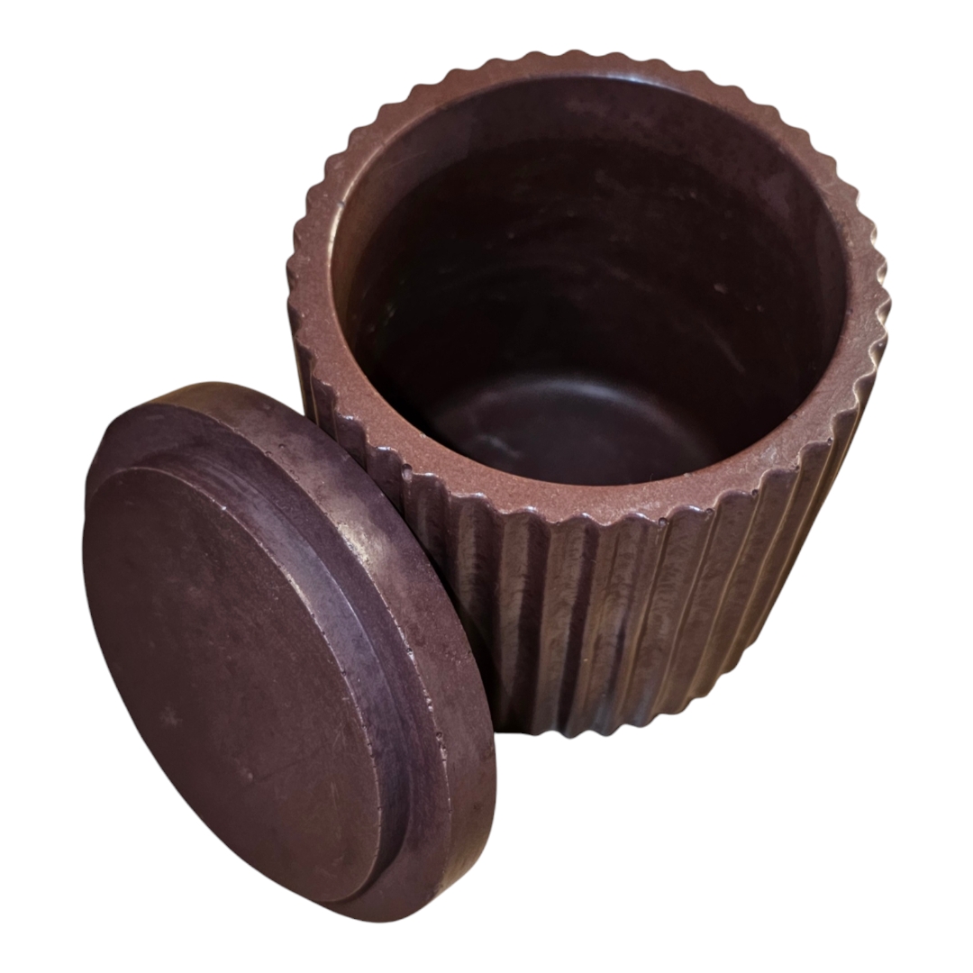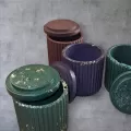 Pahar decorativ din ceramica, cu detalii striate la exterior, turnat manual, cu capac, sigilat cu lac waterproof.