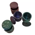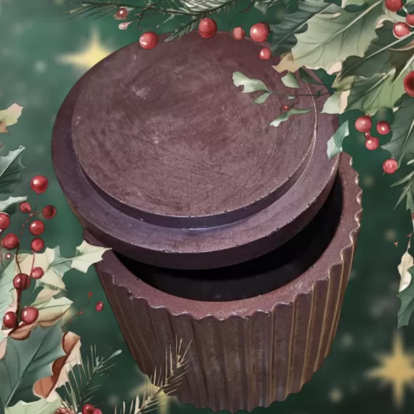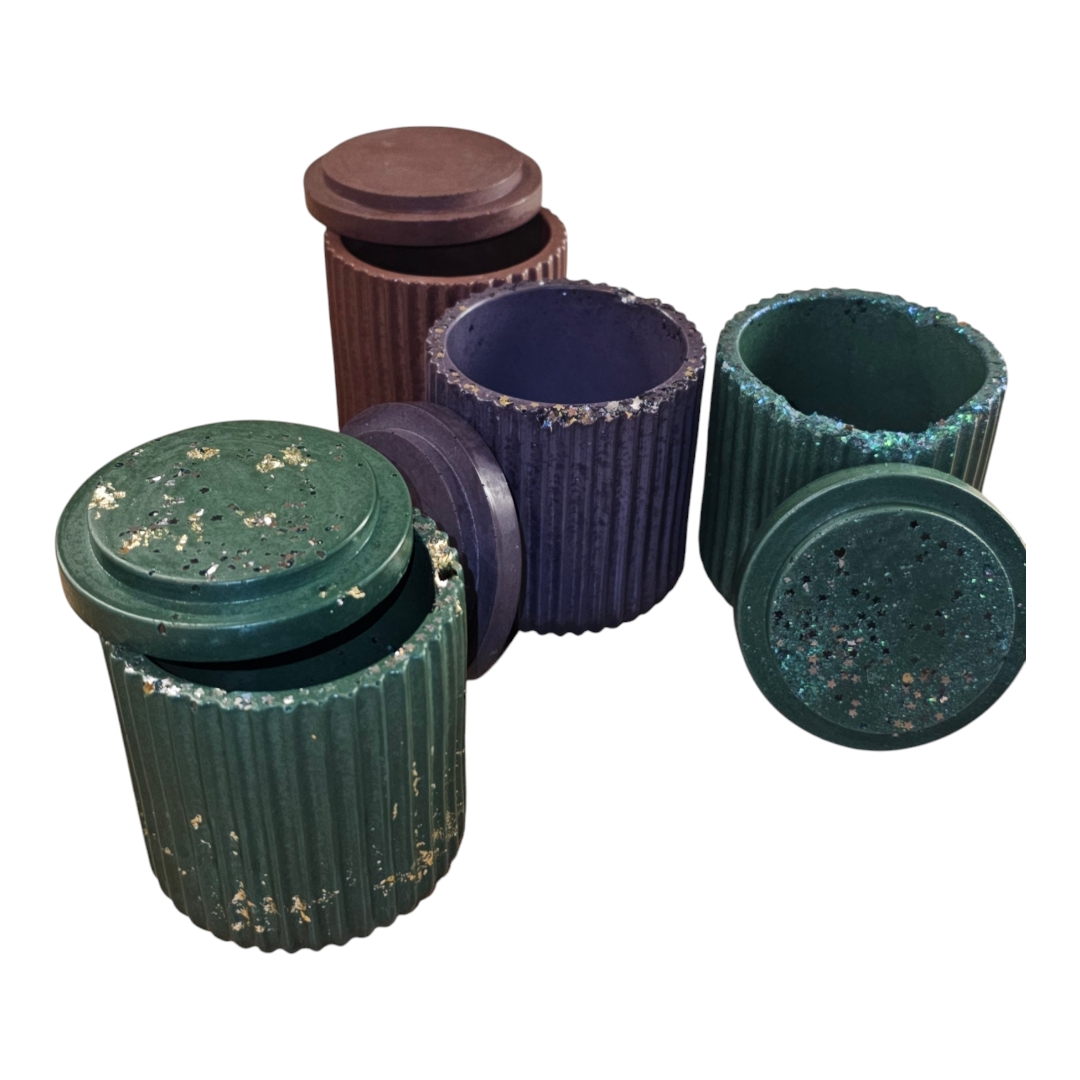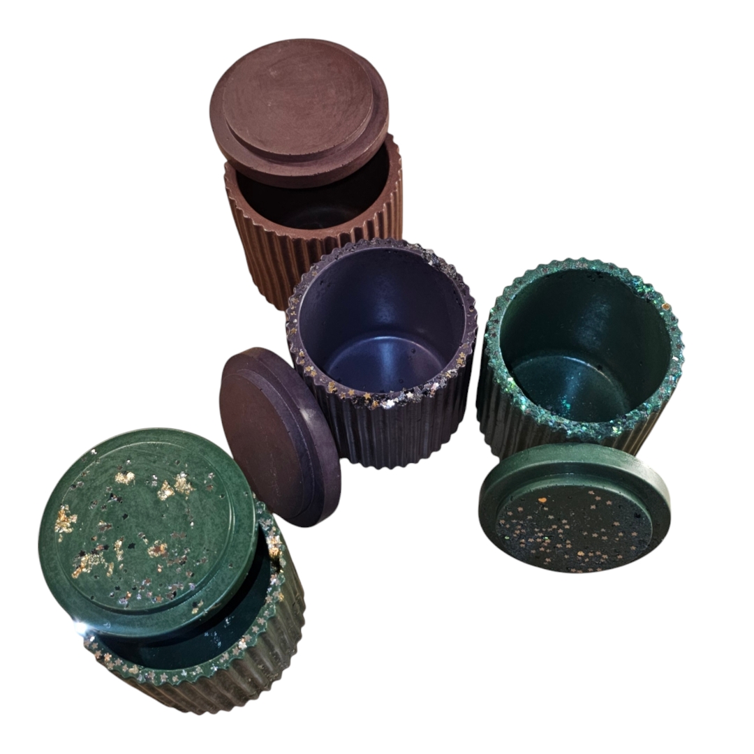 Pahar decorativ din ceramica, cu detalii striate la exterior, turnat manual, cu capac, sigilat cu lac waterproof.