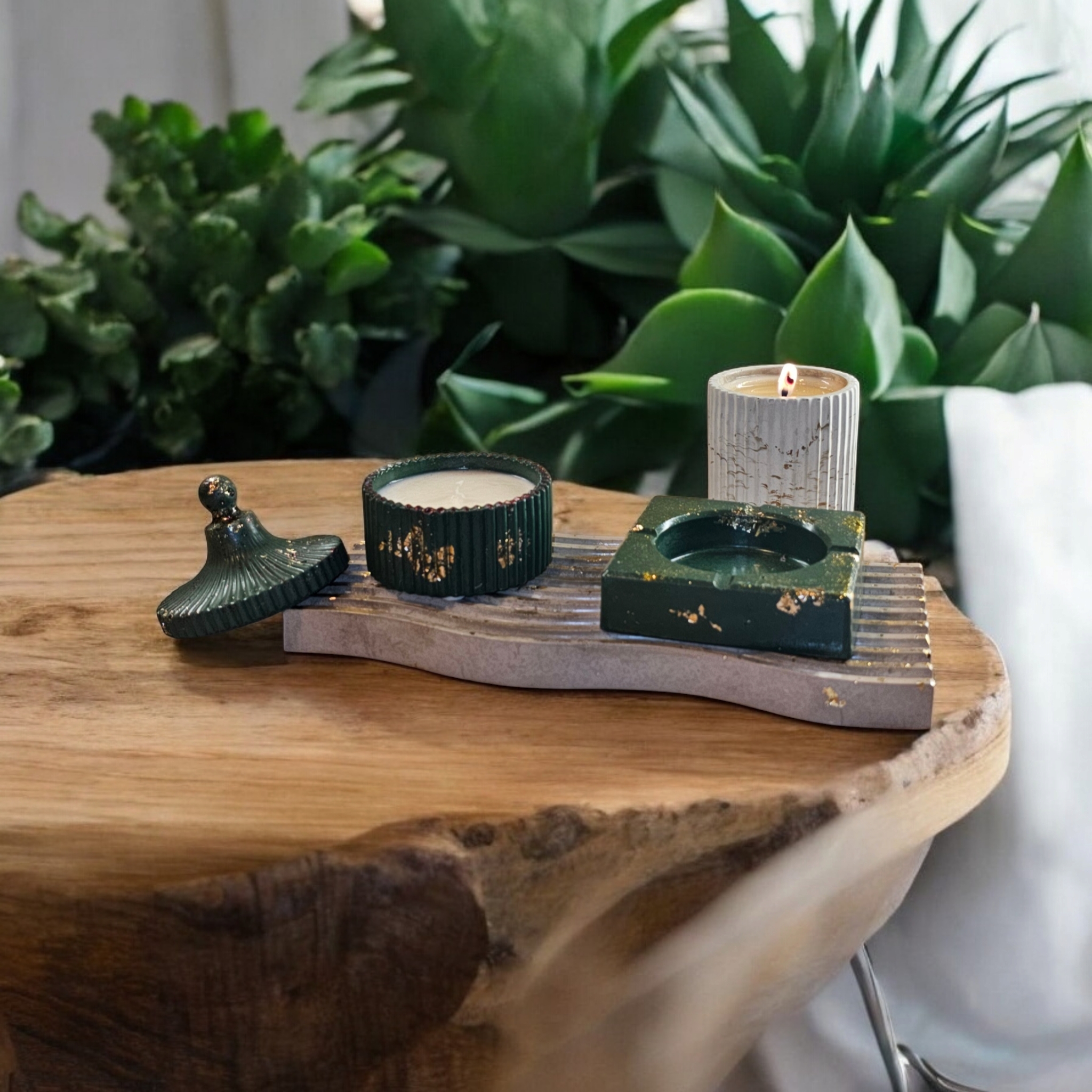 * 1 x Scrumiera eleganta din ceramica handmade, a carei culoare va fi in functie de culoarea recipientului lumanarii, care depinde de parfumul ales (conform imaginilor)