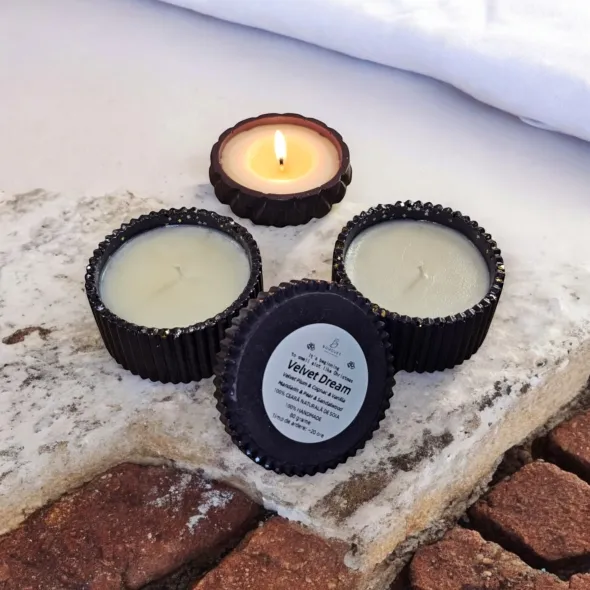 * 1 x Lumanare parfumata in bol mic din ceramica handmade cu capac, 80 grame (parfum la alegere din cele de mai jos, pe care il veti mentiona in casuta "Personalizeaza produsul" )